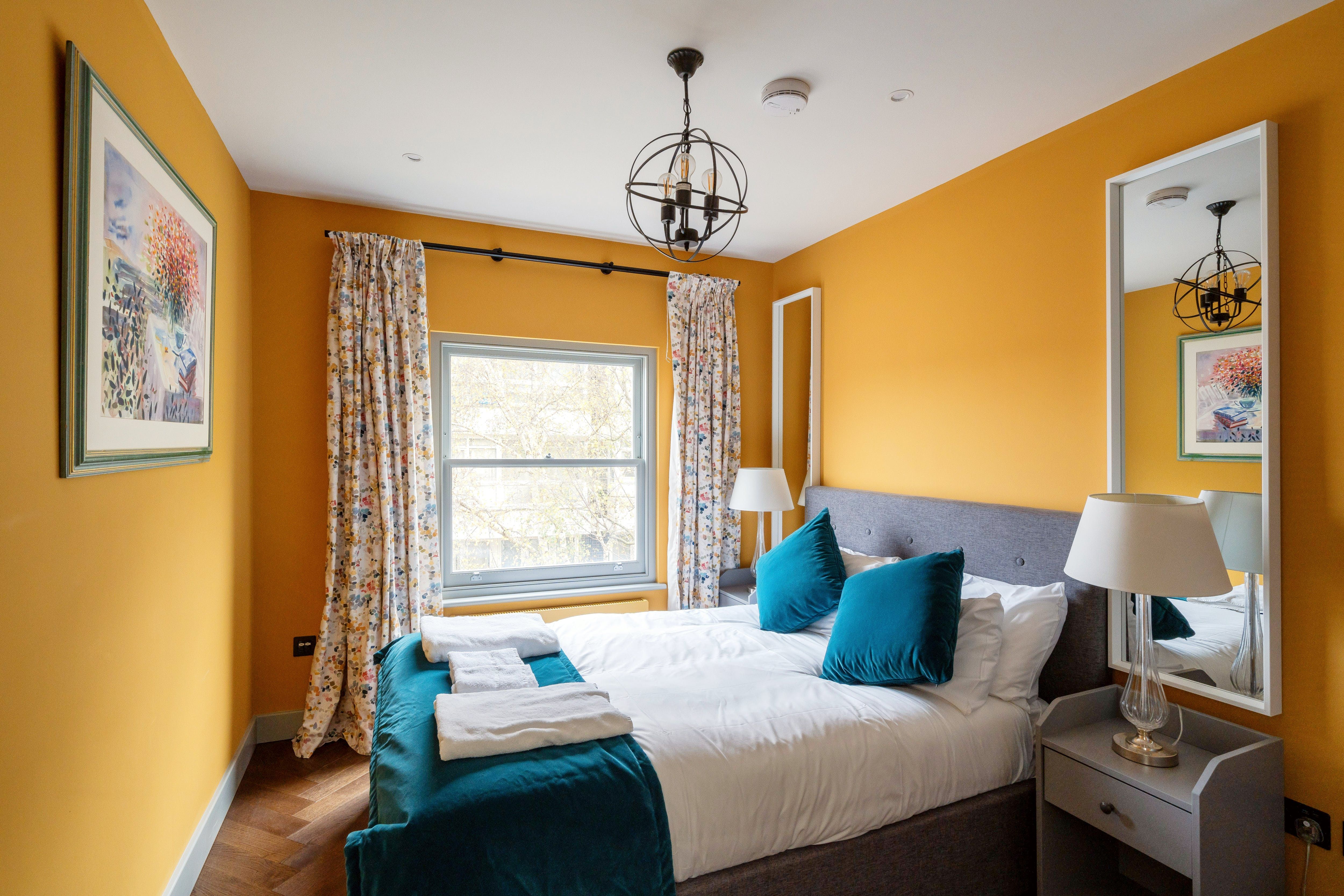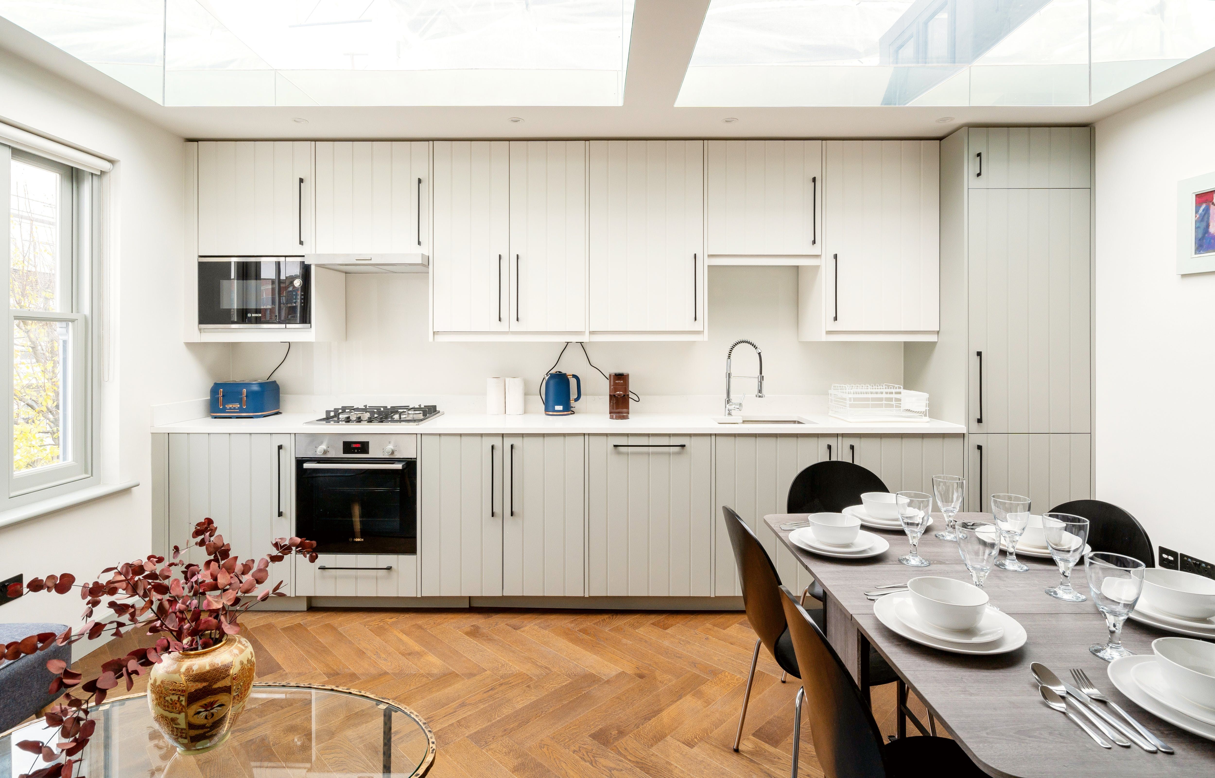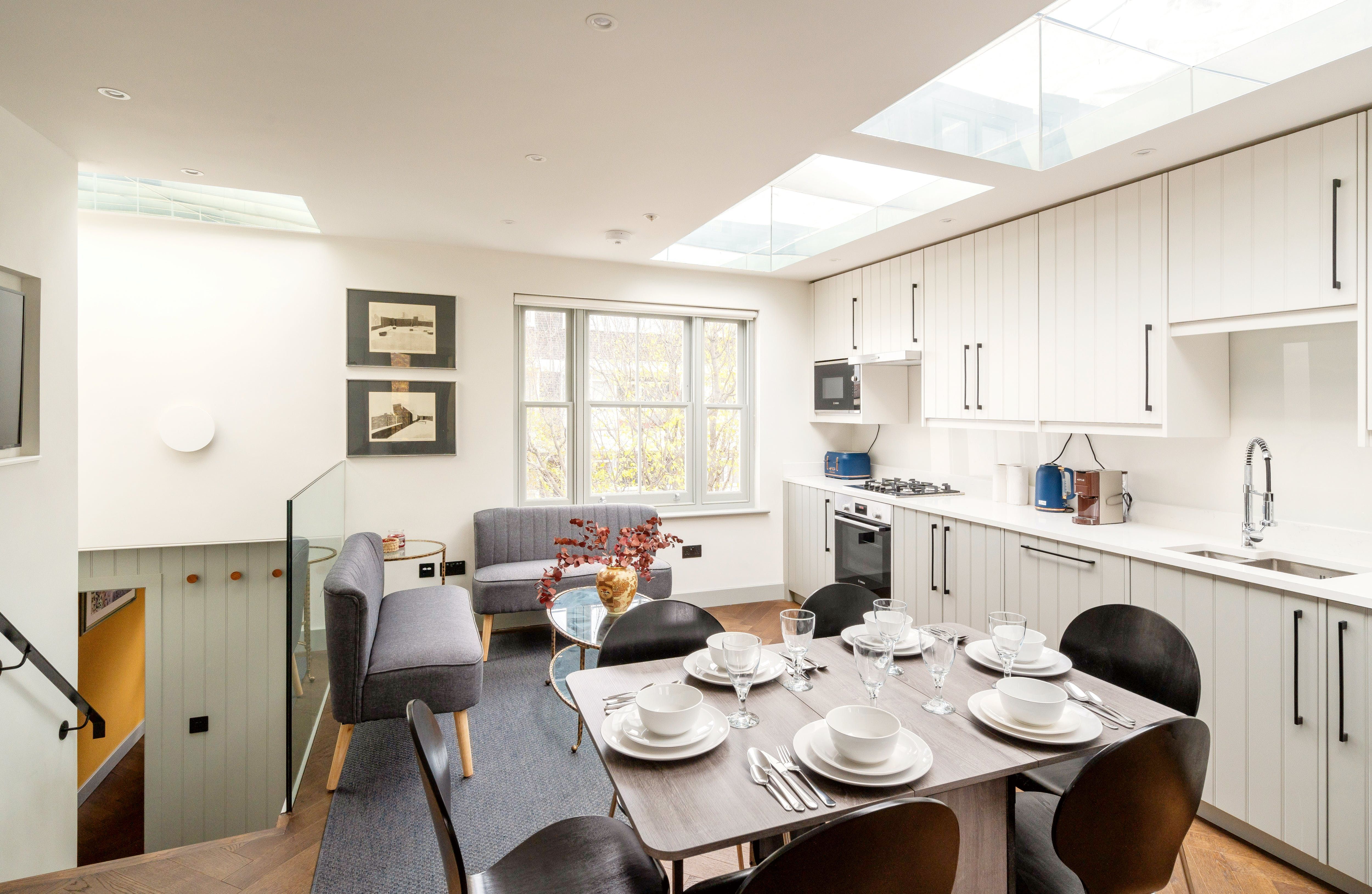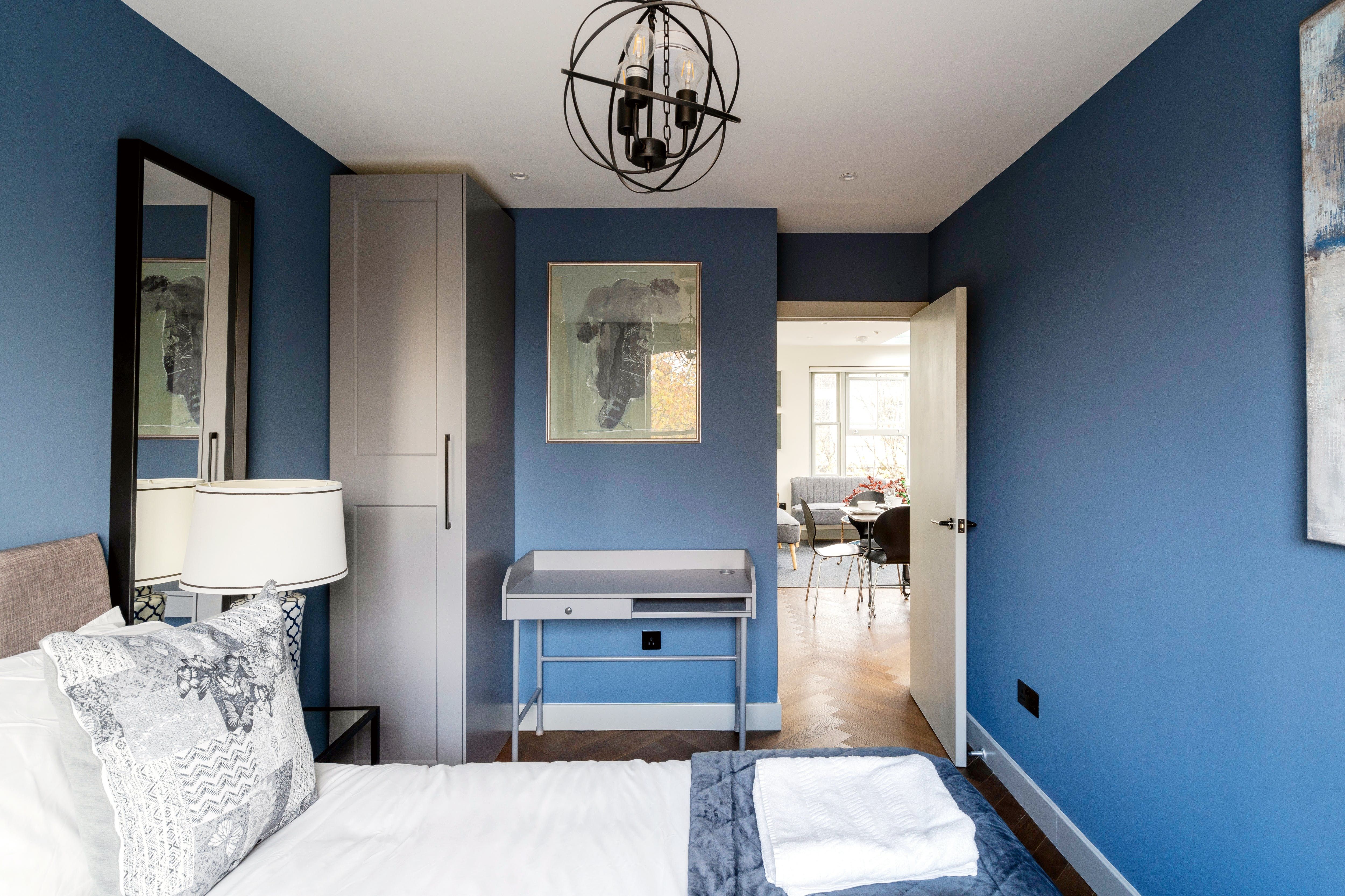 As you enter the flat, you're greeted with an open-plan kitchen and dining area that boasts an expansive skylight, allowing an abundance of natural light to flood the space. Elsewhere, the bedrooms are all generously sized and offer a peaceful retreat from the hustle and bustle of the city, thanks to the soothing sage green, tranquil blue, and vibrant yellow colour schemes in each of the rooms.