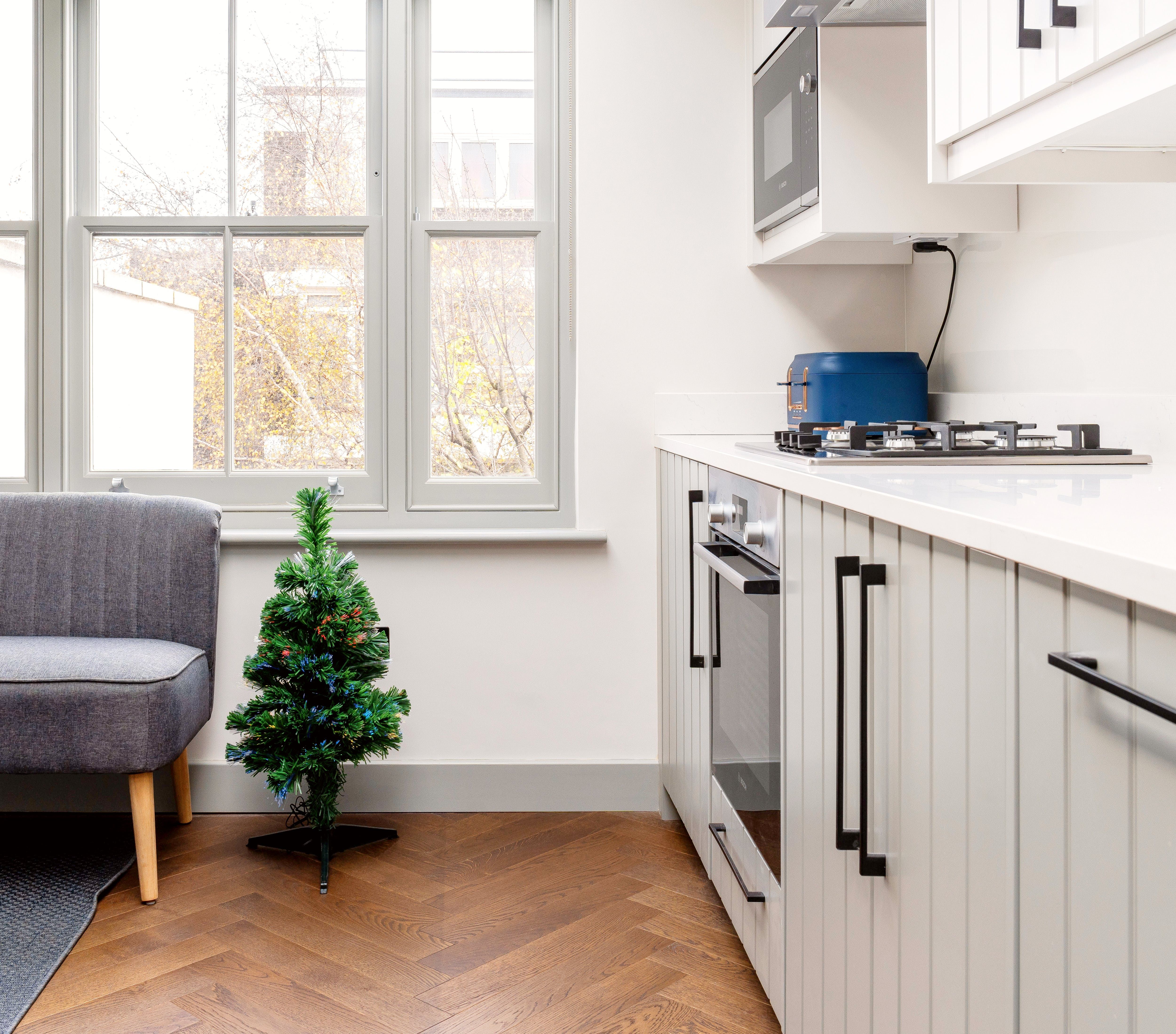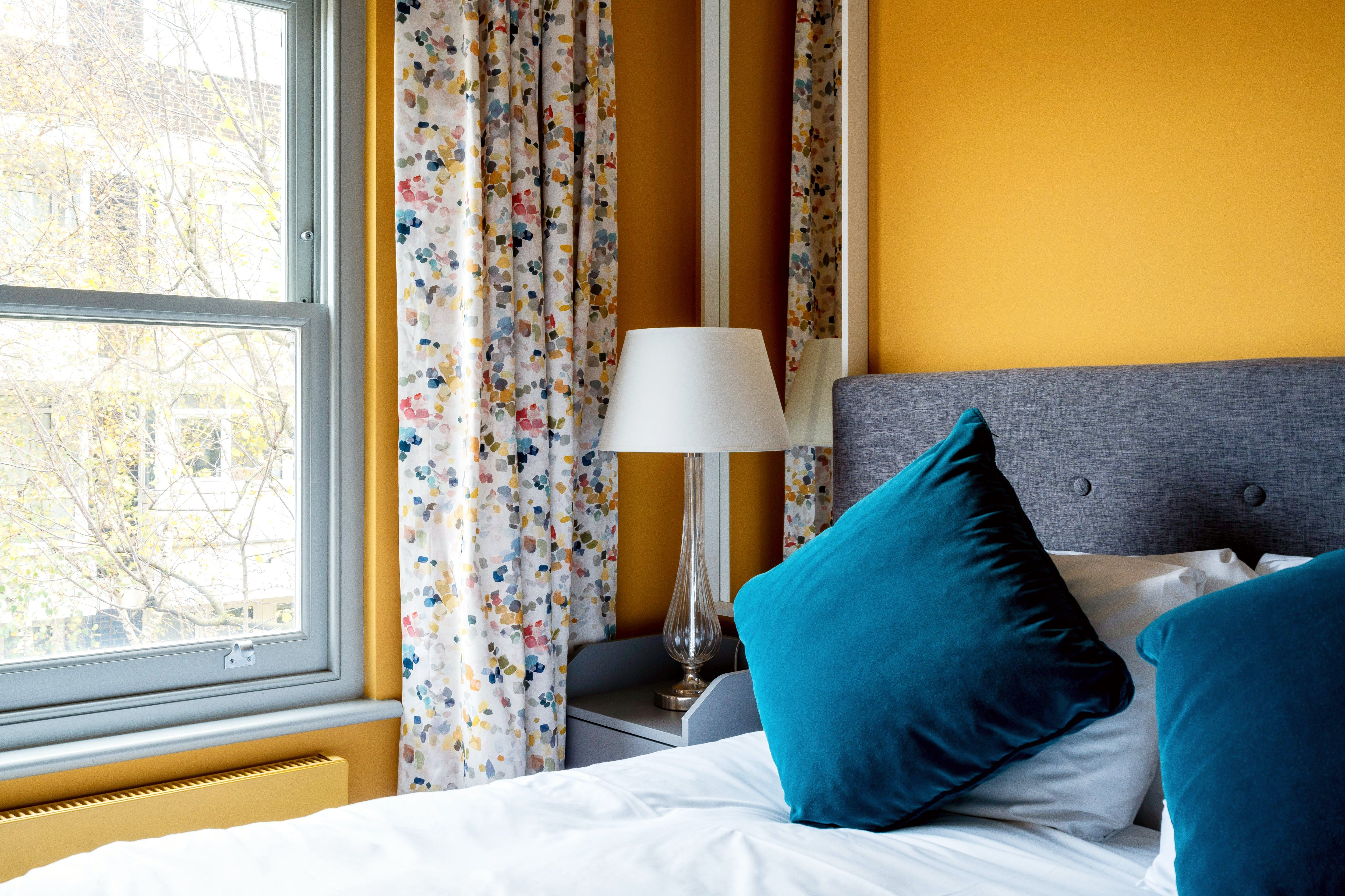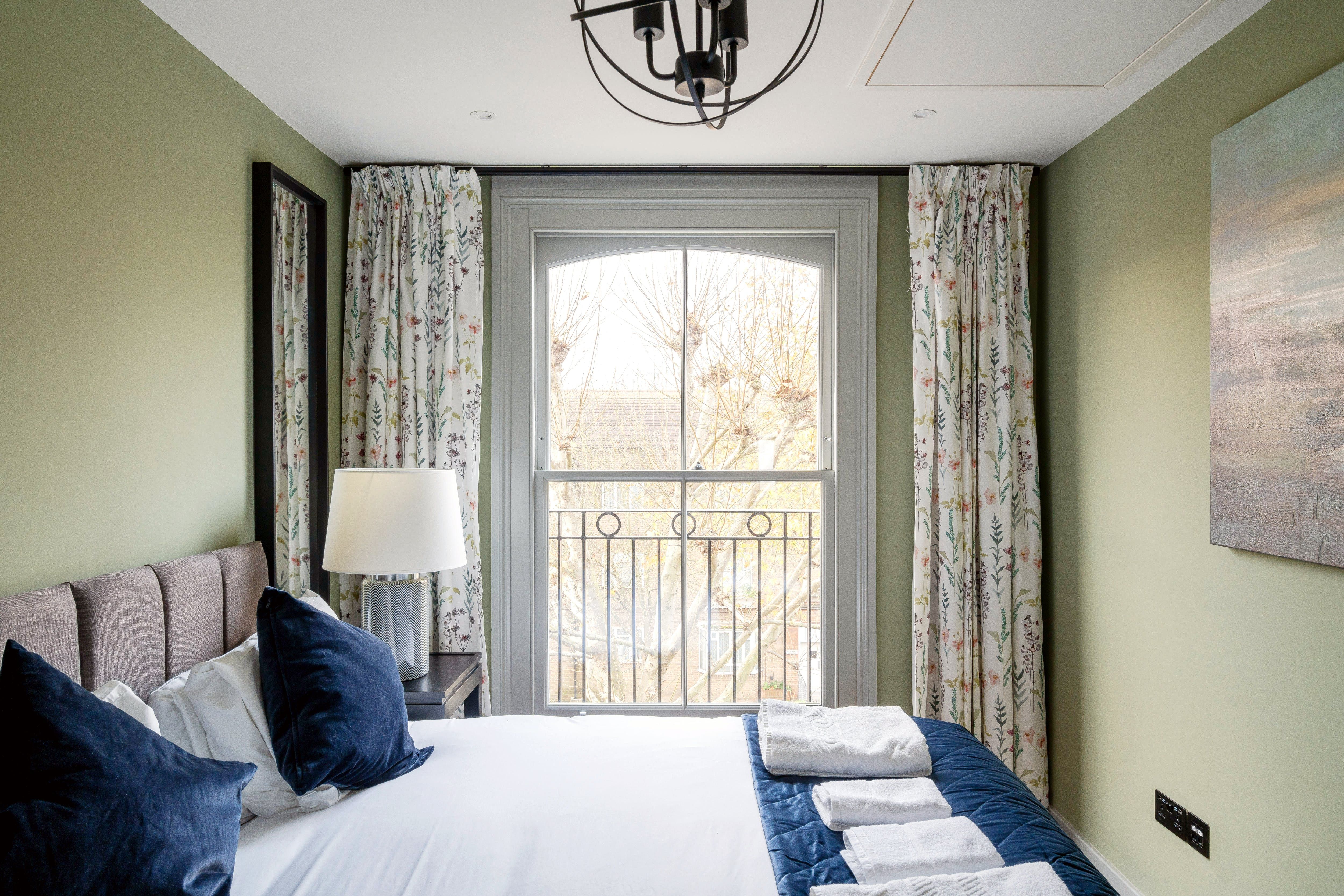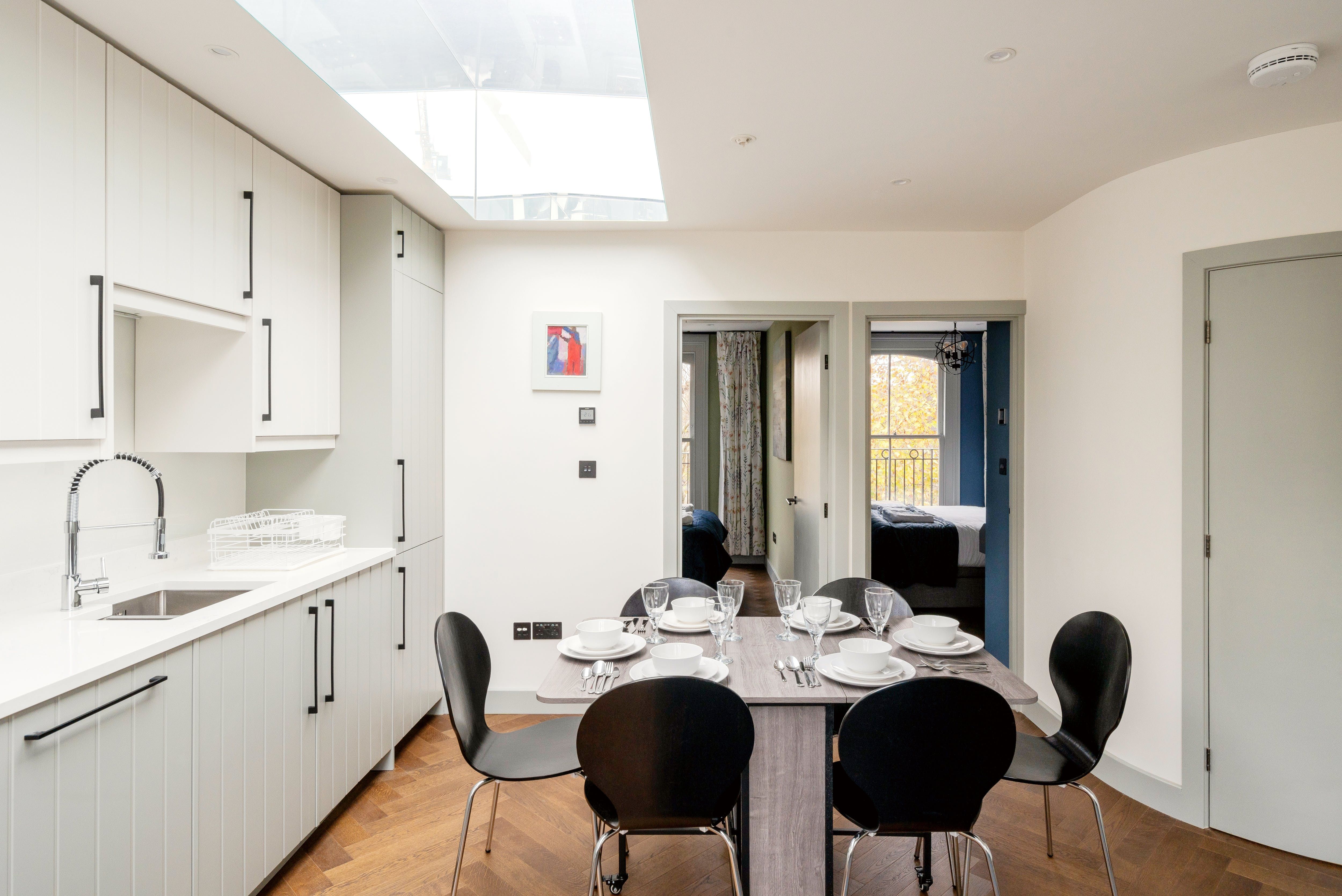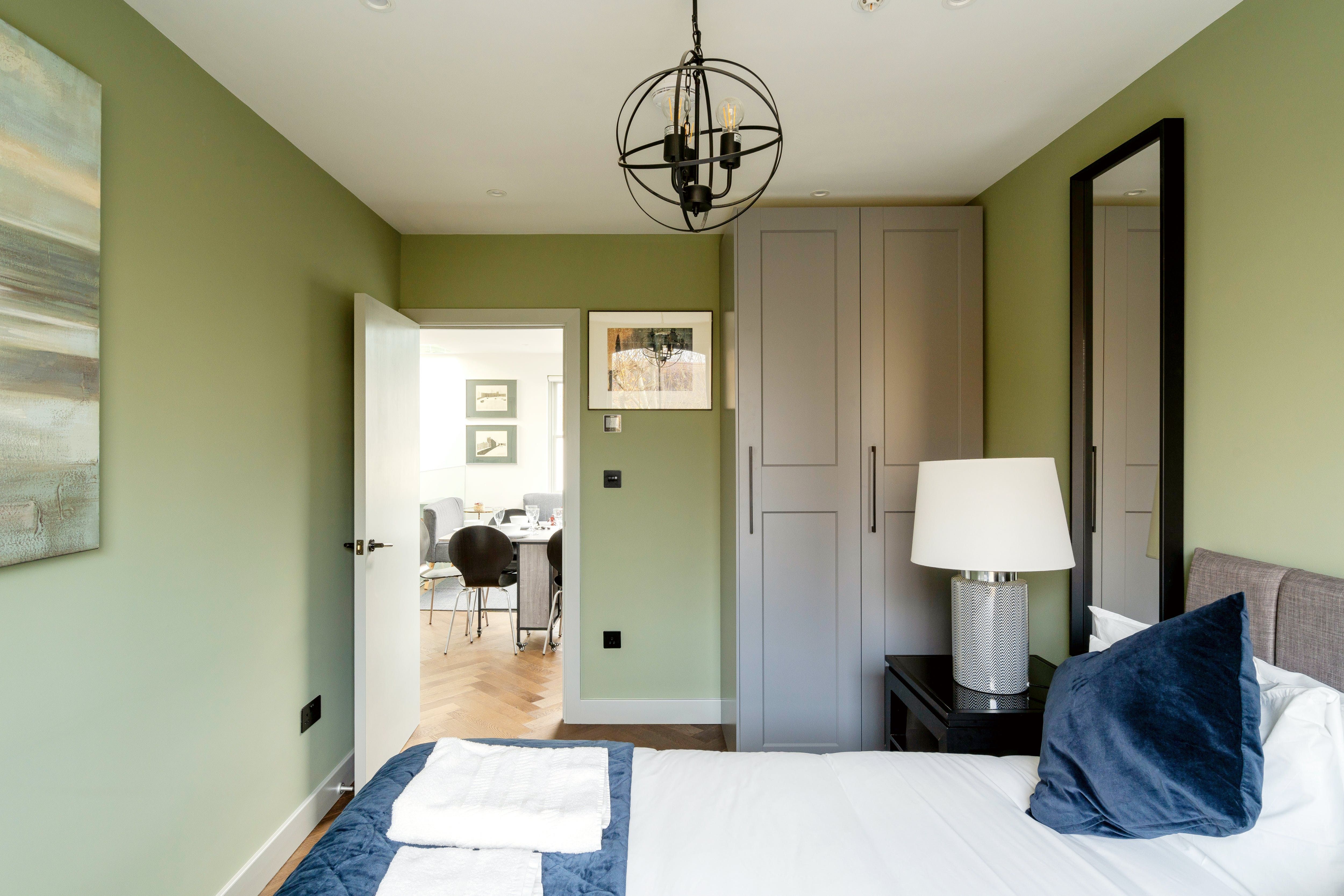 As you enter the flat, you're greeted with an open-plan kitchen and dining area that boasts an expansive skylight, allowing an abundance of natural light to flood the space. Elsewhere, the bedrooms are all generously sized and offer a peaceful retreat from the hustle and bustle of the city, thanks to the soothing sage green, tranquil blue, and vibrant yellow colour schemes in each of the rooms.