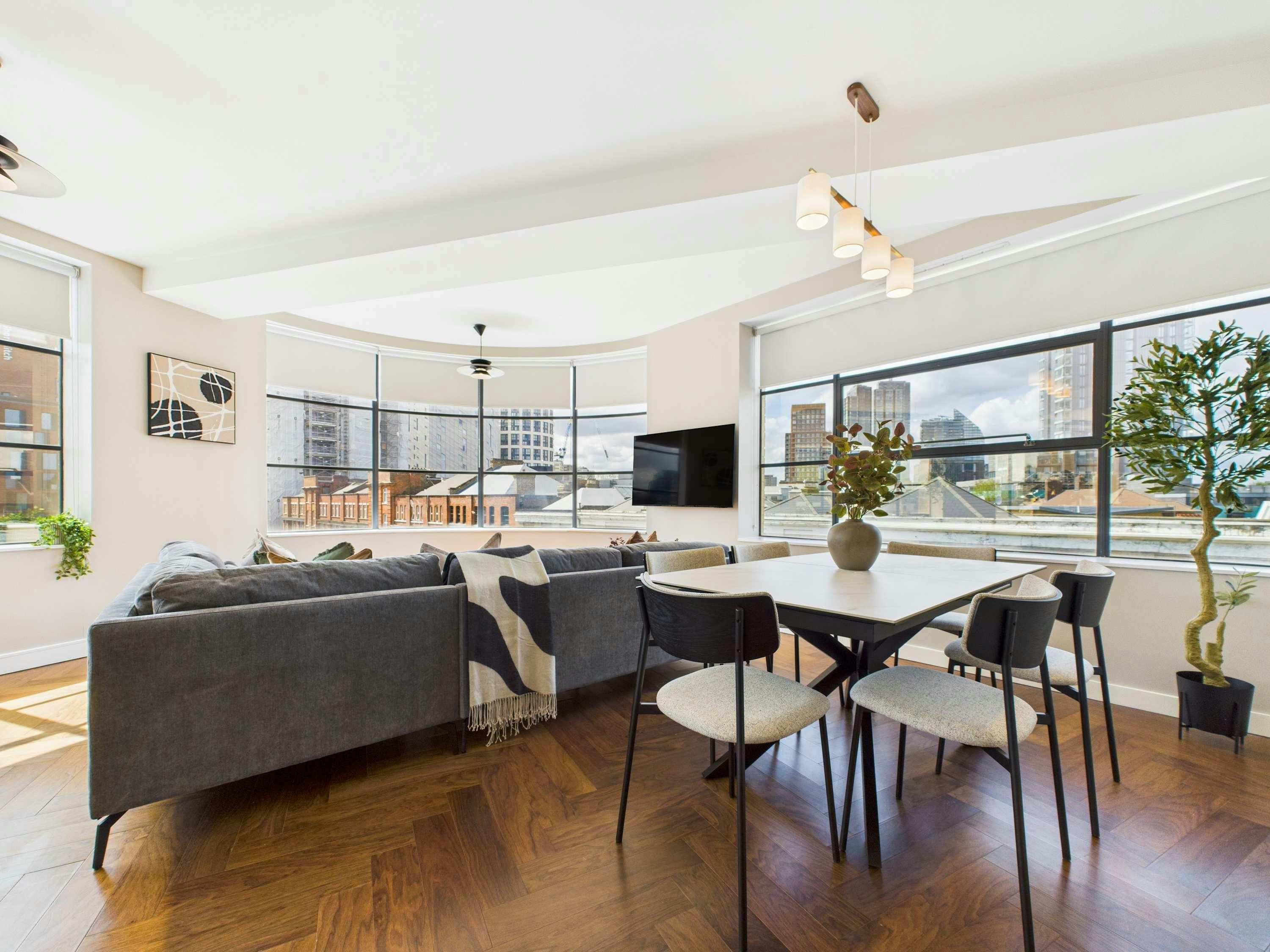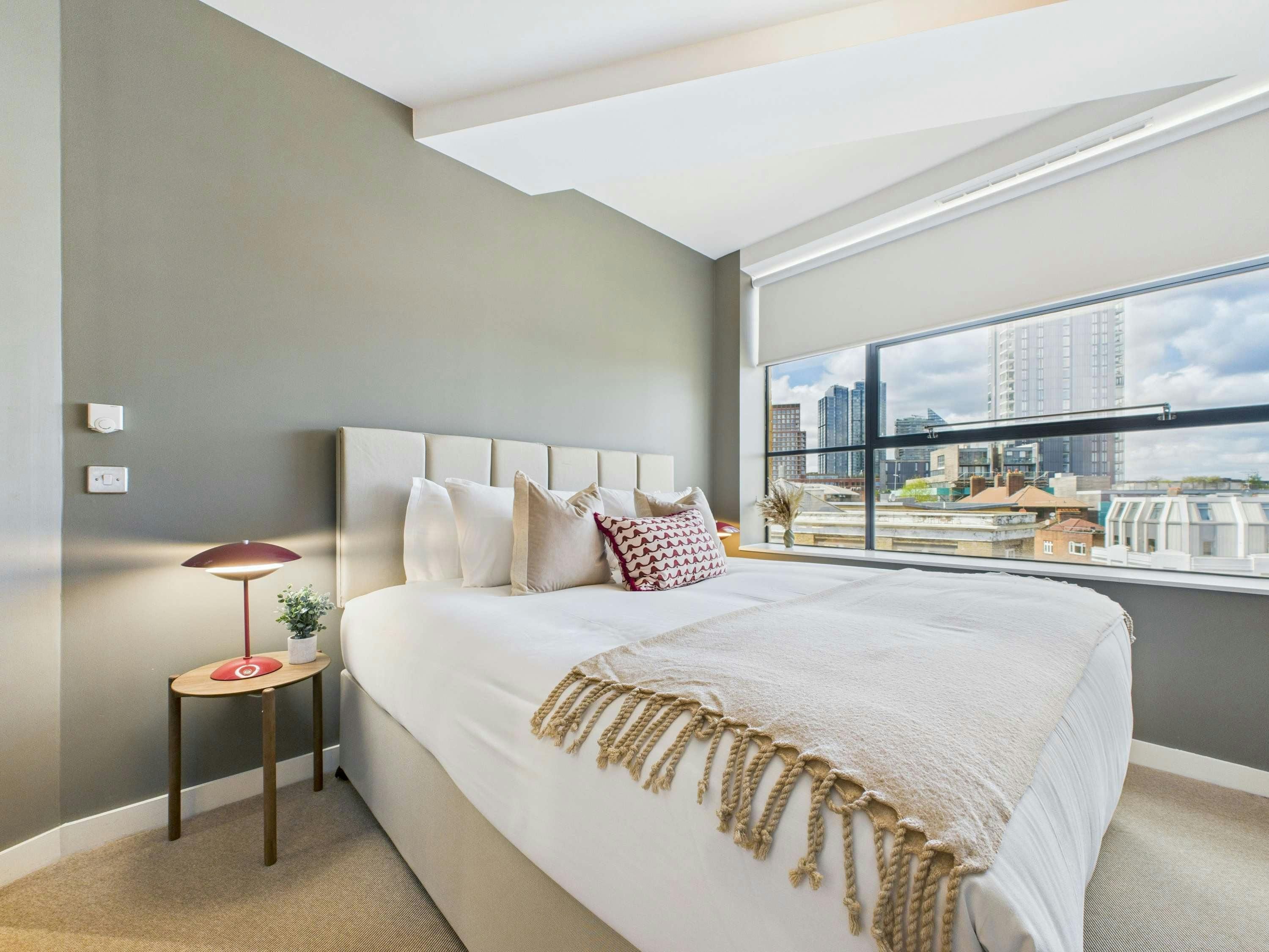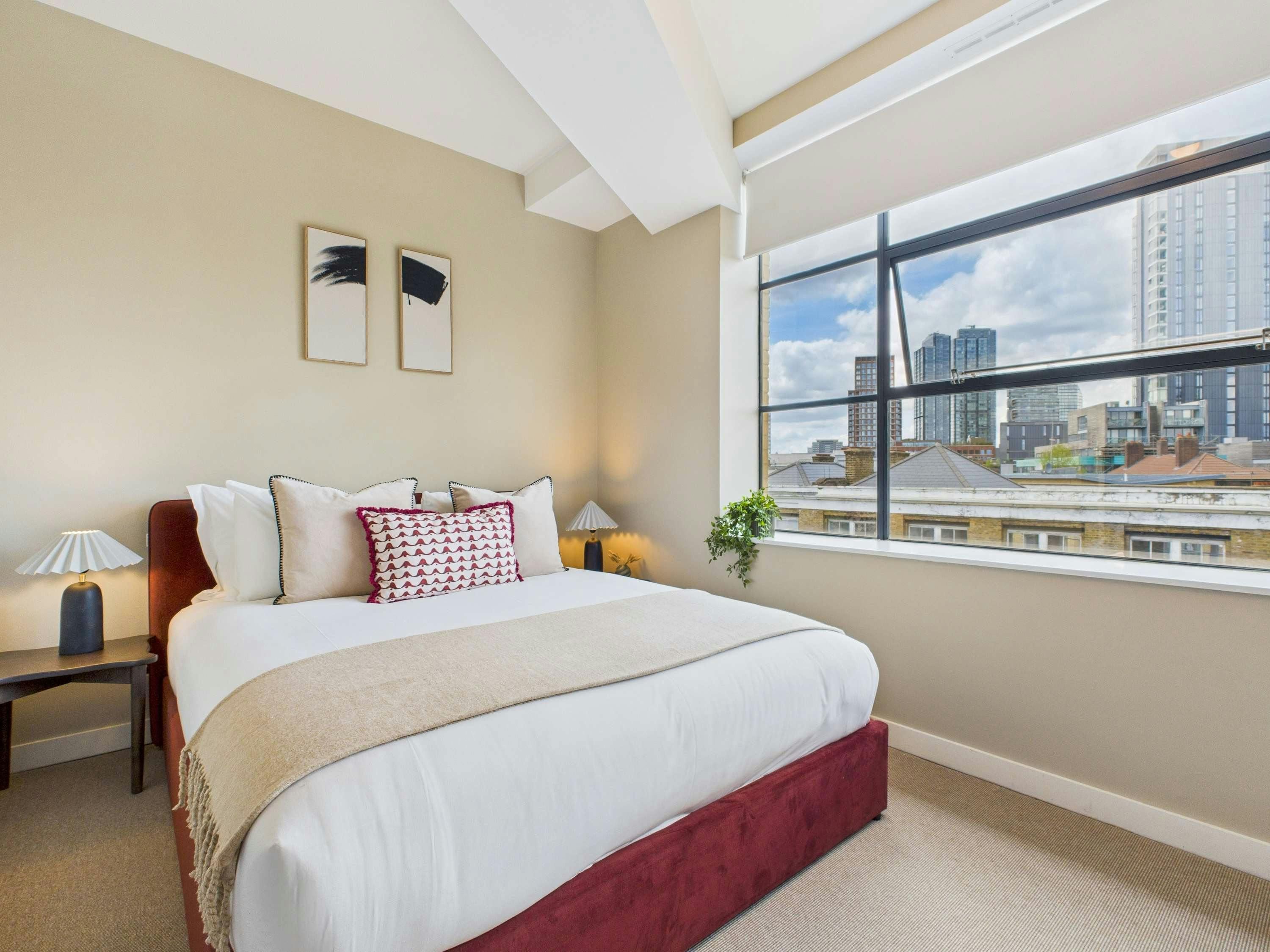This light-filled apartment is an attractive base in London’s Tech City. It’s just moments from the renowned Silicon Roundabout, in the centre of the city’s tech scene. Cafes, bars, and restaurants are nearby, though you’ll have a fully-equipped kitchen to cook in as well. The corner apartment boasts city views, which can be admired through the many windows in the open-plan living and dining space.