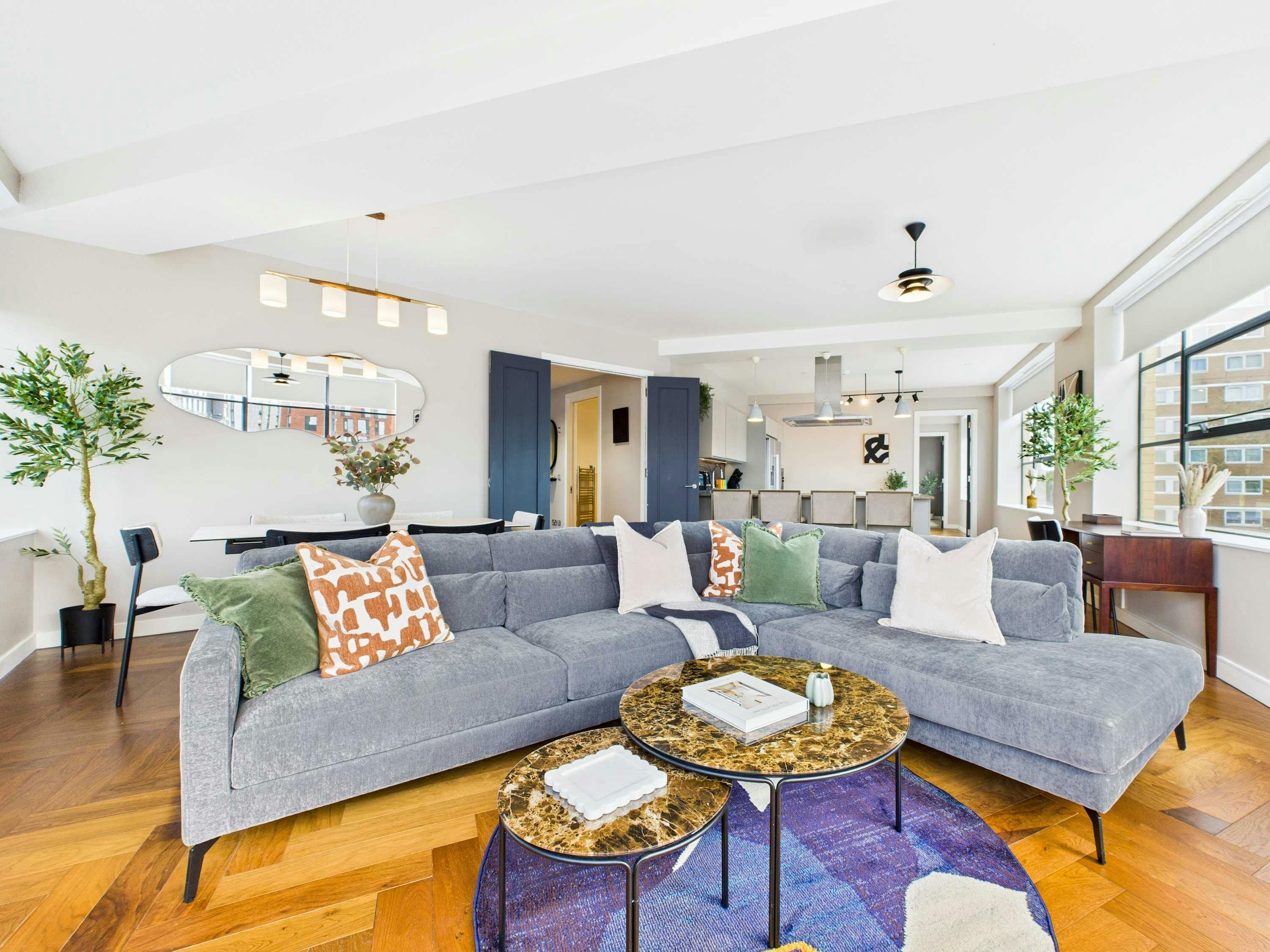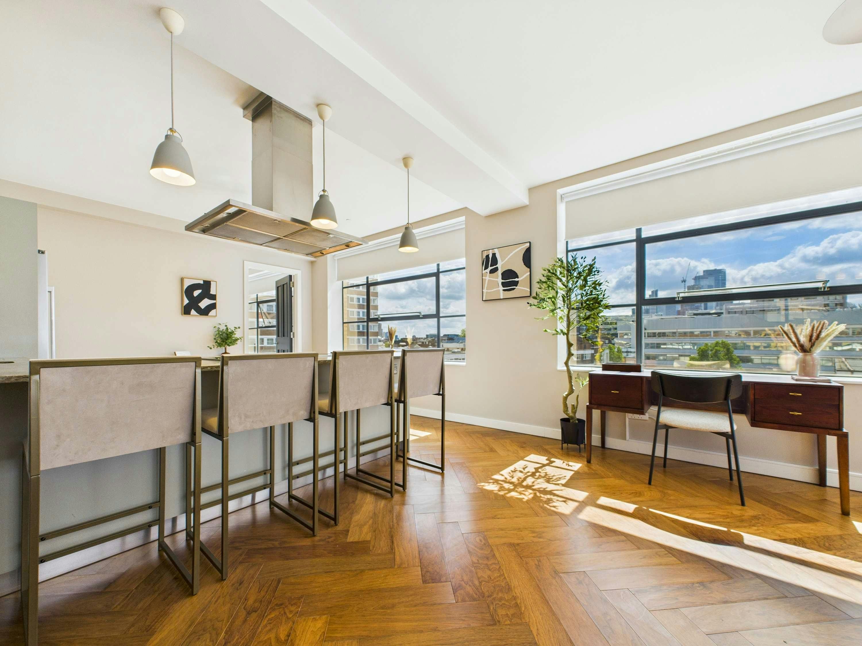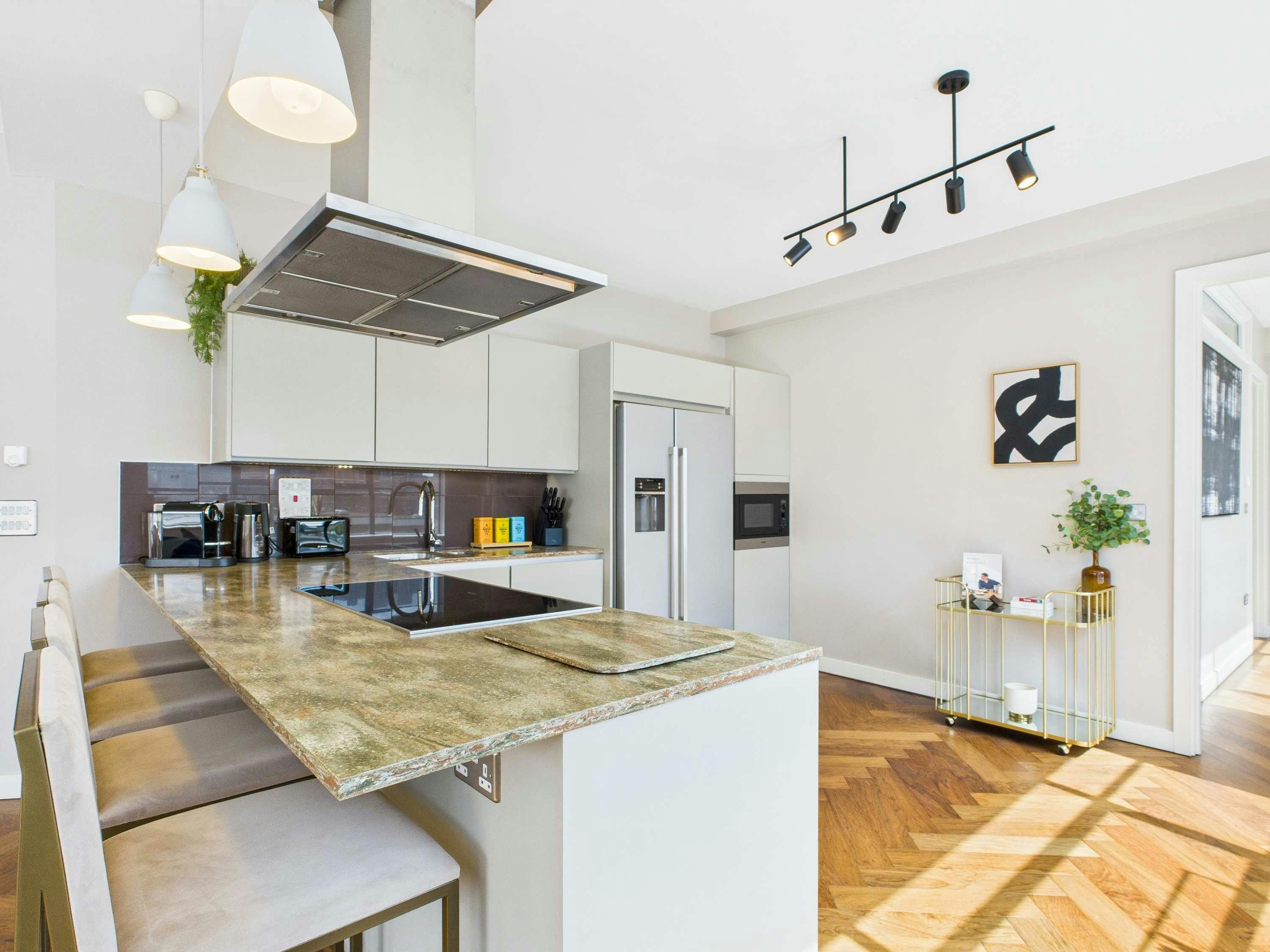 This light-filled apartment is an attractive base in London’s Tech City. It’s just moments from the renowned Silicon Roundabout, in the centre of the city’s tech scene. Cafes, bars, and restaurants are nearby, though you’ll have a fully-equipped kitchen to cook in as well. The corner apartment boasts city views, which can be admired through the many windows in the open-plan living and dining space.