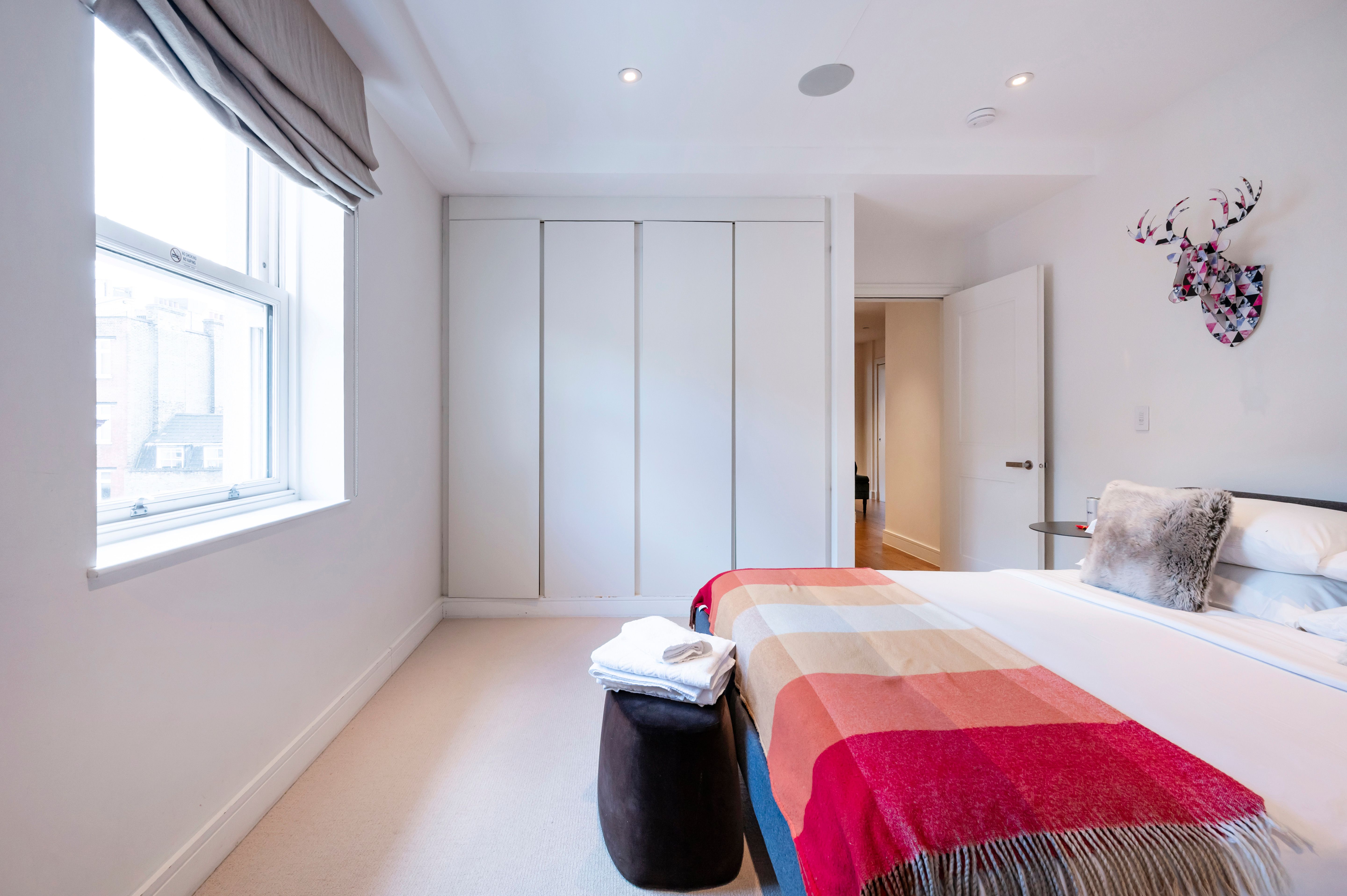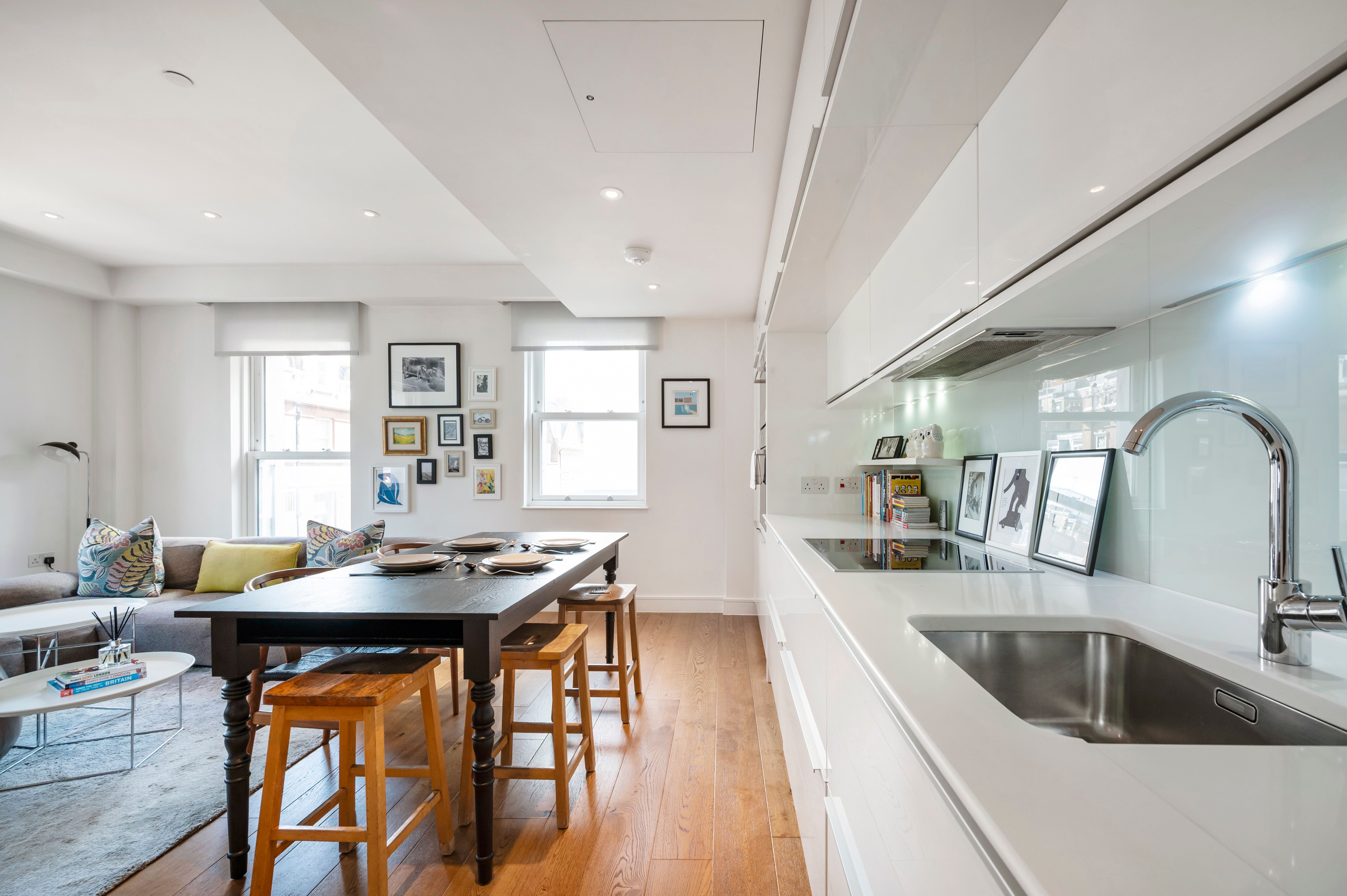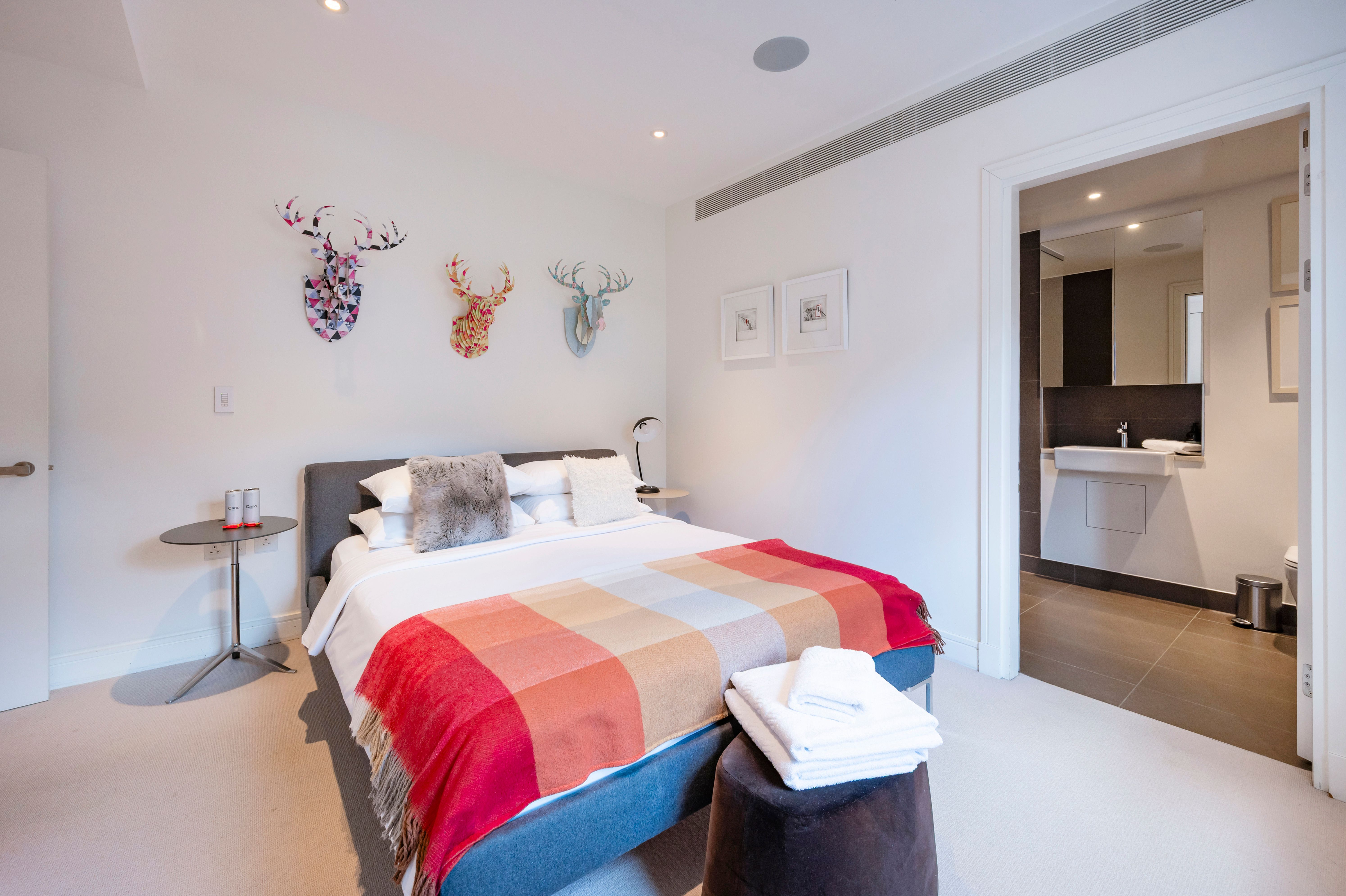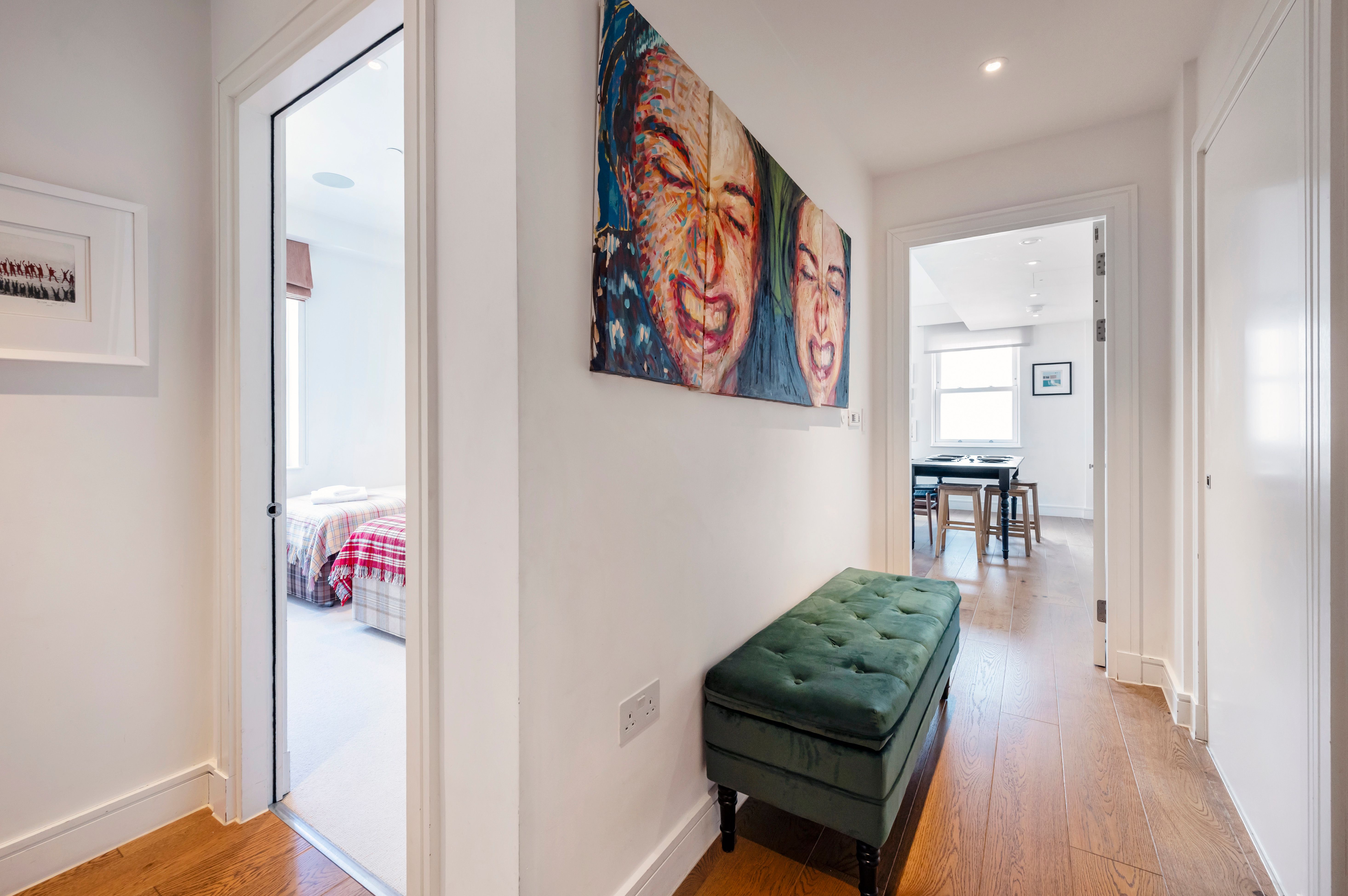 Located just a one-minute walk from London’s iconic Oxford Street, this home is perfect for those who want to experience the true buzz of the city. Catch a glimpse of the hustle and bustle below from the living room’s tall windows, and relish the calm of your bright, modern pad. Splashes of colour make the main room feel welcoming, with art prints, textured cushions and a funky purple chair that’s perfect for starting your day in with a cup of freshly made coffee. The bedrooms, too, are full of artistic flair with the master boasting quirky stag head ornaments and the second bedroom decked out in full London regalia. Spend the day indulging in some retail therapy on Regent Street (a twelve-minute walk) and Oxford Street, stroll along Hyde Park’s leafy paths (a ten-minute walk) and catch a show at a West End theatre (a twenty-five-minute walk). You’re spoilt for choice when it comes to restaurants and bars in the area too, but we wouldn’t blame you for wanting to pass up a night on the town for a chilled-out evening at home. Gather together around the dining table to enjoy a meal with city views, enjoy a luxurious bath, then kick back and unwind on the plump sofa, a glass of wine in hand.