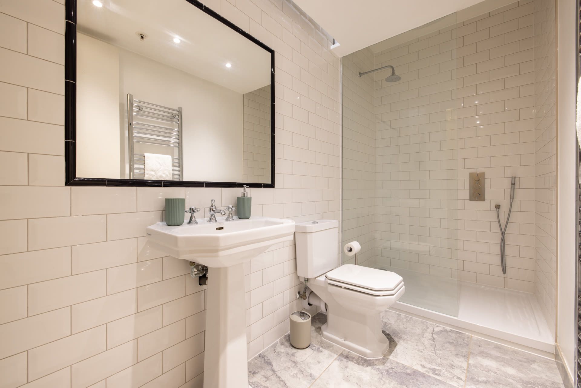 The two bedrooms, meanwhile, are just as chic with their pared-back aesthetic and exposed brick walls, and there’s a desk space in one should you need to catch up on work. Factor in the beautifully sleek metro-tiled bathroom and its luxurious rainfall shower, and you’ve got everything you need for a perfectly pampered stay.
