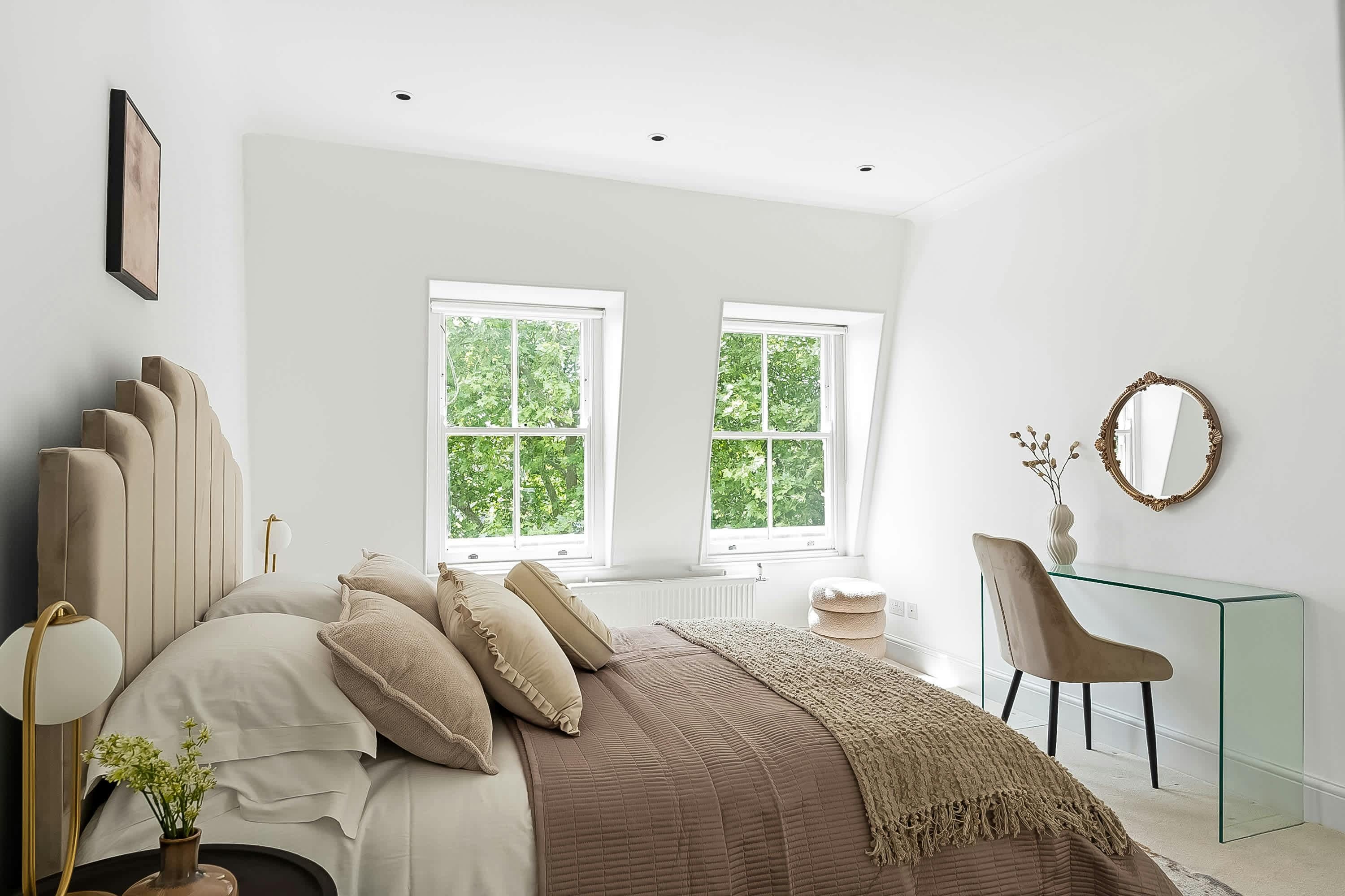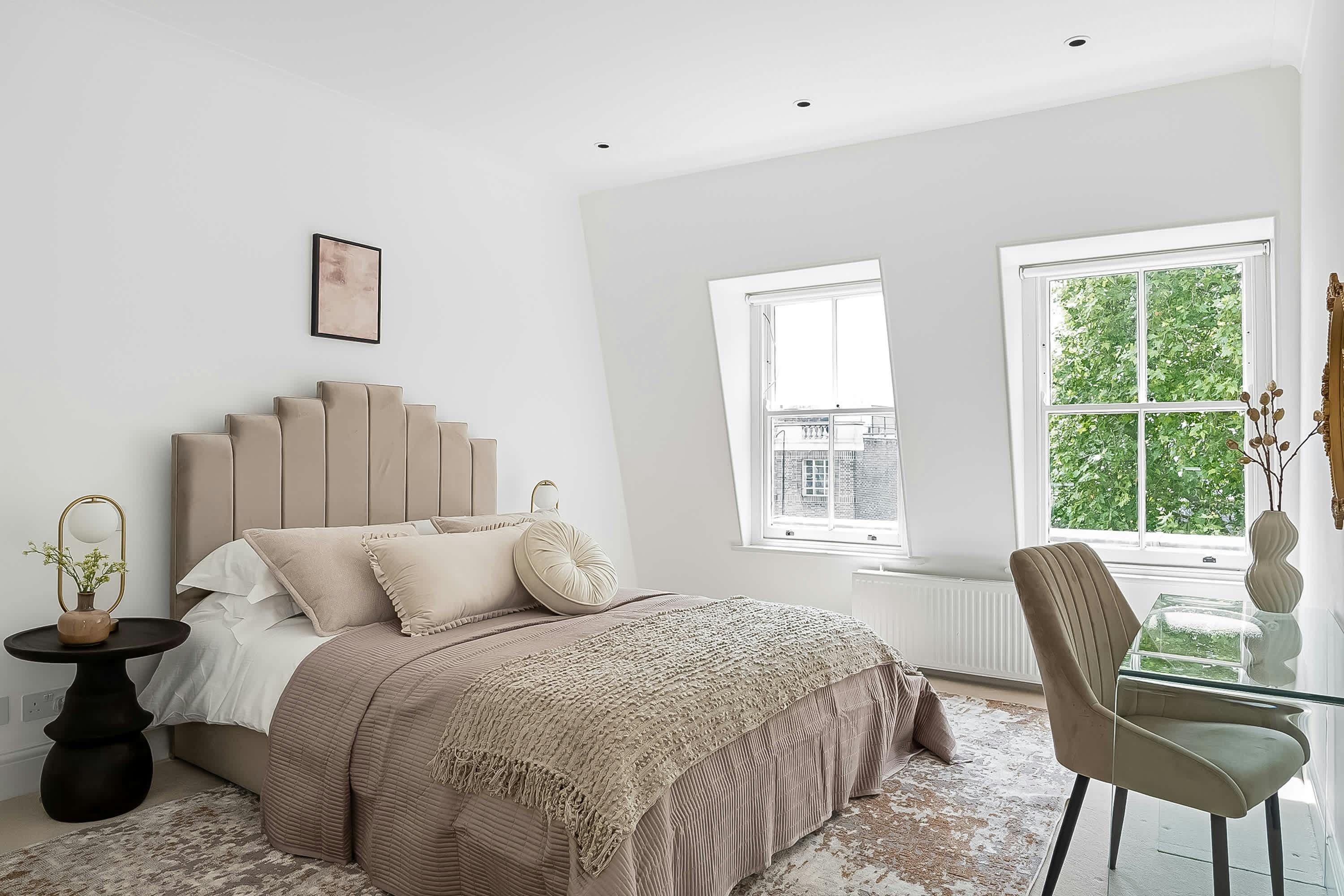 With Hyde Park directly across the street, this apartment opens its doors to the vibrant heart of London. You’ll find everything you could need in the neighbourhood with restaurants, shops and fantastic public transport links – Lancaster Gate and Marble Arch Tube Stations are just minutes away. Back at home, the rooms are calm, cosy and well suited to families. One of the rooms has a desk if you need to catch up on work, while the main bedroom comes with an en-suite bathroom for extra privacy. Complimentary housekeeping is also included in your stay.