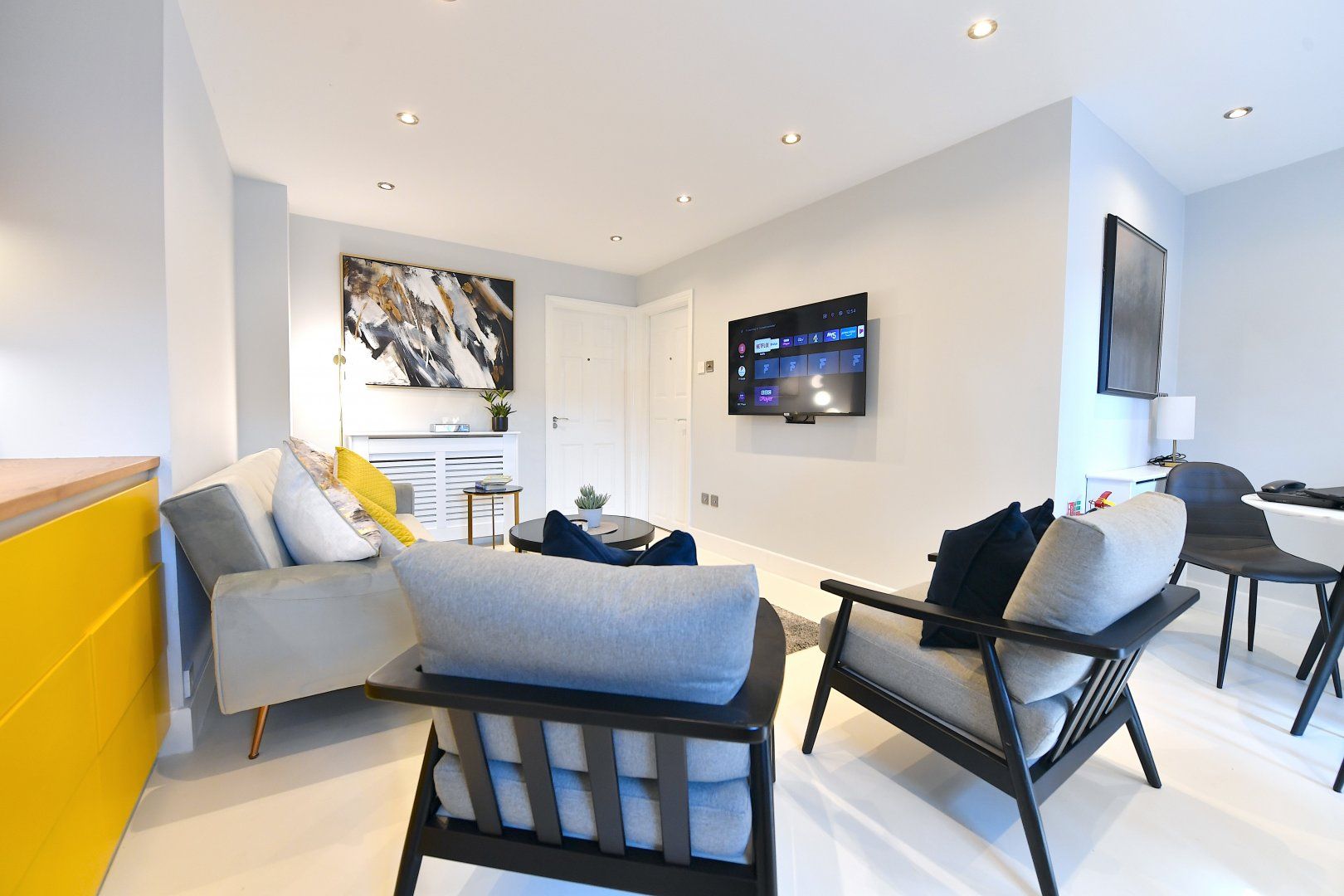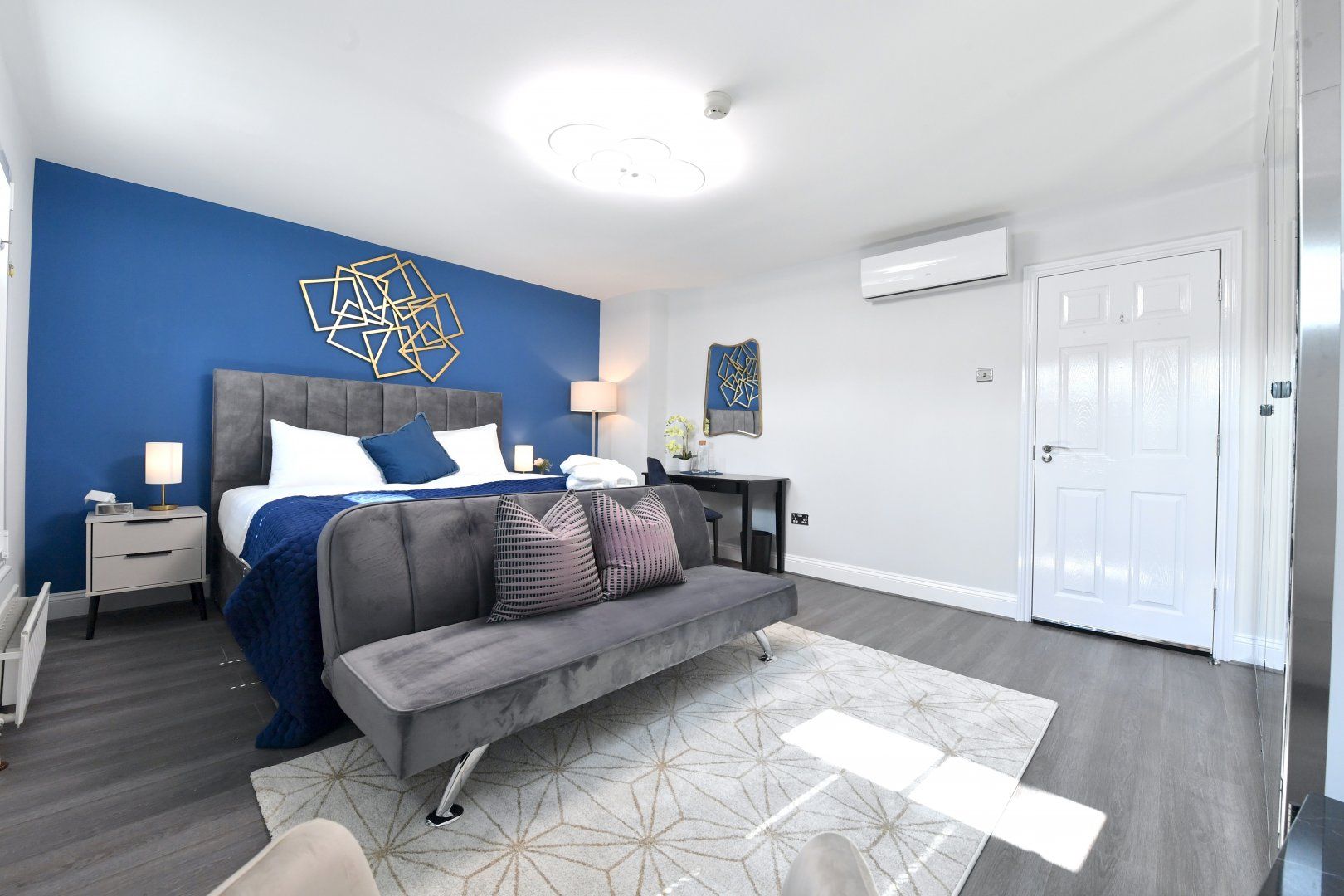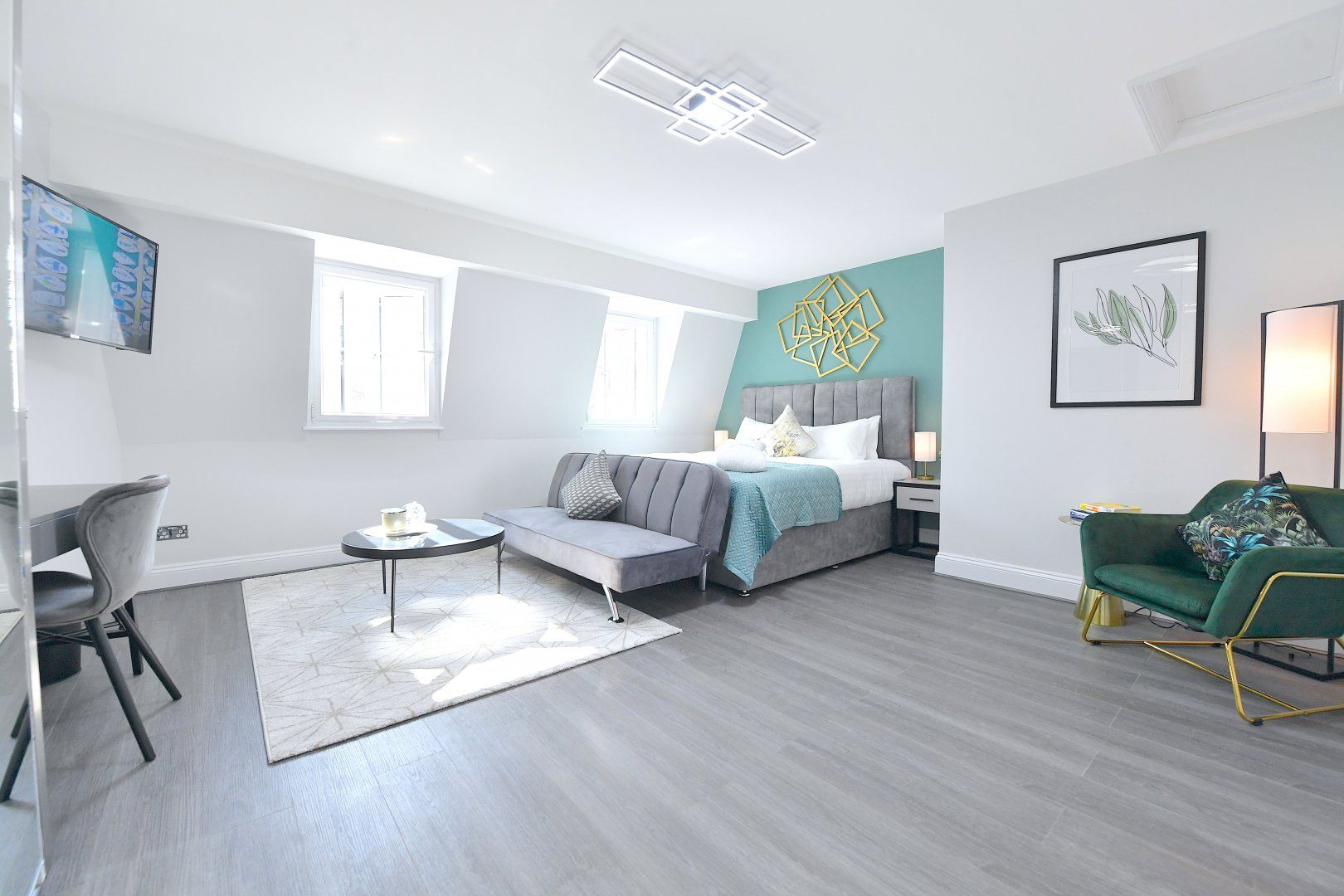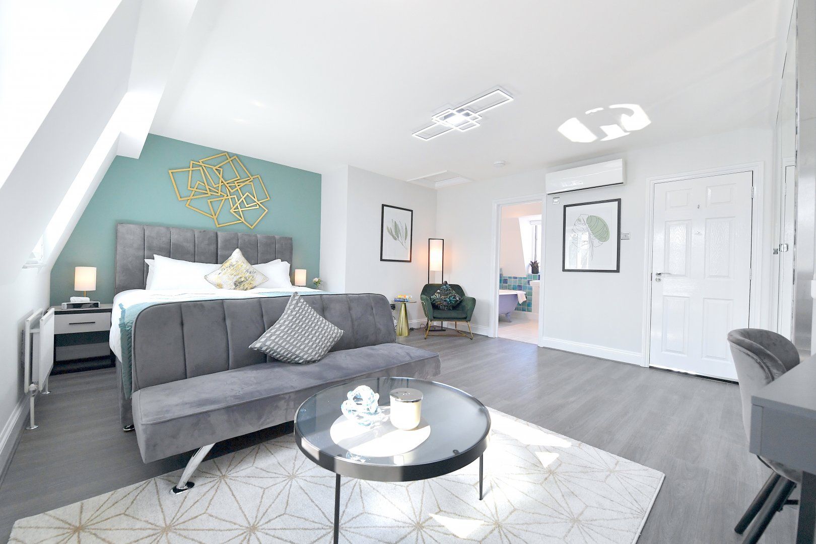 Back home, bright colourful tones and natural woods give the home a playful feel, while plush furnishings keep things comfortable. With a choice of two sitting areas, two kitchens as well as adaptable dining and living space, this is seamless modern living at its finest. Those studying or working from home will also find laptop-friendly desk space, and there's even an outside patio if you wish to take five.