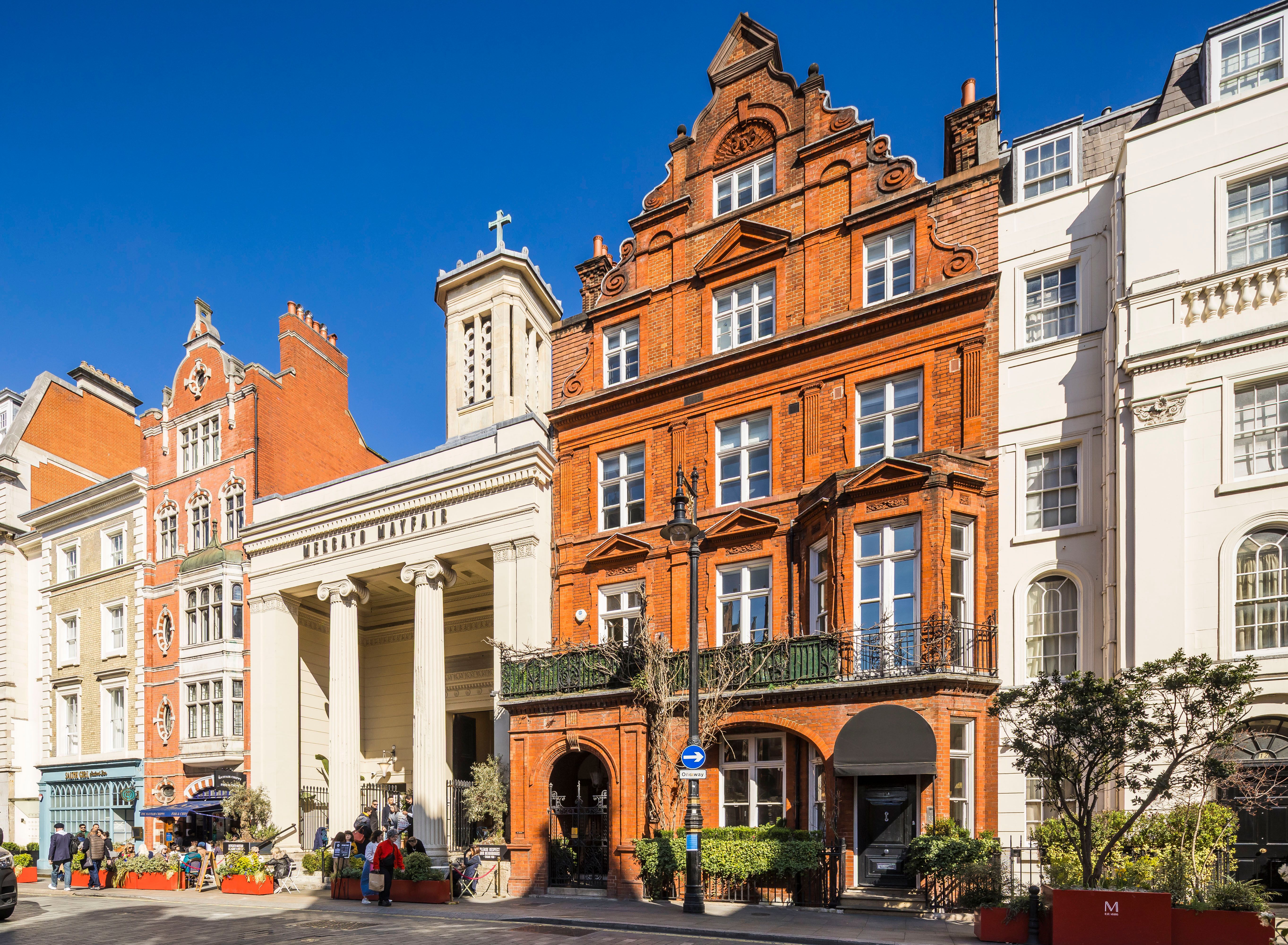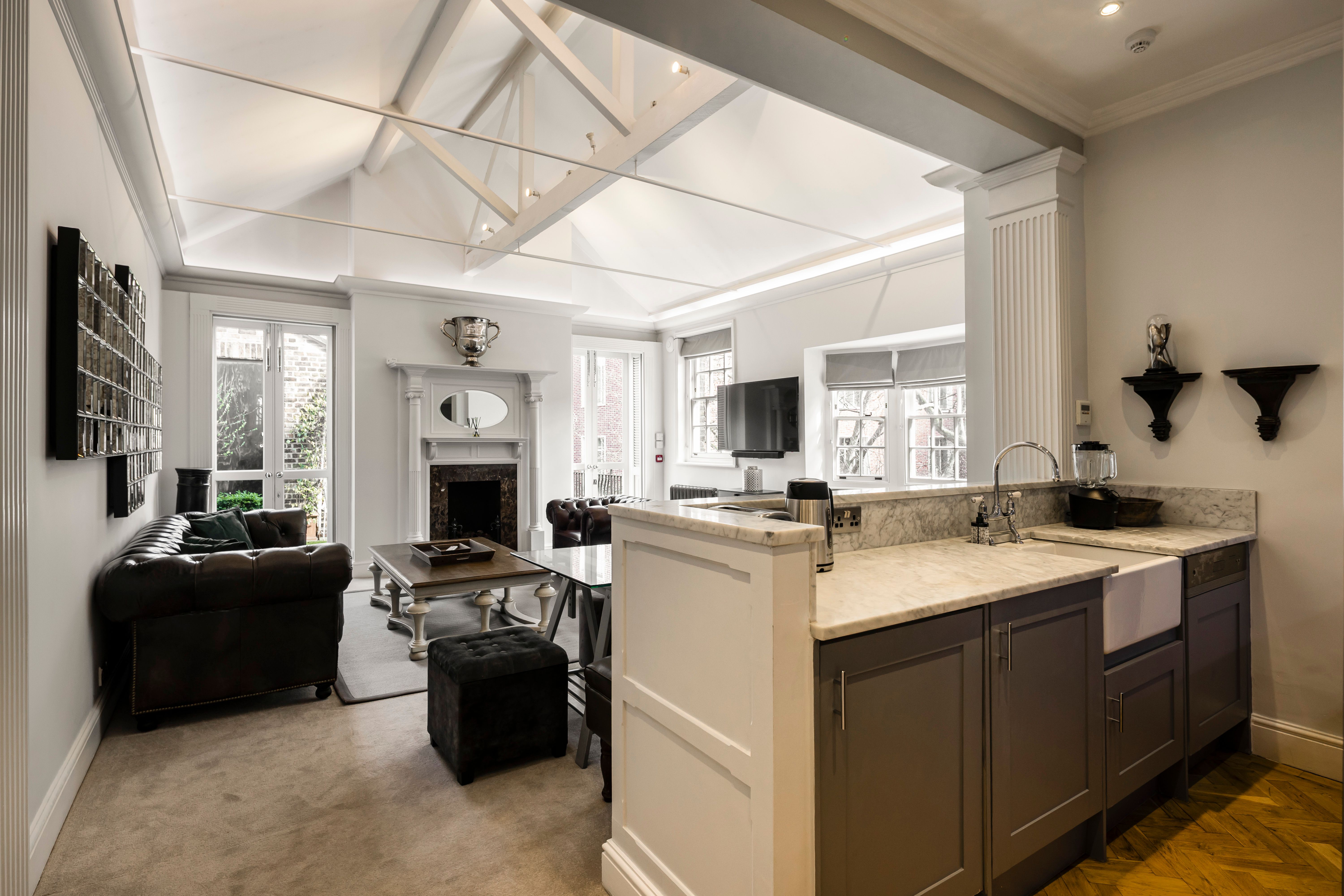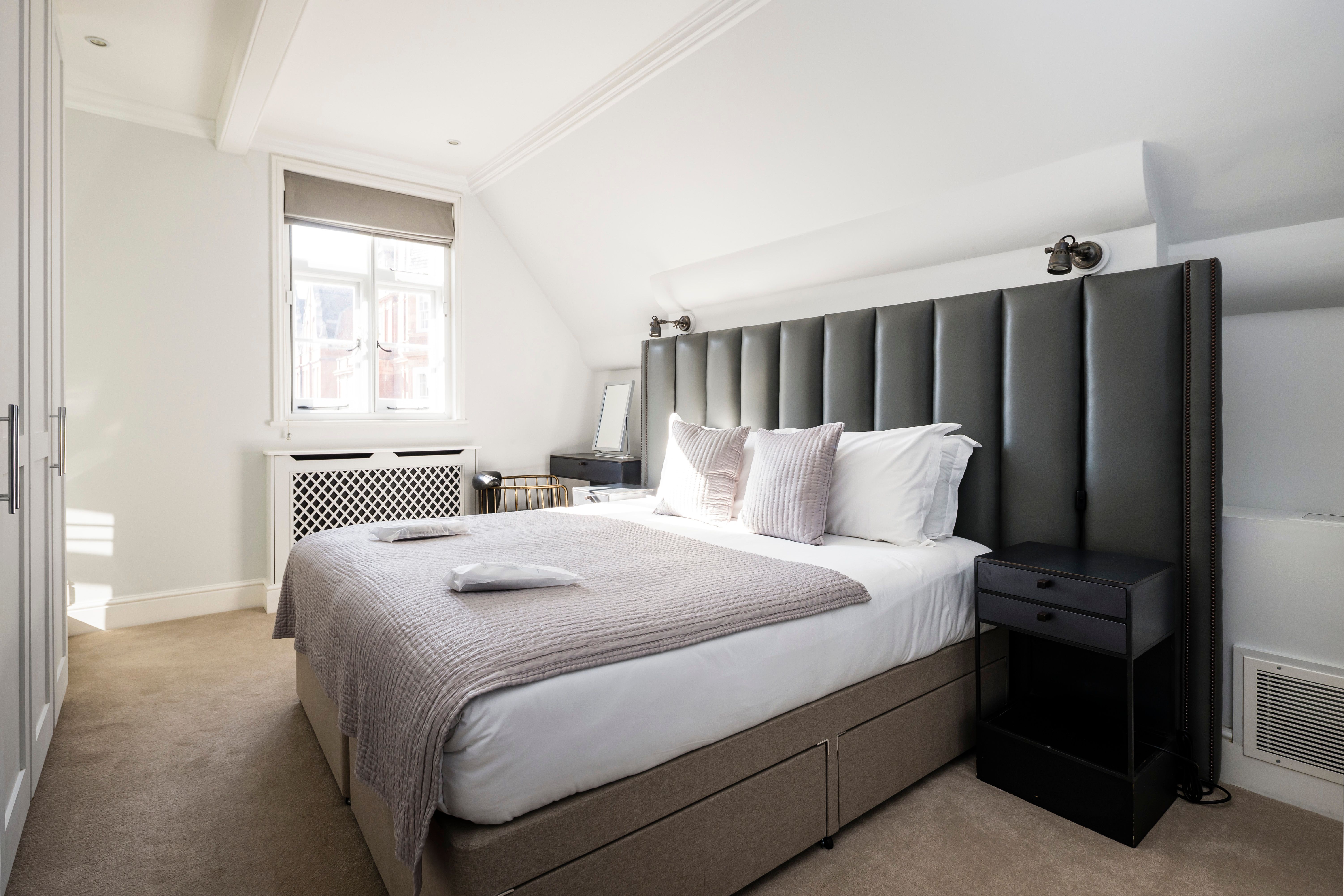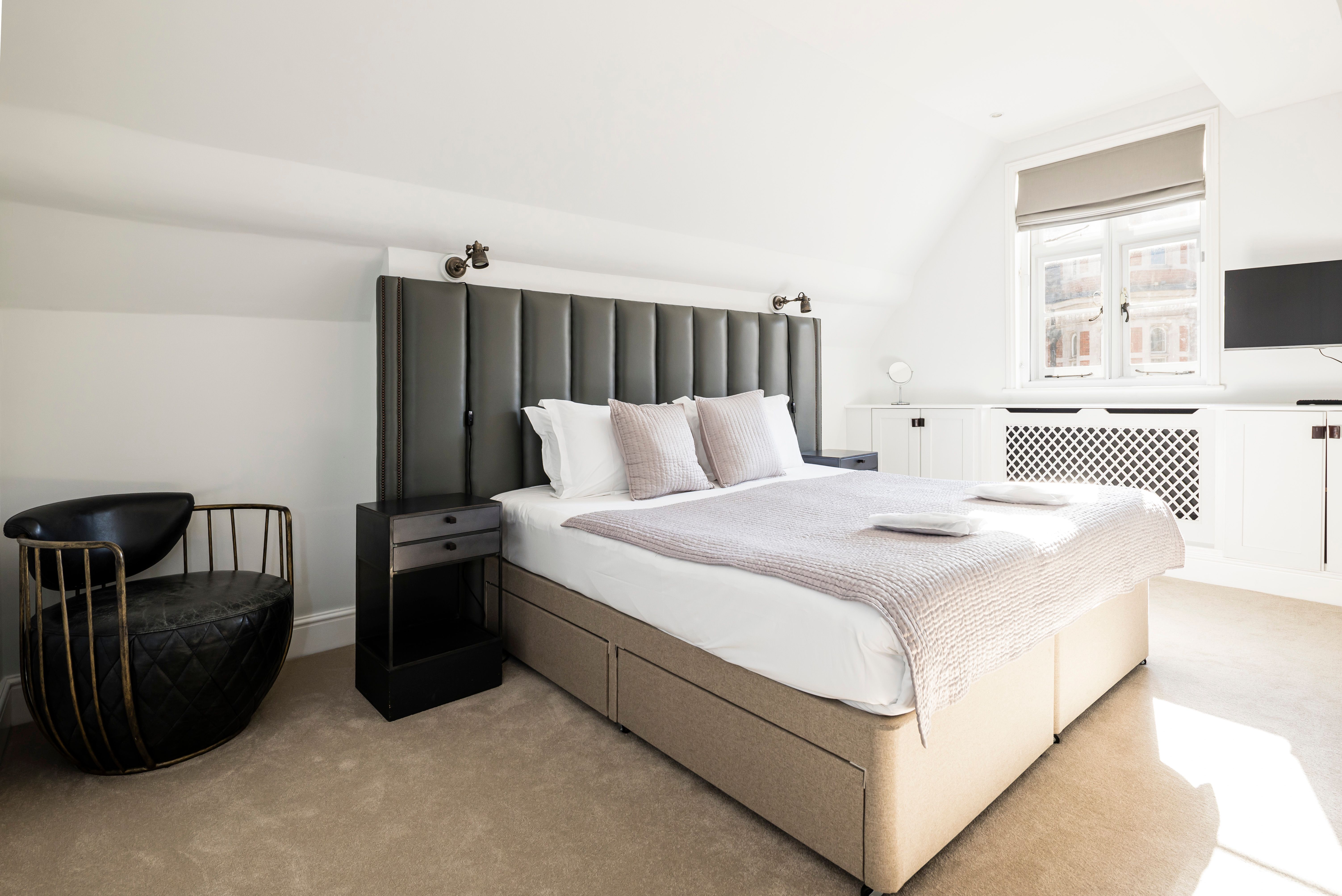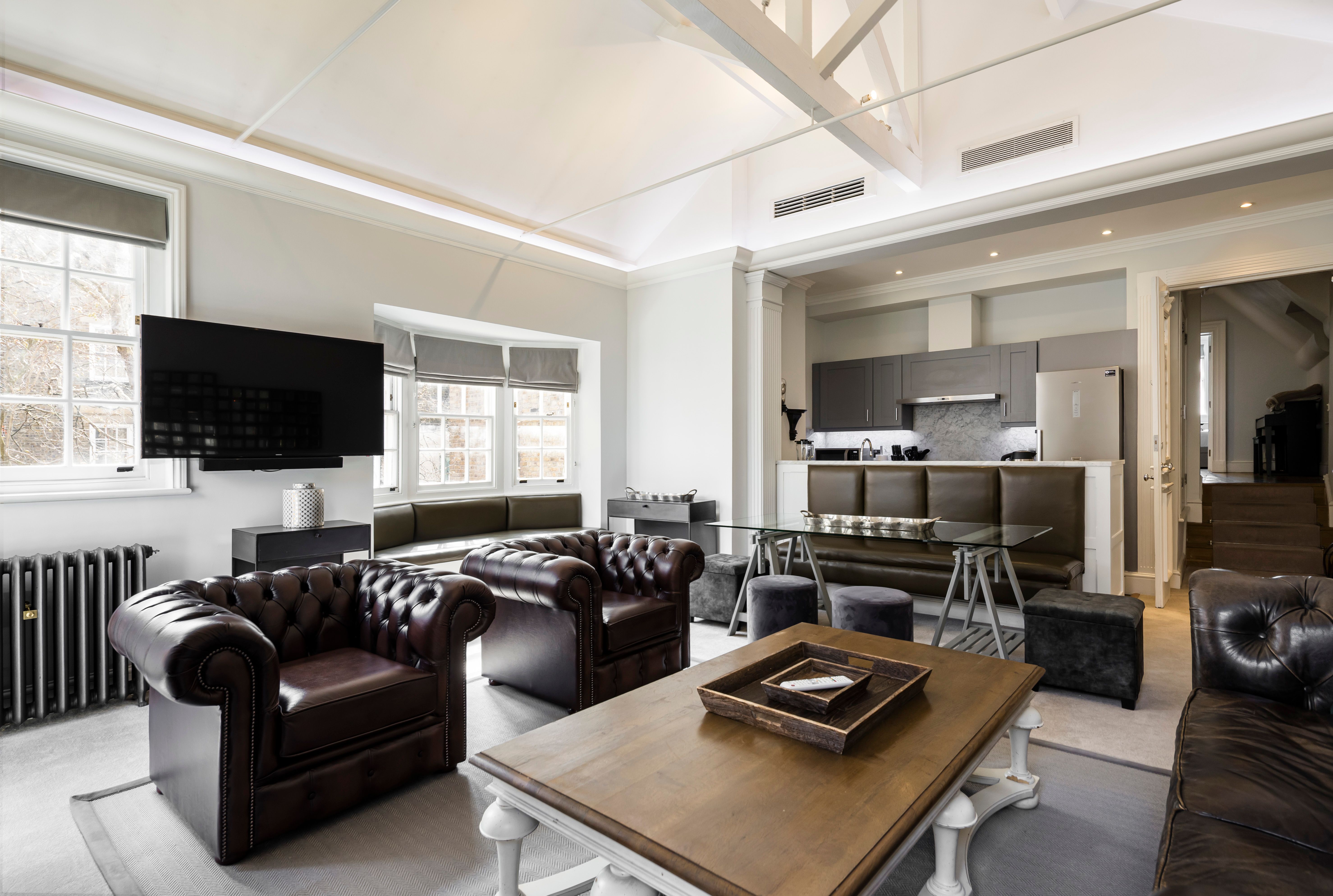 This penthouse residence is located in the heart of Mayfair, one of London's most exclusive areas. The location is perfect for walks in Hyde Park, shopping on Oxford Street, and dining in Covent Garden nearby. Back home, you'll find plenty of space to relax together after a busy day in the city, including an elegant living area with high vaulted ceilings and a Chesterfield sofa. The dining table seats up to eight, and there is a fully fitted kitchen with modern appliances. All four bedrooms benefit from a high-end touch, with the main bedroom offering a roll-top bathtub. But the real standout here is the private outdoor terrace – ideal for alfresco dining and entertaining during the summer months.