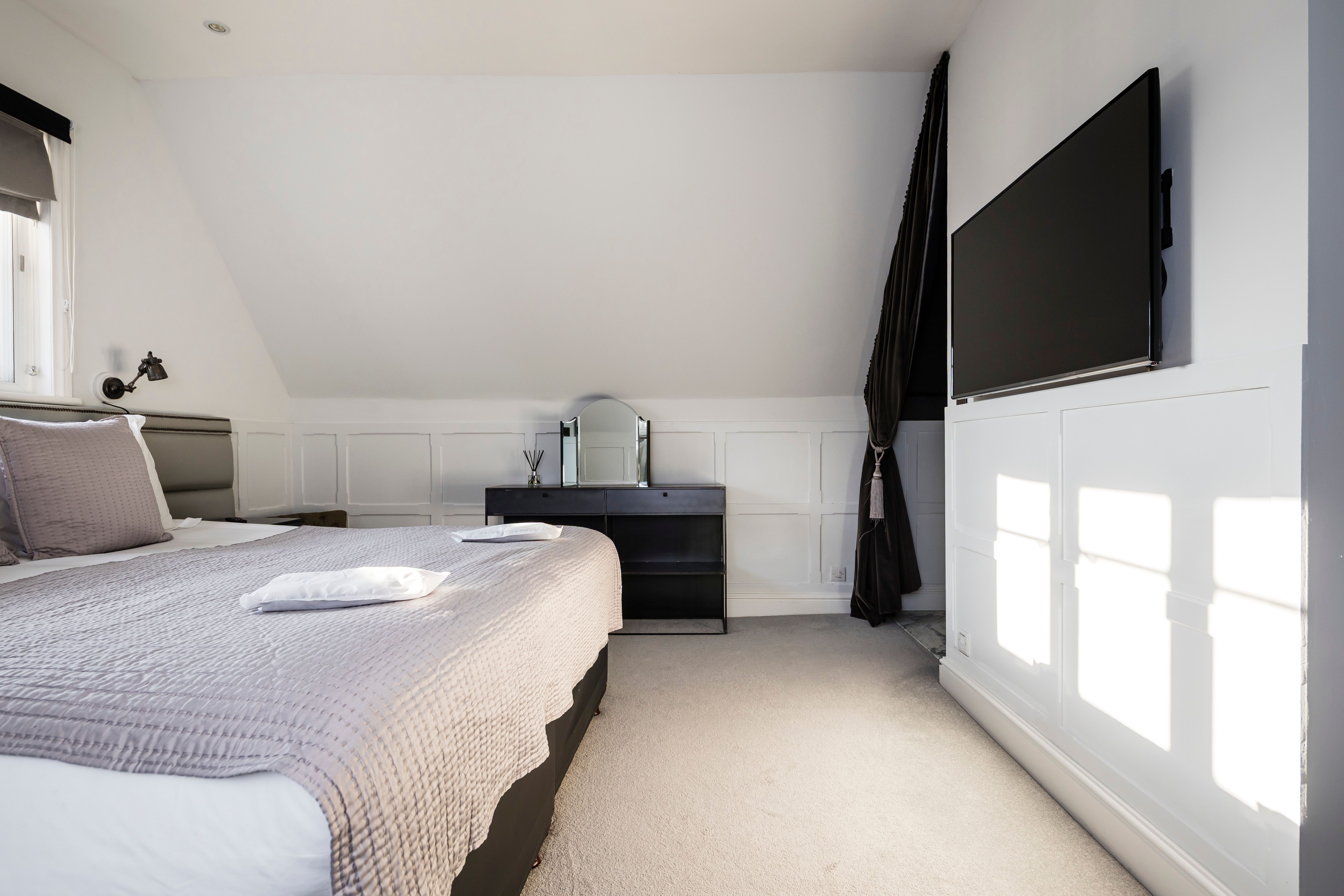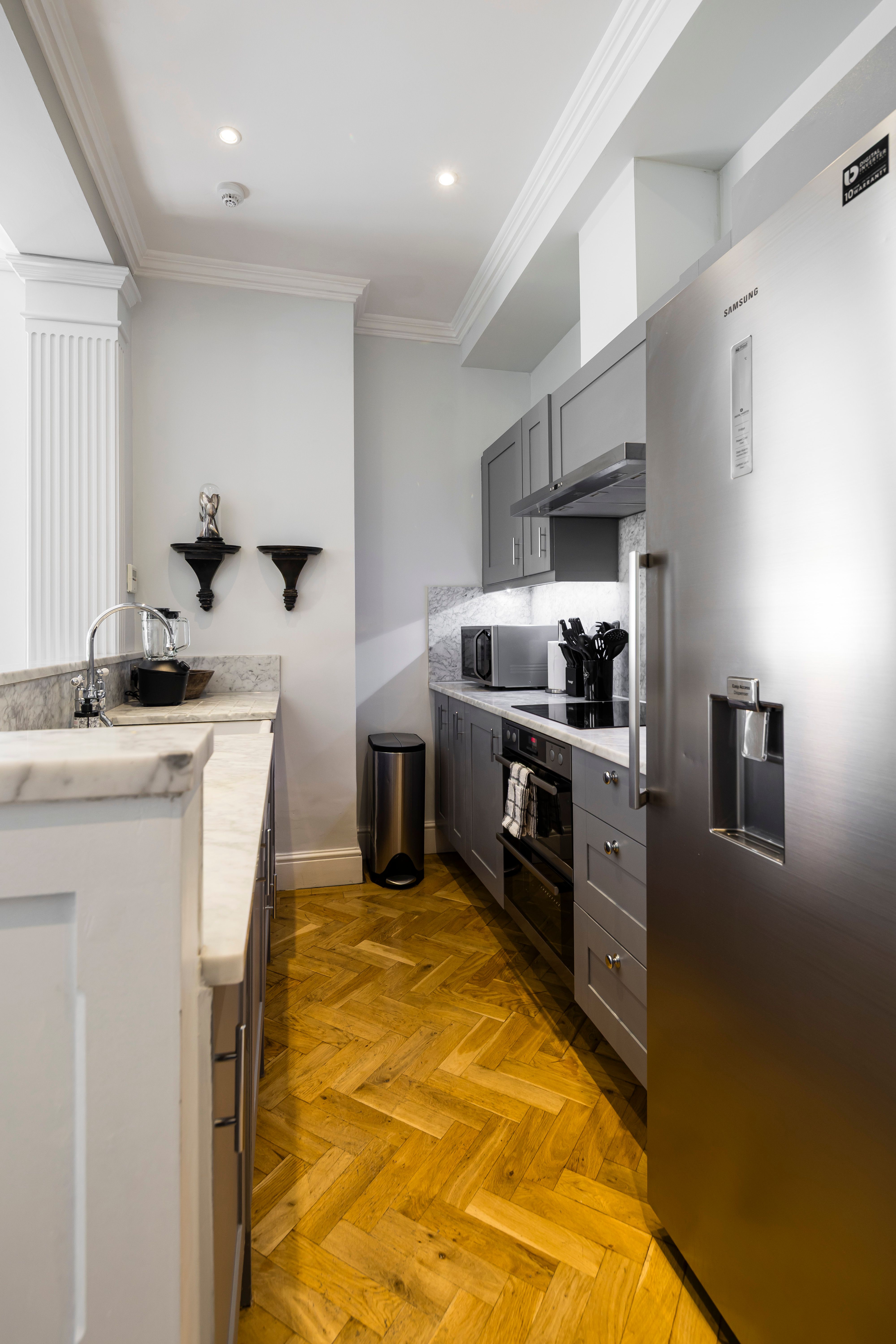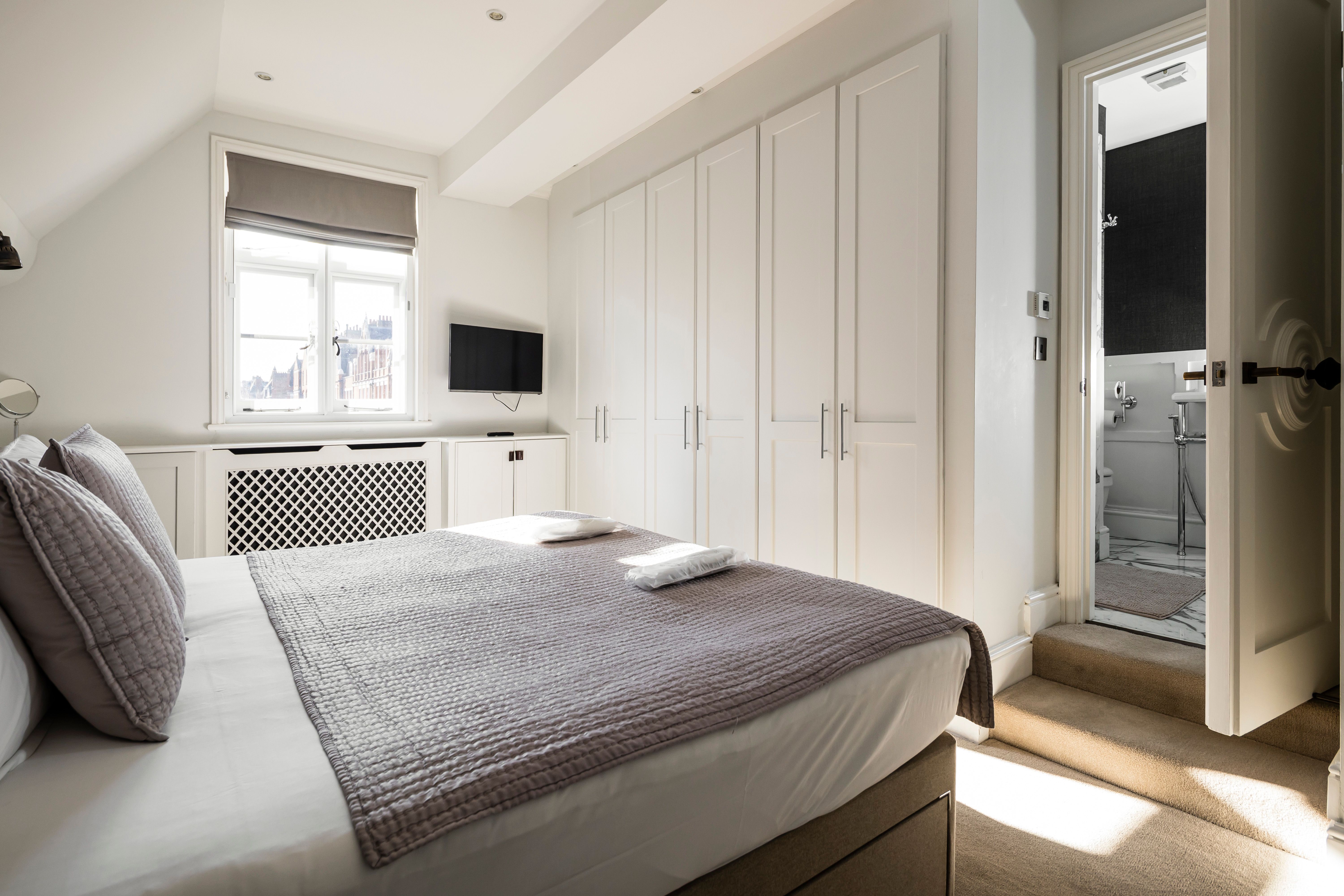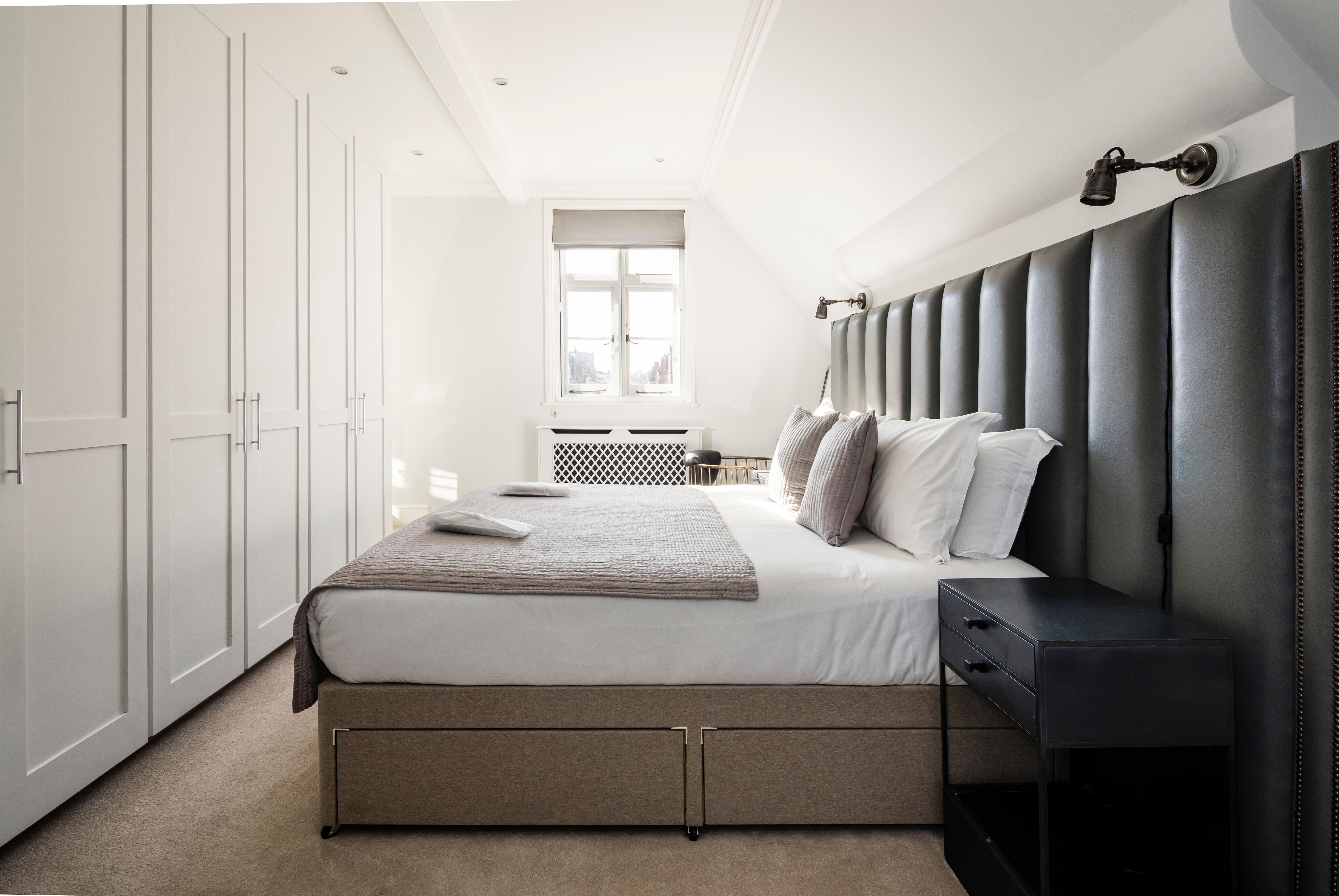 This penthouse residence is located in the heart of Mayfair, one of London's most exclusive areas. The location is perfect for walks in Hyde Park, shopping on Oxford Street, and dining in Covent Garden nearby. Back home, you'll find plenty of space to relax together after a busy day in the city, including an elegant living area with high vaulted ceilings and a Chesterfield sofa. The dining table seats up to eight, and there is a fully fitted kitchen with modern appliances. All four bedrooms benefit from a high-end touch, with the main bedroom offering a roll-top bathtub. But the real standout here is the private outdoor terrace – ideal for alfresco dining and entertaining during the summer months.