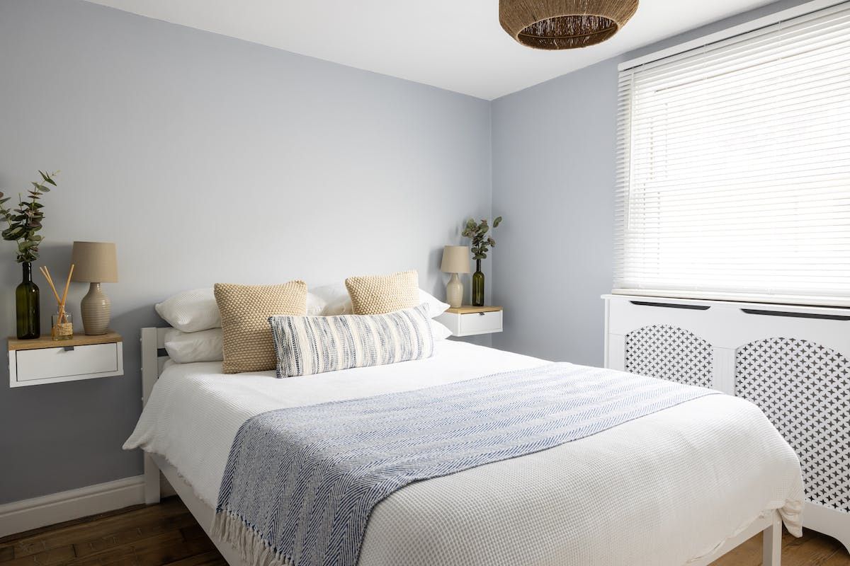 The two downstairs bedrooms, meanwhile, are pared-back and peaceful, styled with a homey touch and soft pastel hues that feel instantly welcoming.