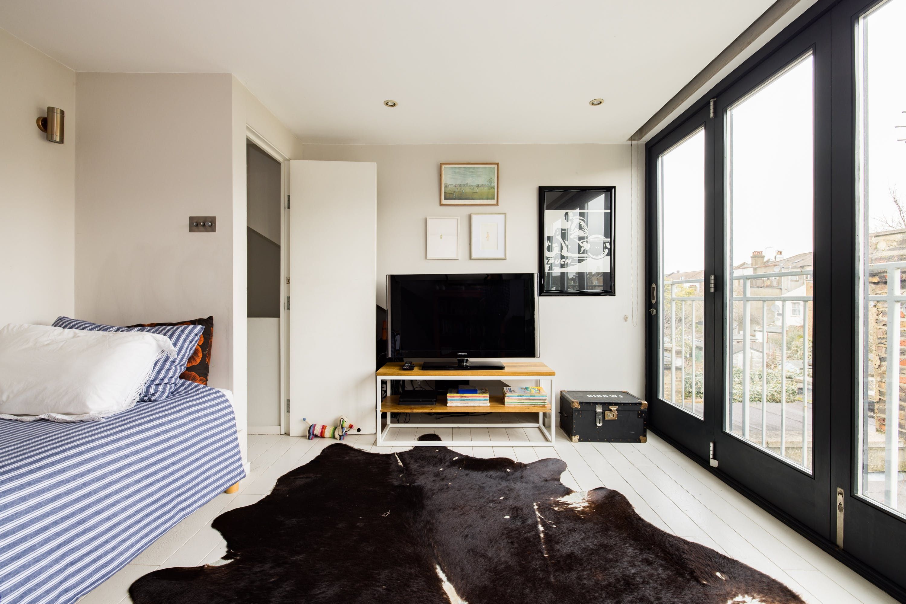 It was a nice surprise to visit this property. Whilst the neighbourhood might not be the most exciting, the interiors certainly make up for it. The kitchen with its bright green steel beams and mid-century furniture has oodles of character. Find two beautiful double bedrooms on the first floor, and up a spiral staircase two fun singles for the kids, with views of neighbouring rooftops. A well-manicured garden is a bonus and children will love the trampoline at the back. The many unique aspects of this space, including the fireplace and artwork, make it a great addition to The Plum Guide.