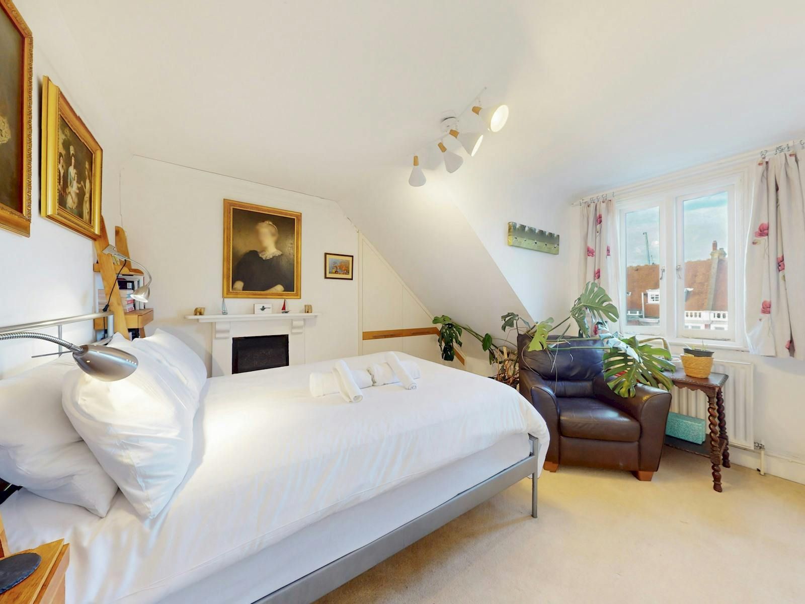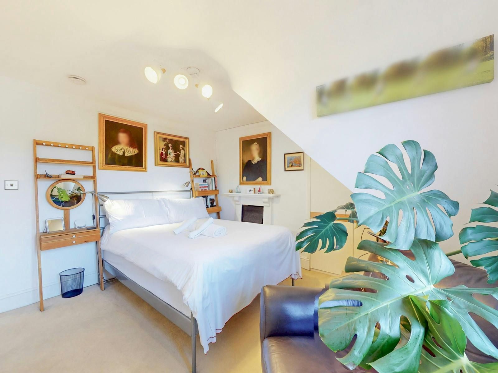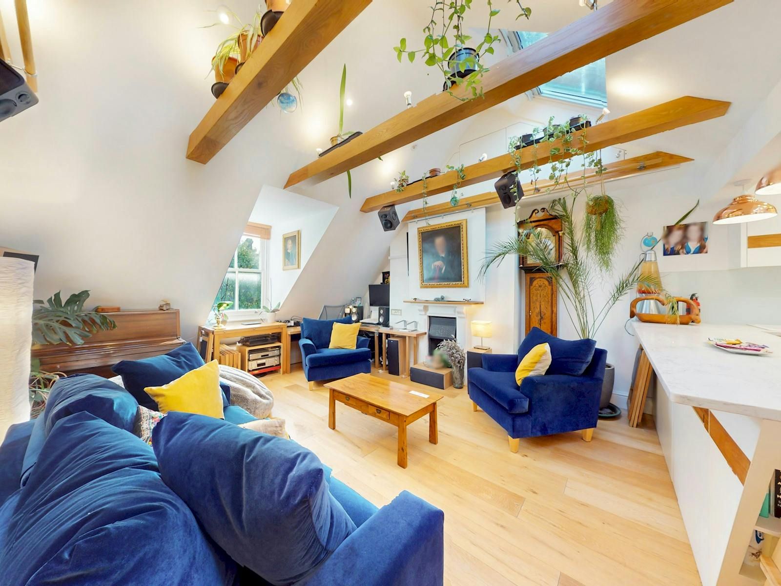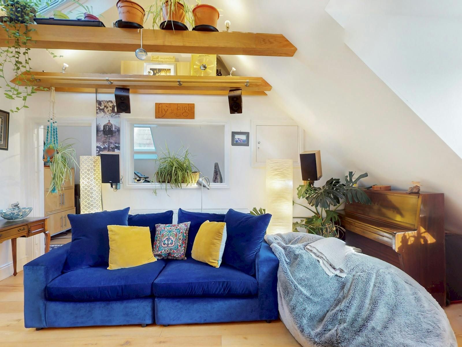 Bursting with plants and exposed beams, this top-floor flat is certainly unique. The style is maximalist and eclectic. It may not be the most modern home, but you can't deny it's cosy. Besides, you'll find everything you need to settle in – a well-appointed kitchen, an ample-sized bedroom, and a living area that invites you to get comfortable. Just note that it's on the third floor of a building without a lift. As for location, you can't do much better than Hampstead. The High Street, flanked by cafes, eateries, pubs, and shops, is a ten-minute stroll away. You're also a stone's throw from a Tube station when you're ready to venture further afield.