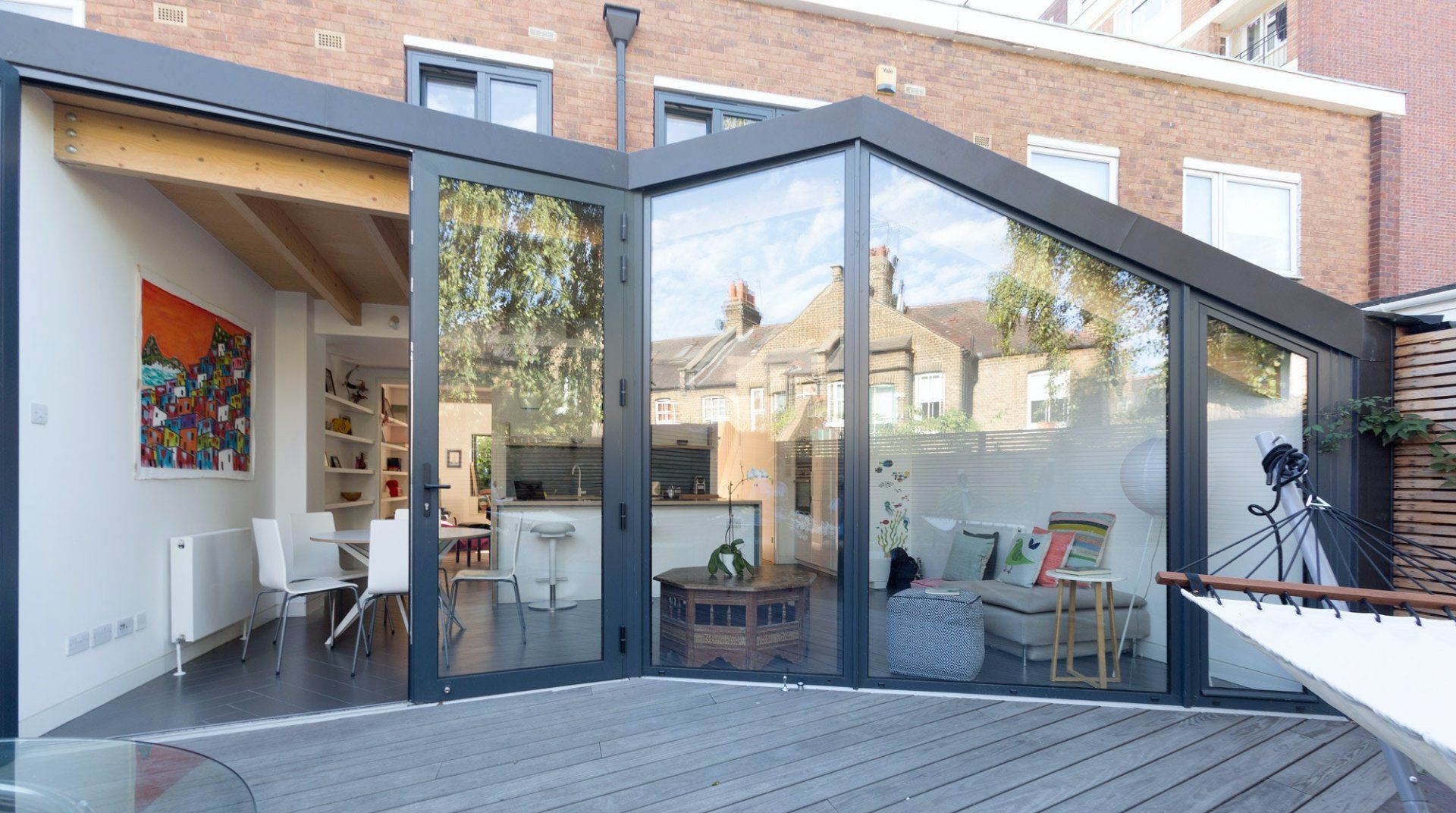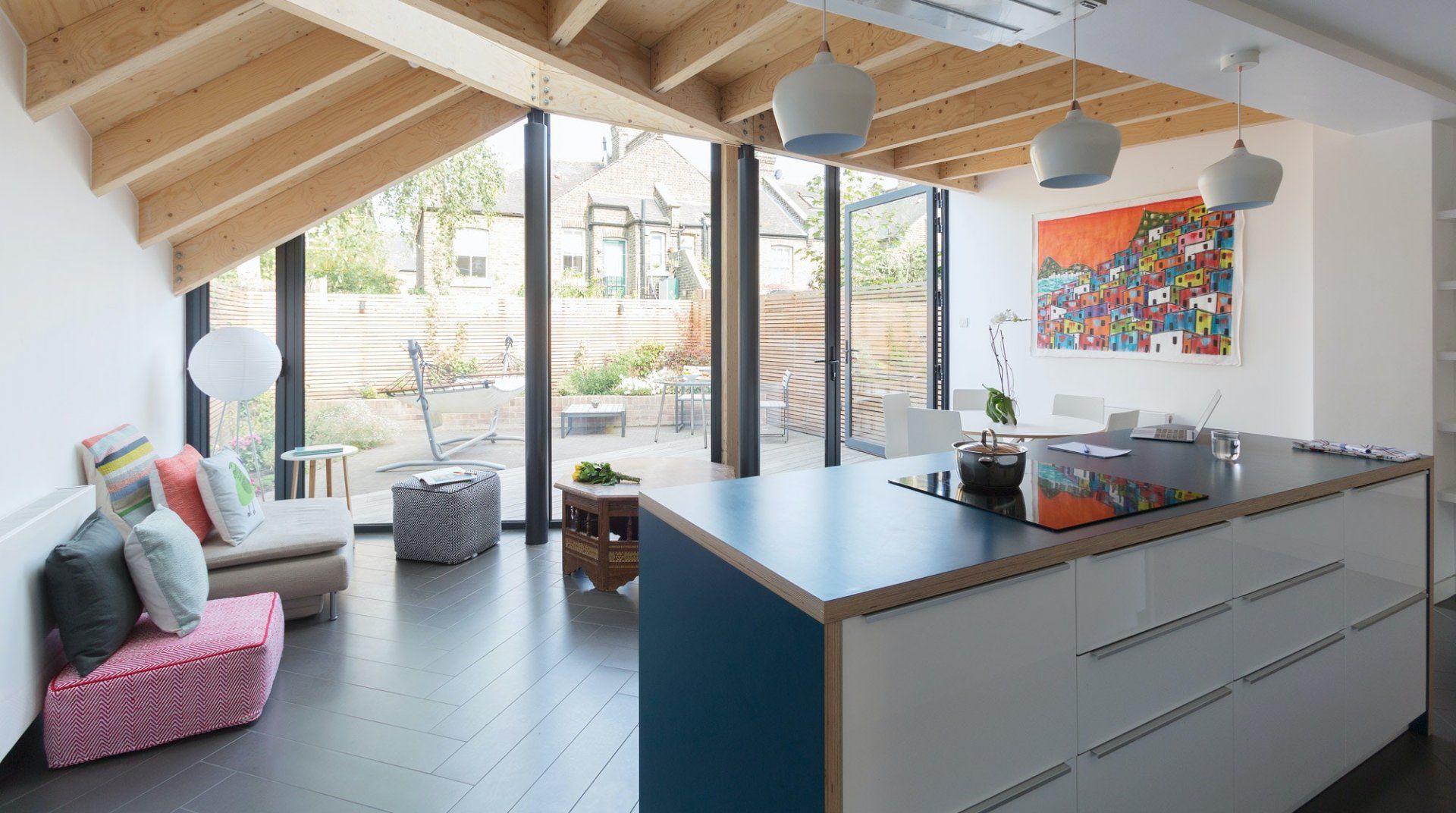 This is a unique house with a distinctive kitchen, that has been extended using geometric shapes. It creates a social space for cooking, reading, sitting and access to the garden. A house with colour and entertainment only 10 mins walk to The Thames.