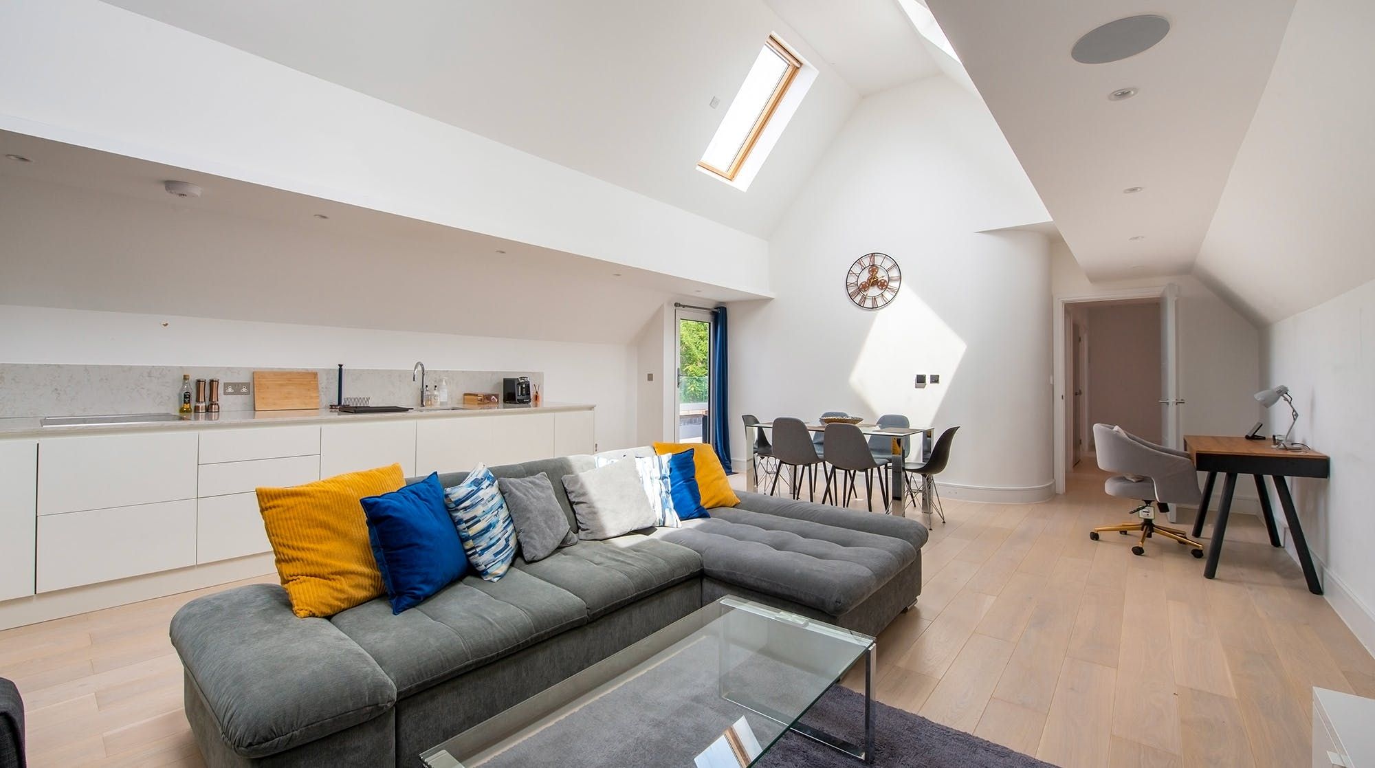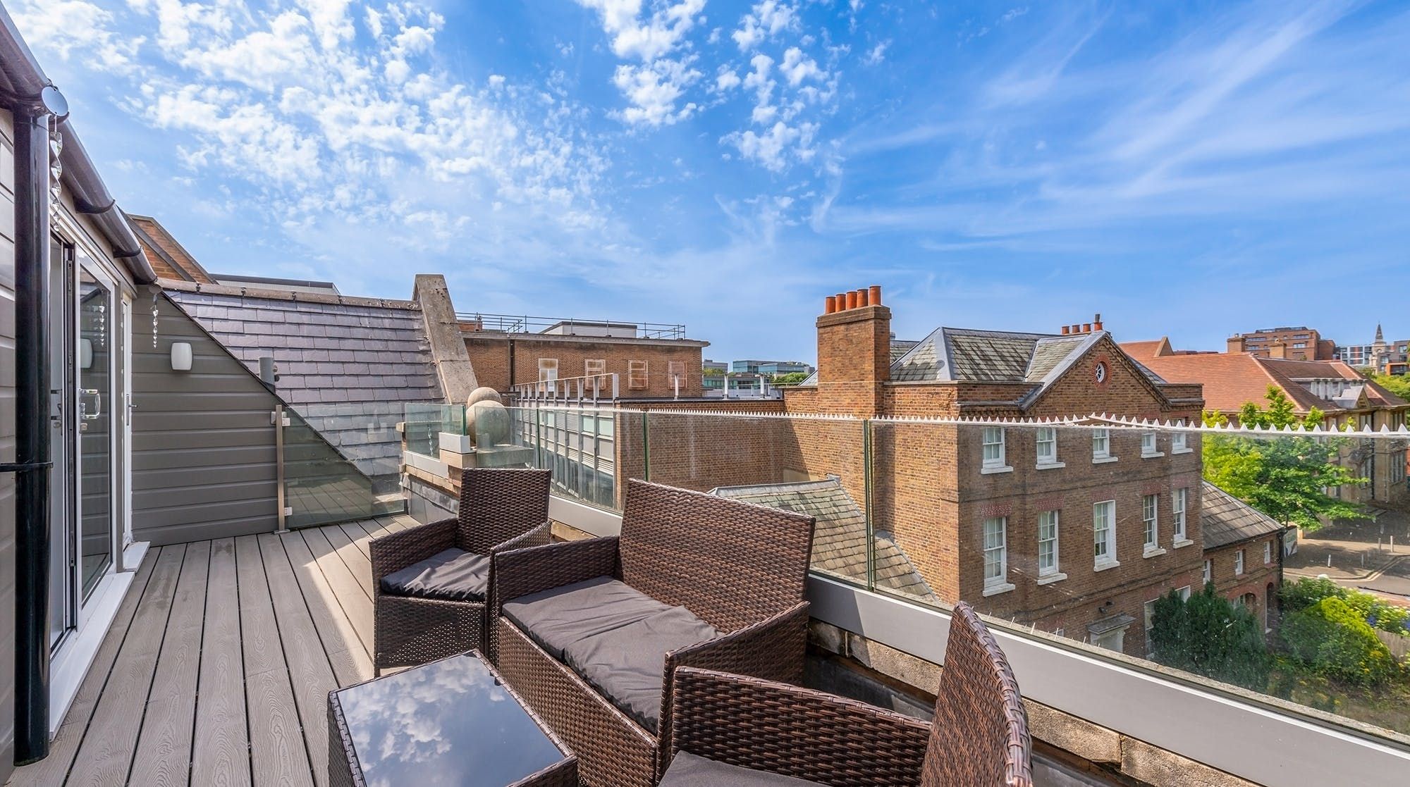 Right on the edge of a verdant park, this modern flat enjoys a peaceful location while being within easy reach of central London. Set on the top floor, it has an airy New York loft feel thanks to vaulted ceilings in the living area, and skylights bathing the room in natural light. Both of the bedrooms have sliding glass doors which lead out onto the balcony, with its treetop views. We love the high-spec features, like the 49-inch smart TV and the boiling water tap in the kitchen, enabling cups of tea in seconds.