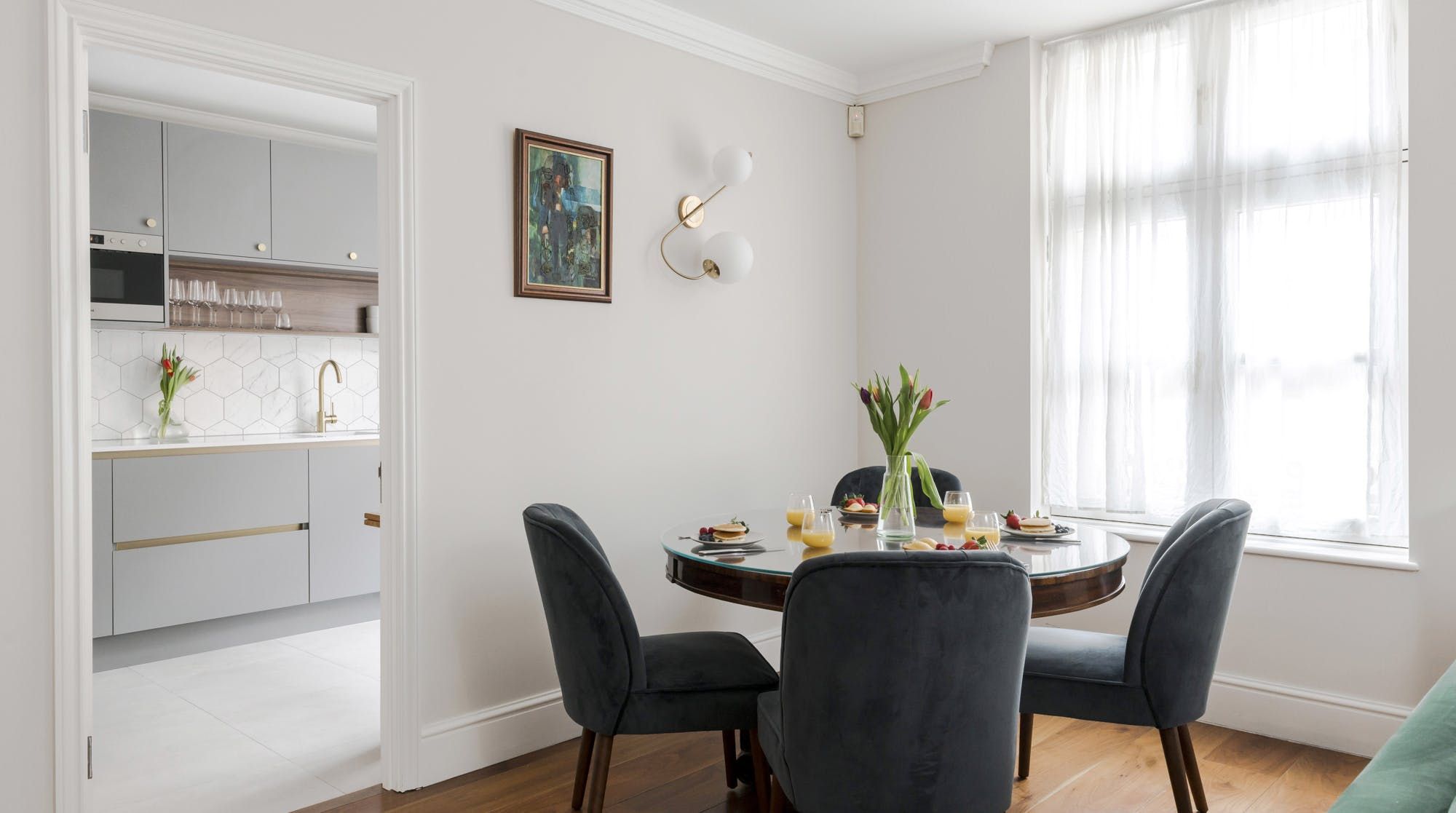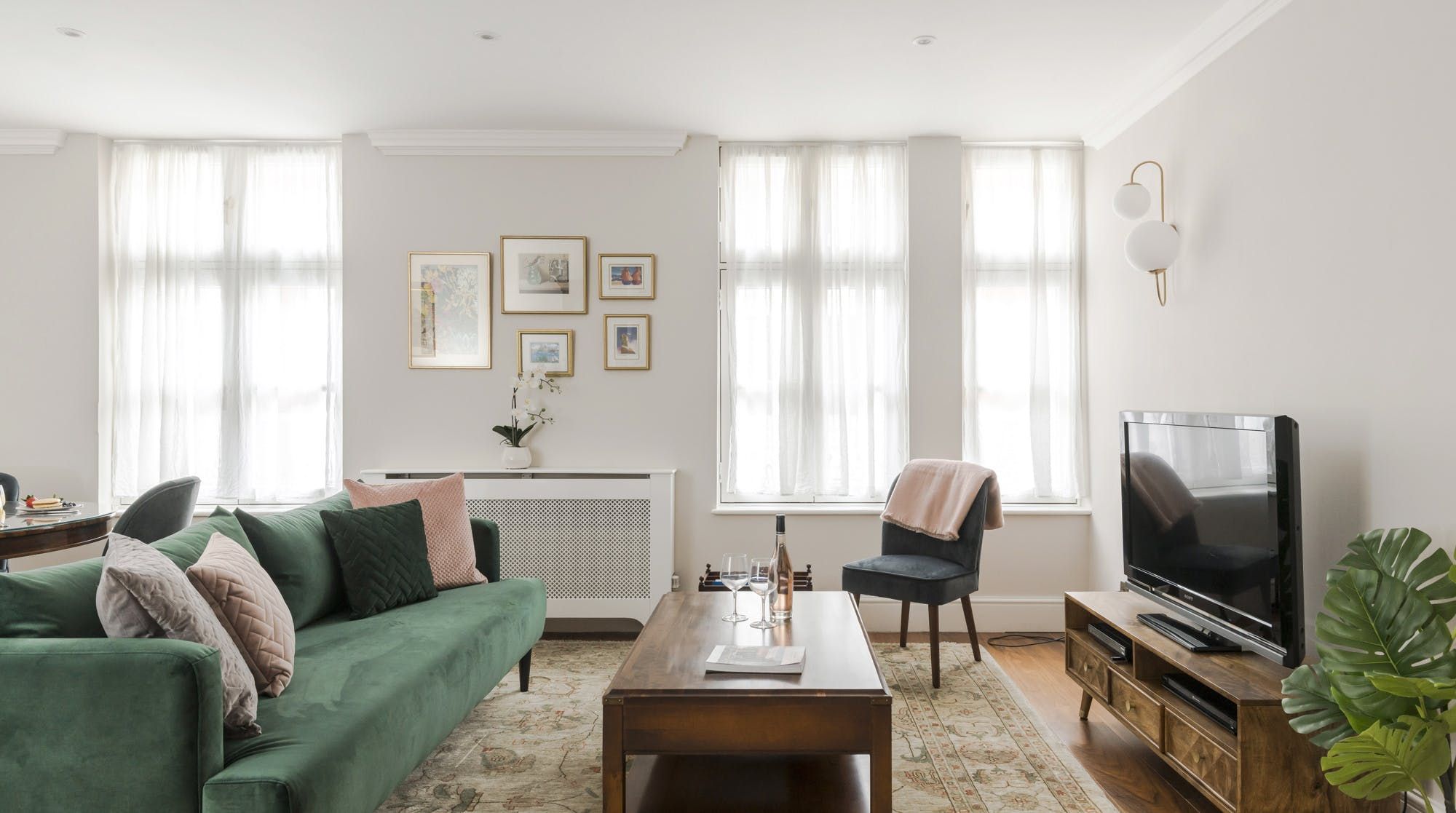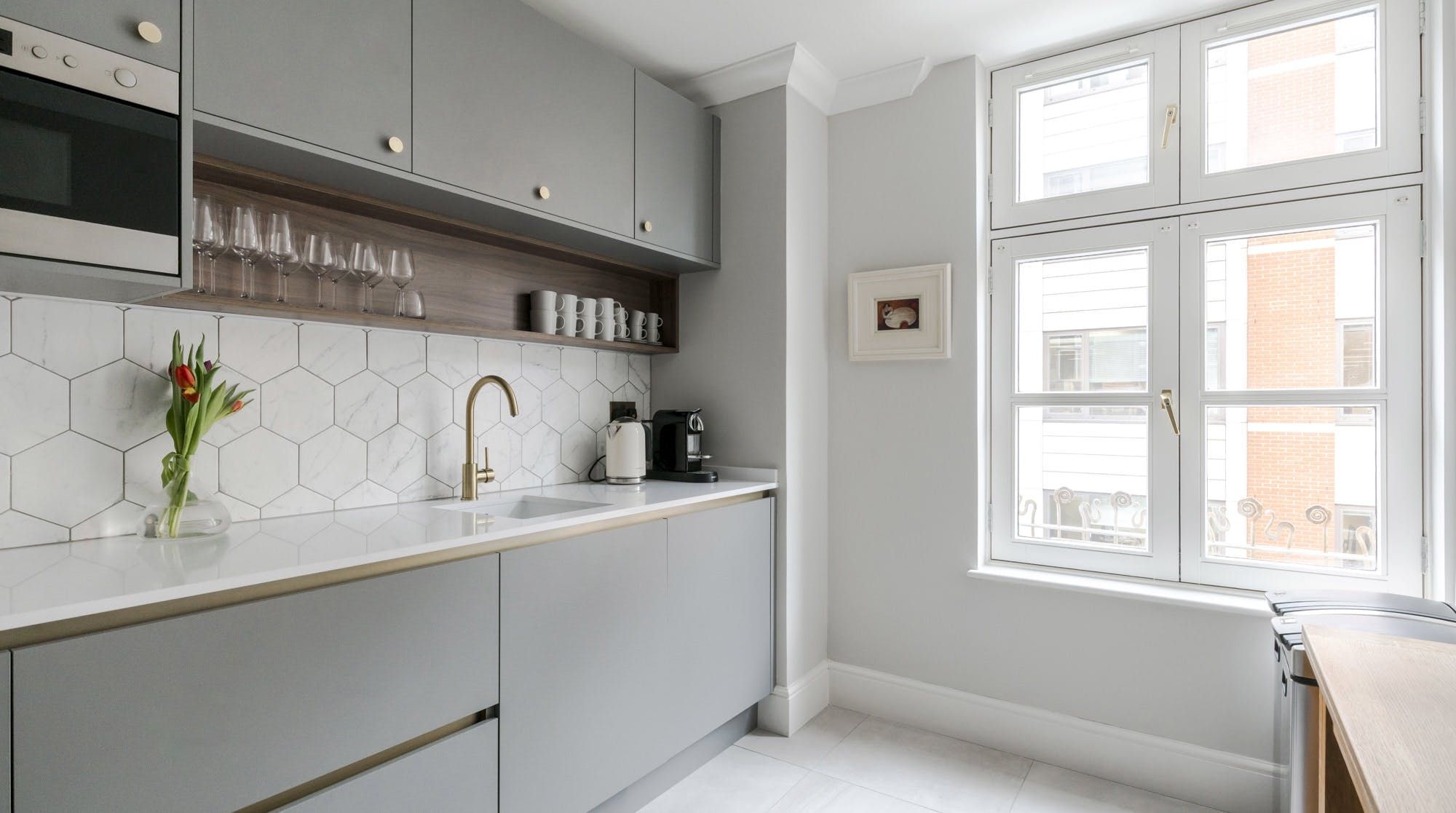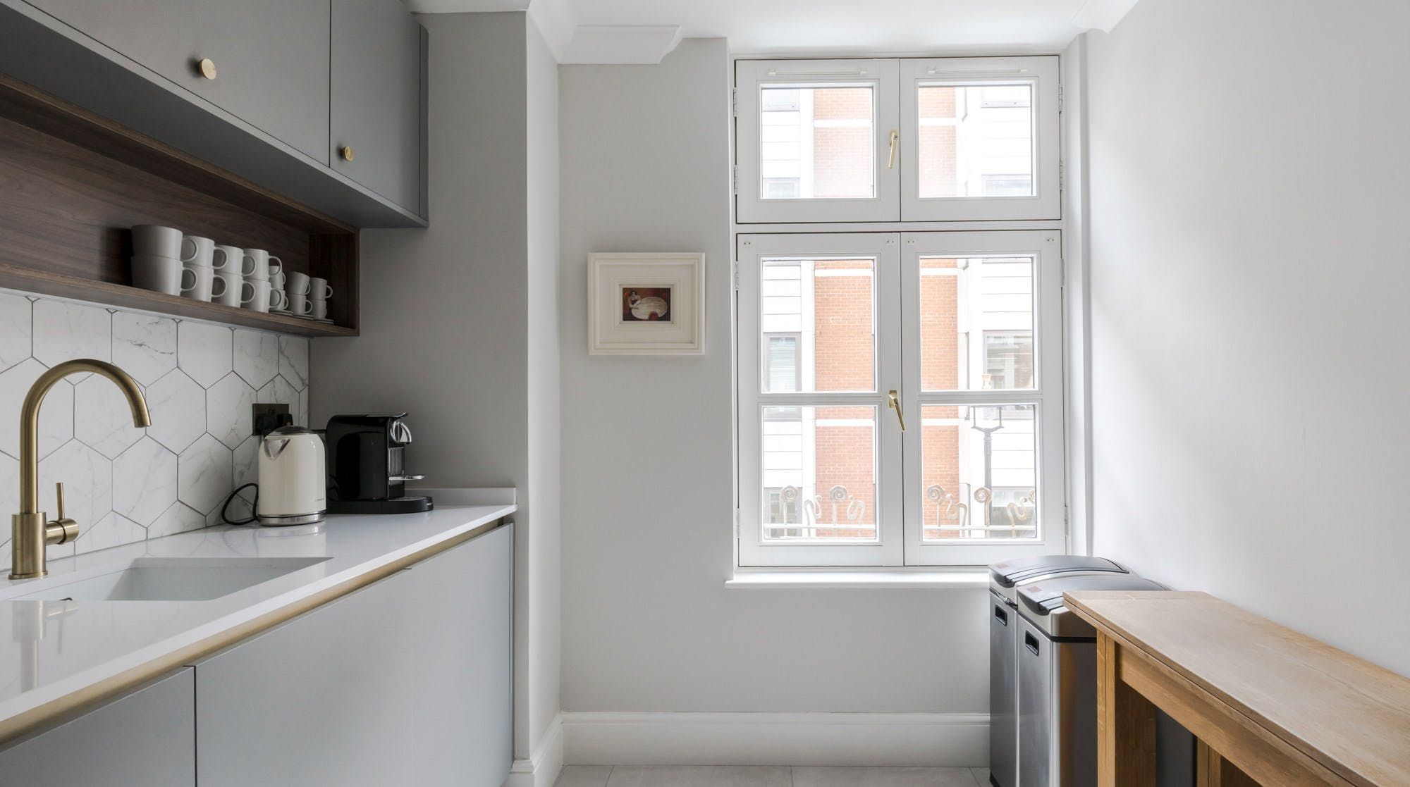 From this traditionally-minded yet well-maintained Mayfair apartment, there's a little taste of luxury in every direction. To your east is Liberty department store and there are further designer shopping options to your north on Bond Street. Head south and in two minutes, you could be on Savile Row, while wandering further west along these embassy-lined streets will get you to Grosvenor Square. However, despite this unbeatable location, we found this home to be extremely peaceful and a welcome refuge from the non-stop going-ons of Central London. The chic kitchen was a highlight here, with smart brass finishes contrasting nicely with honeycomb marble tiling, but let's not kid ourselves — with this many renowned restaurants only a short stroll away, don't be surprised if this home's oven remains undisturbed during the duration of your stay.
