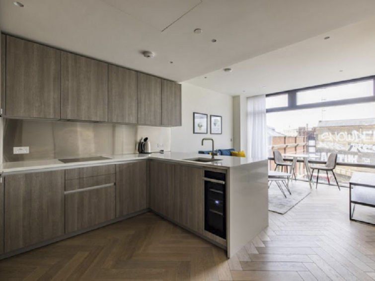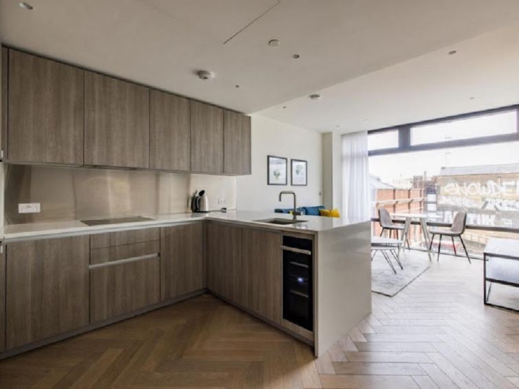 "Liverpool Street, Shoreditch", 2-room apartment 40 m2. Modern and tasteful furnishings: living/dining room with dining table and TV (flat screen). 1 double bedroom with 1 double bed. Kitchen-/living room (4 hot plates, oven, dishwasher, toaster, kettle, freezer, combination microwave).