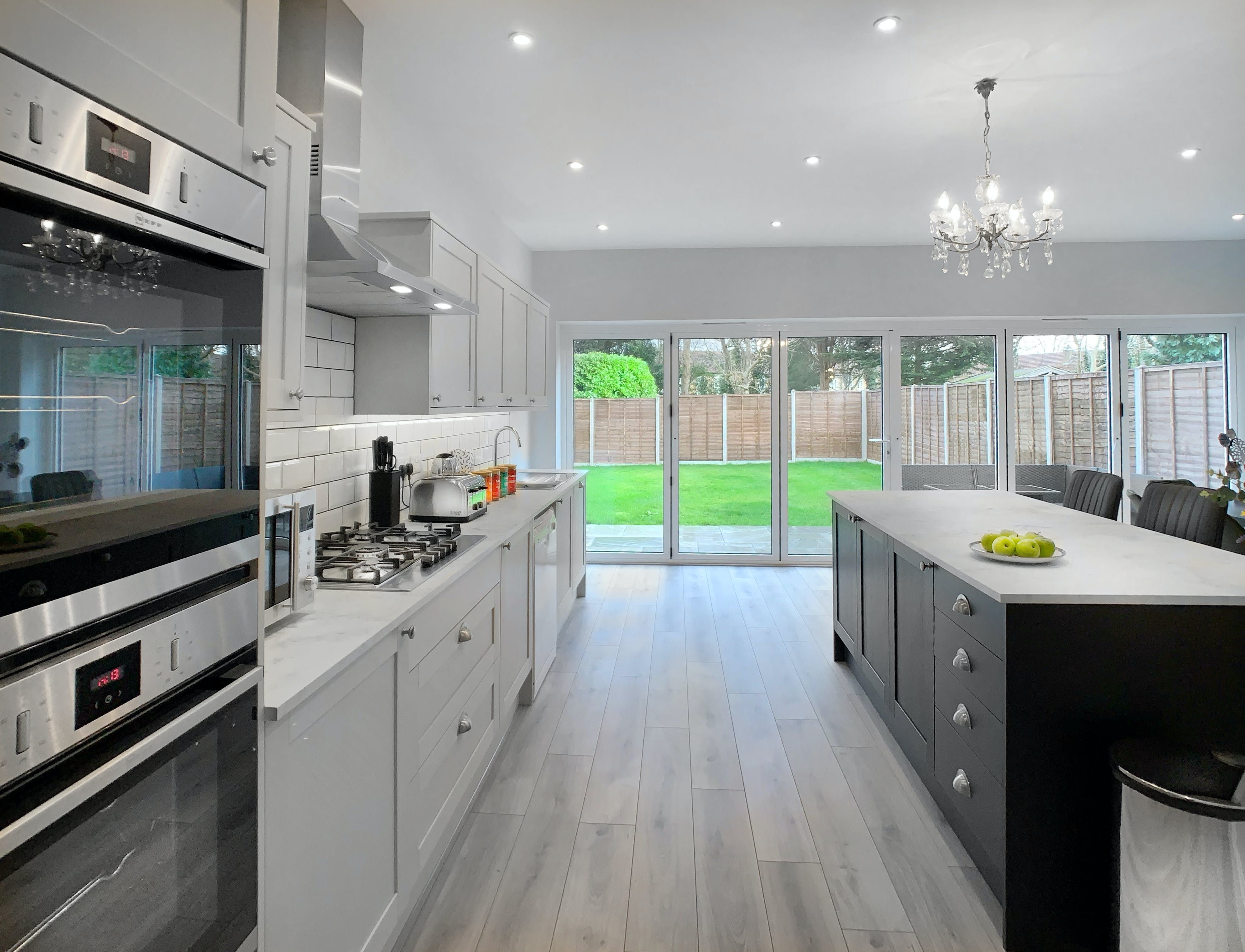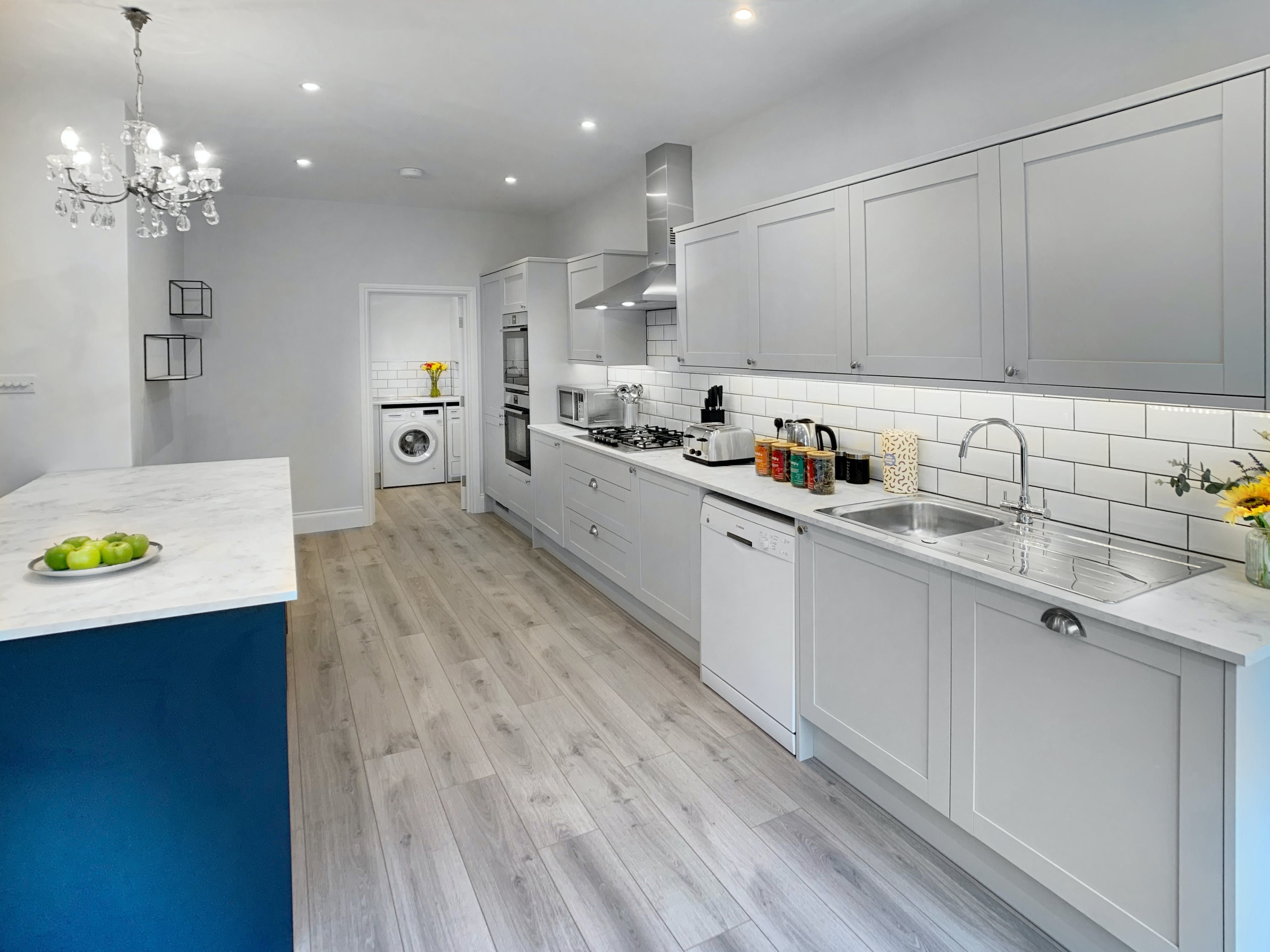 Set over three floors, the four bedrooms are cosy and comfortable, while the open plan living space downstairs is the perfect place for relaxing together. Glass bi-fold doors span the length of the living area, filling the space with natural light and opening out onto a large back garden, perfect for running around in or simply relaxing with a cocktail.