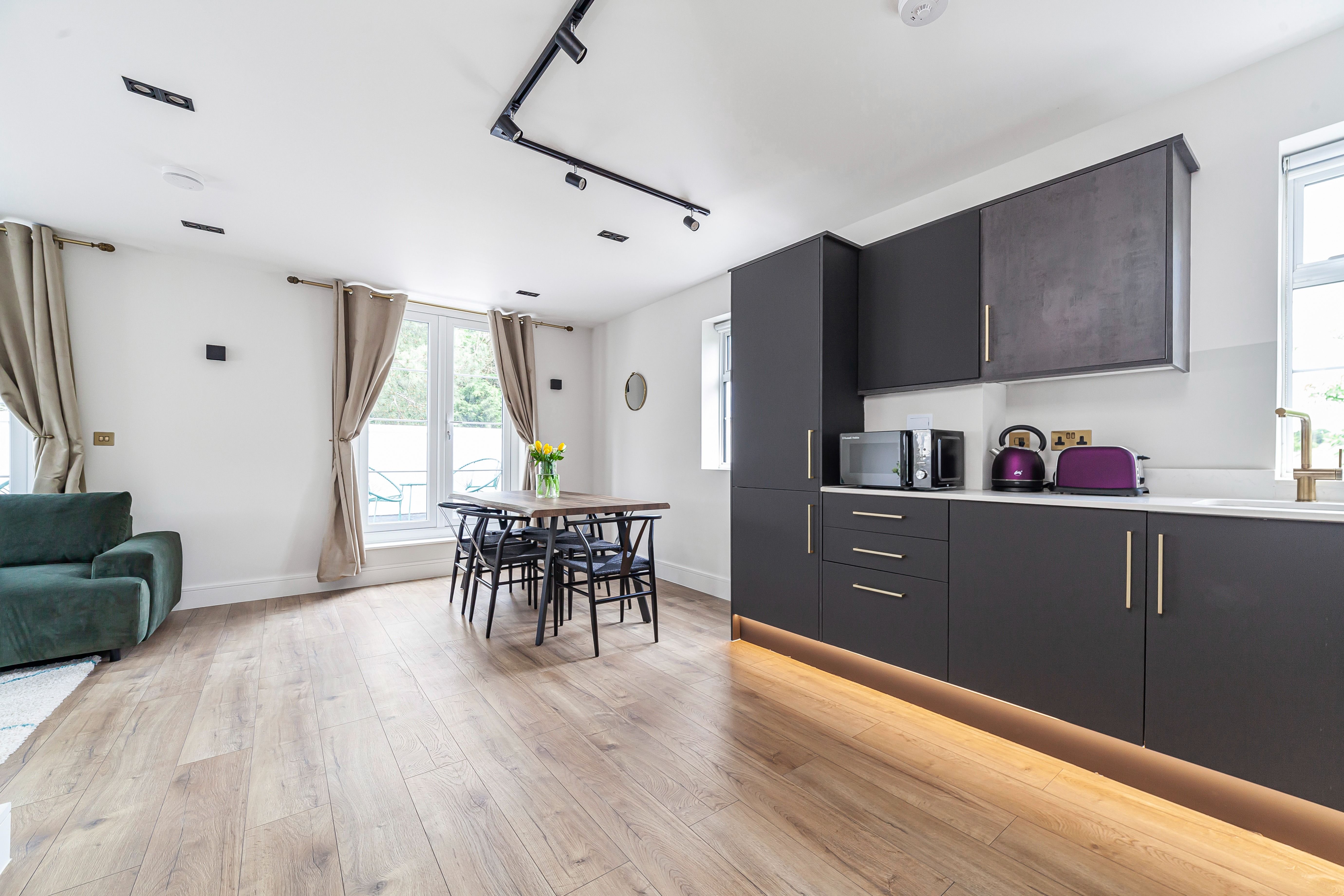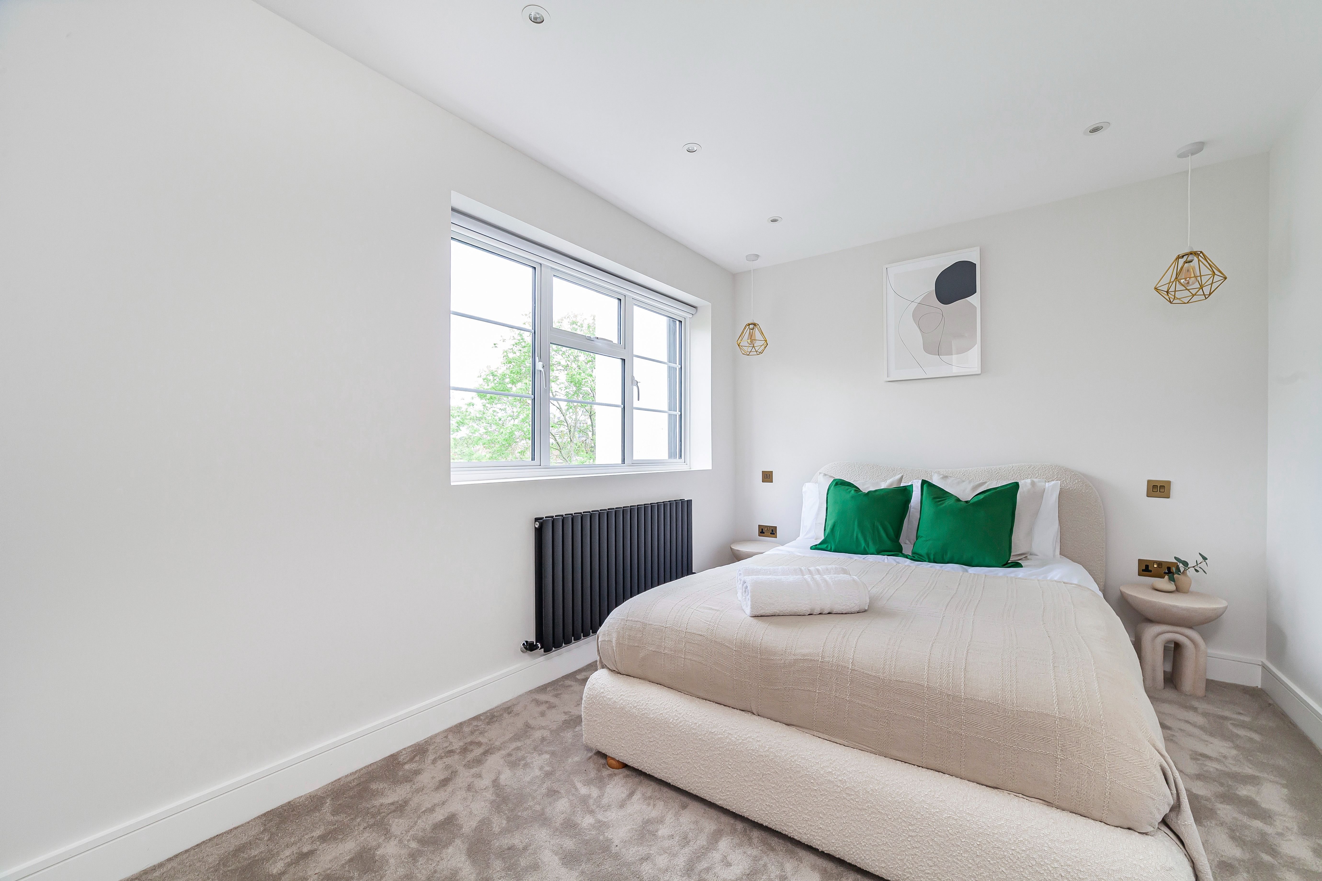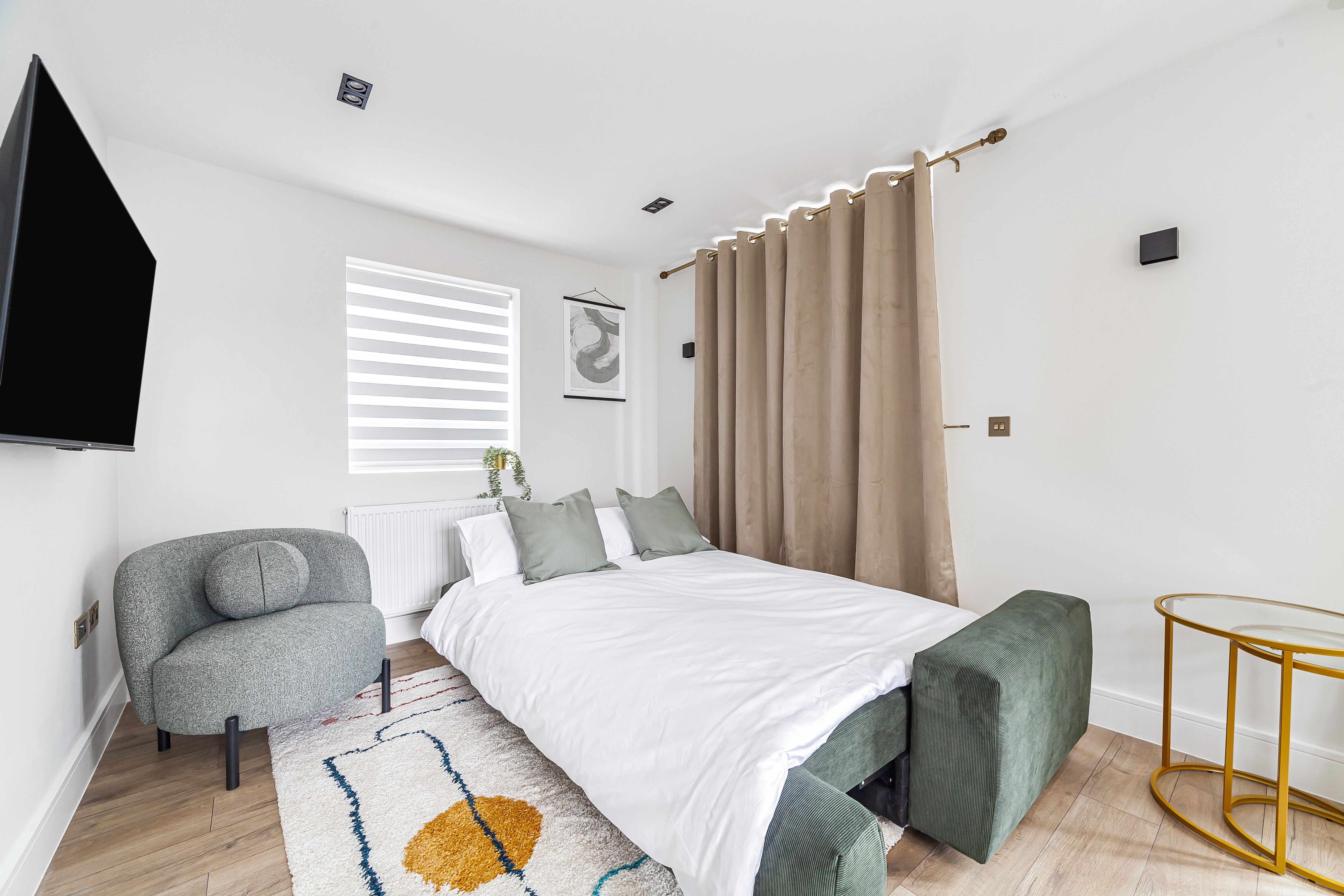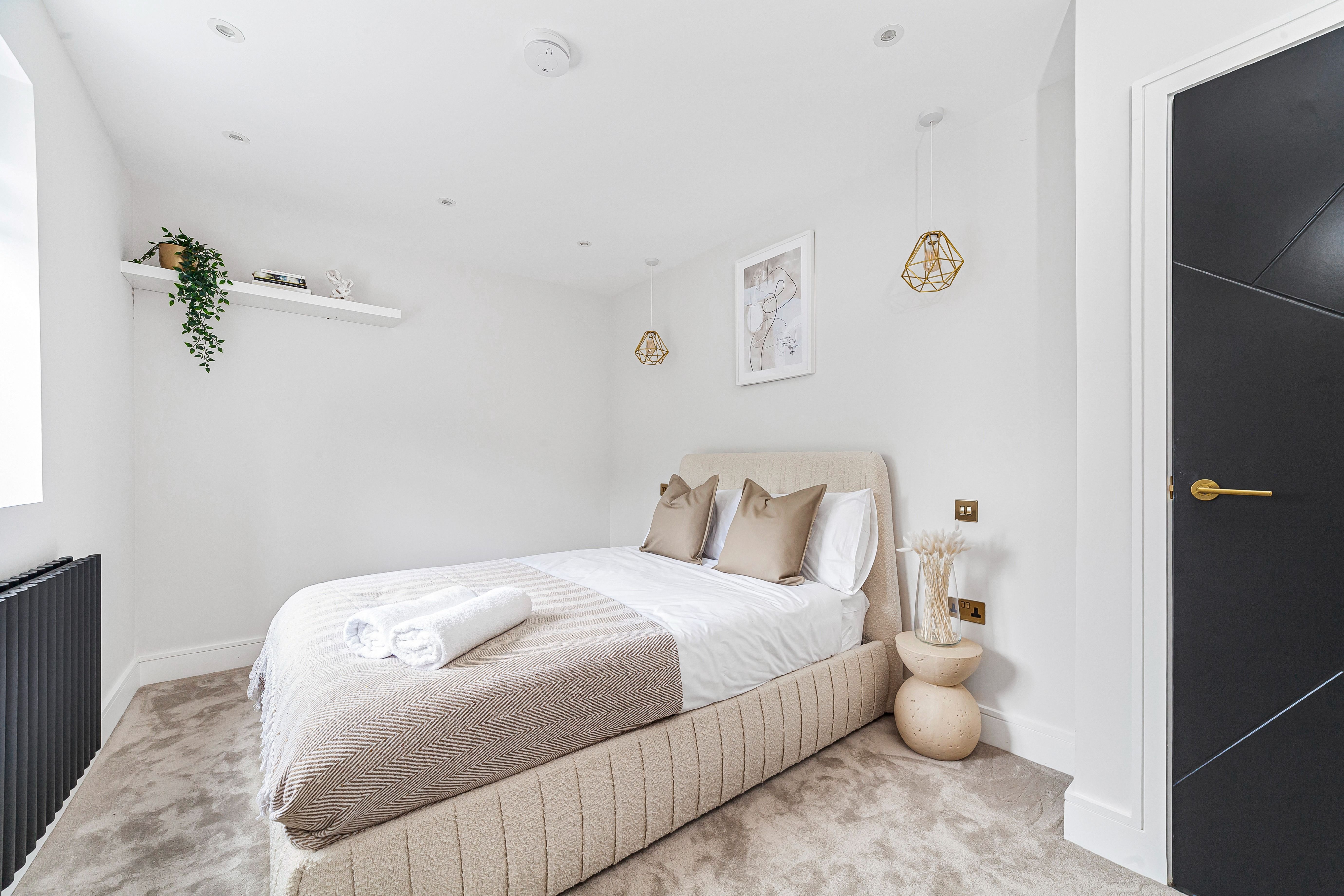 You’ll find this smart and thoughtfully designed apartment in the heart of Wembley. Outside, it’s just a short stroll to Preston Road tube station – making it easy to connect with central London. You can stroll to local restaurants, cafes and shops. Paid parking is also available and your host is on hand to help organise extras like airport transfers. It’s worth noting the apartment is on the second floor with no lift access, but once inside you’ll find it easy to switch off and unwind. There’s a balcony for evening drinks and the living room works perfectly for cosy movie night’s. The main bedroom also comes with an en-suite bathroom for optimum privacy.