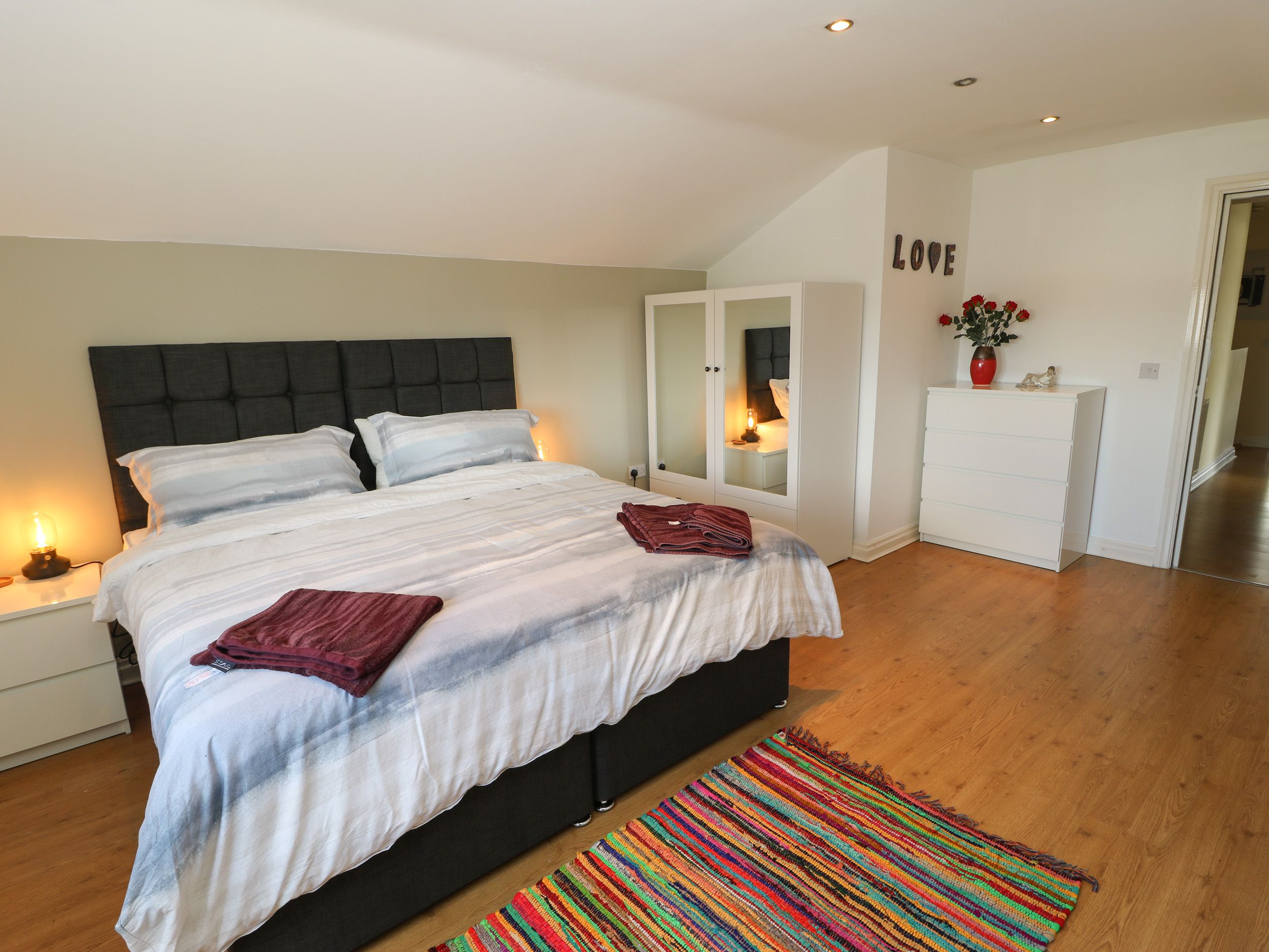 Accomodation Details First-floor apartment. One super-king-size bedroom (zip/link, can be twin on request) with TV. Bathroom with bath, shower over, basin and WC. Open-plan living space with kitchen, dining area and sitting area. Utility