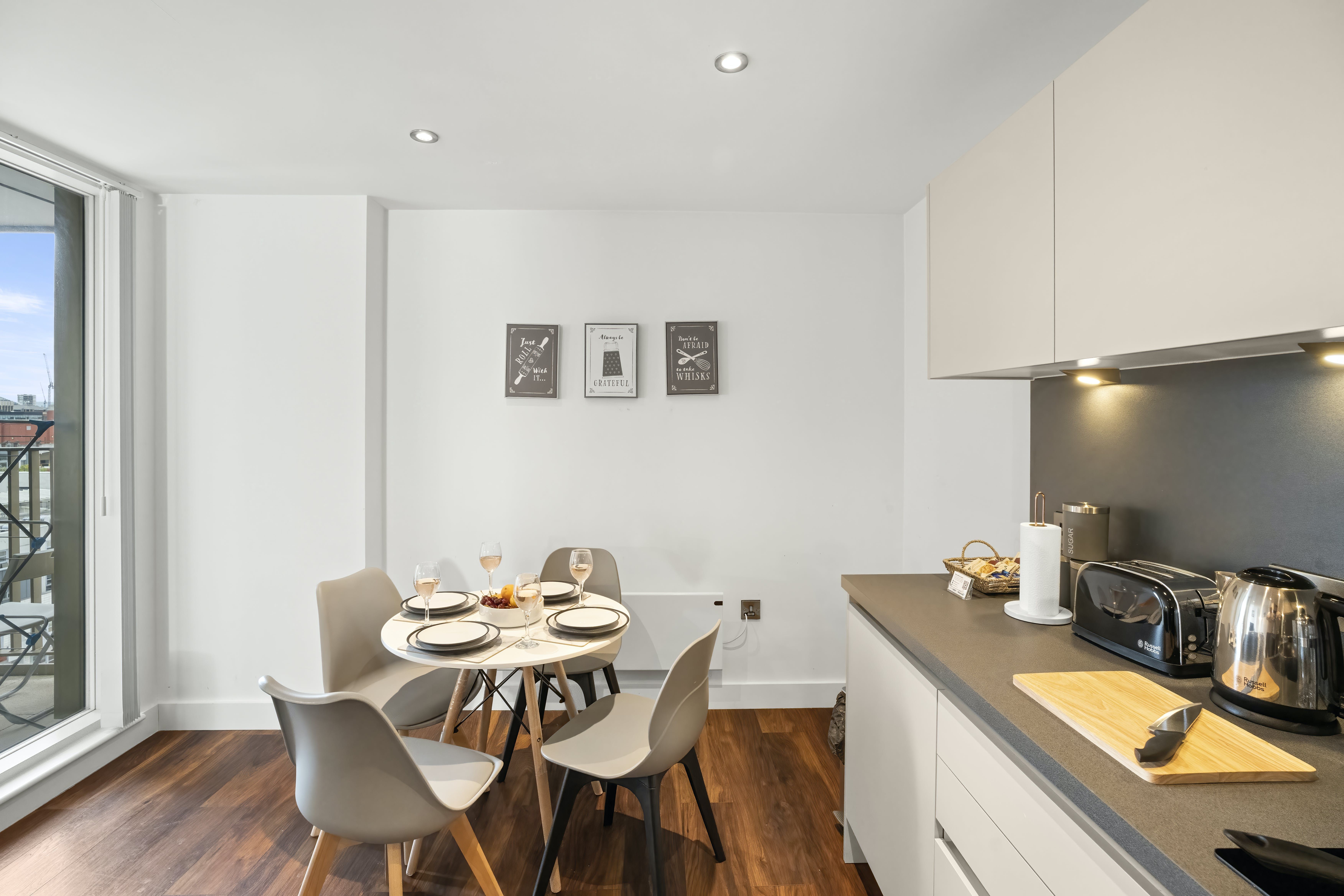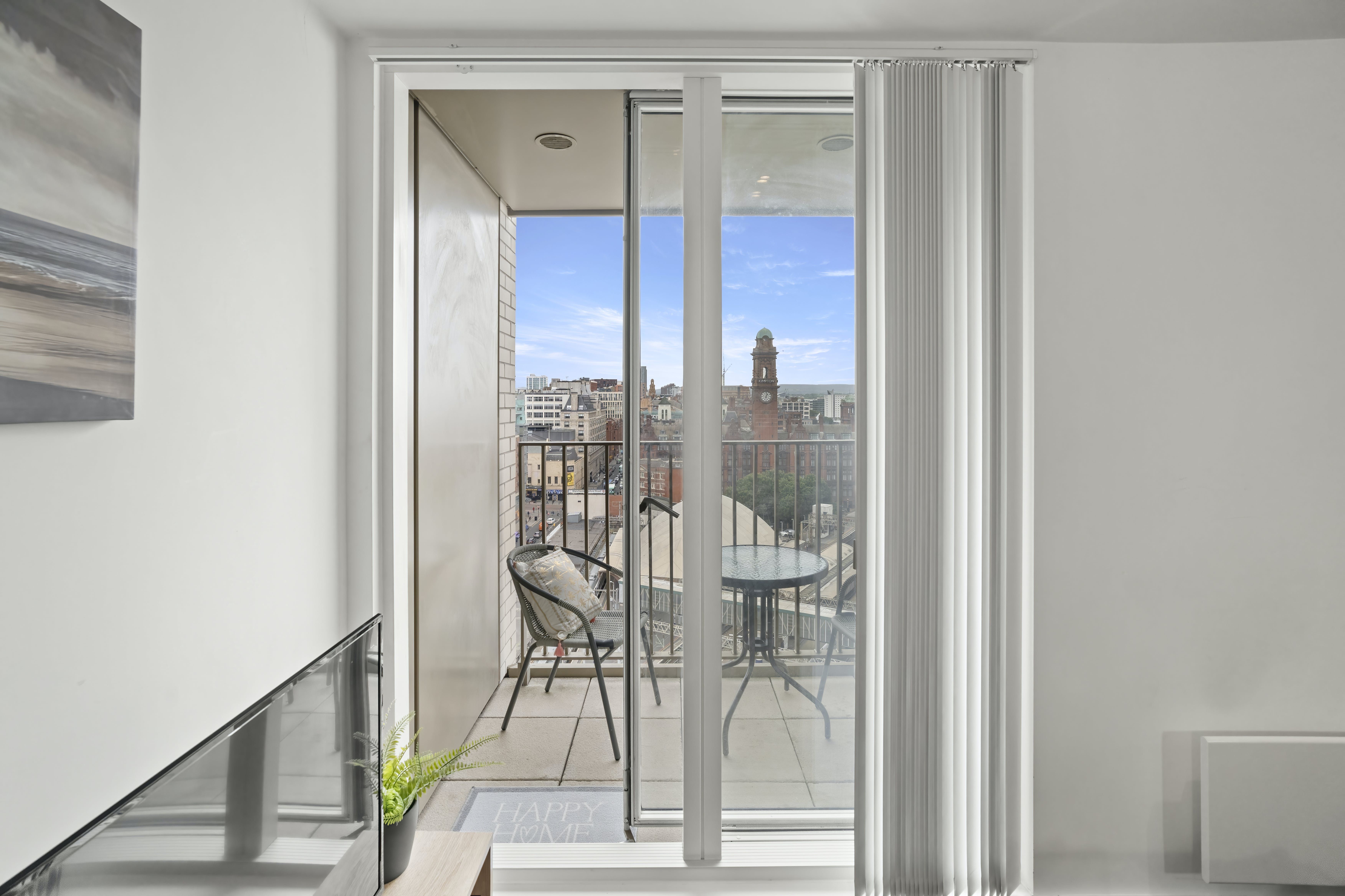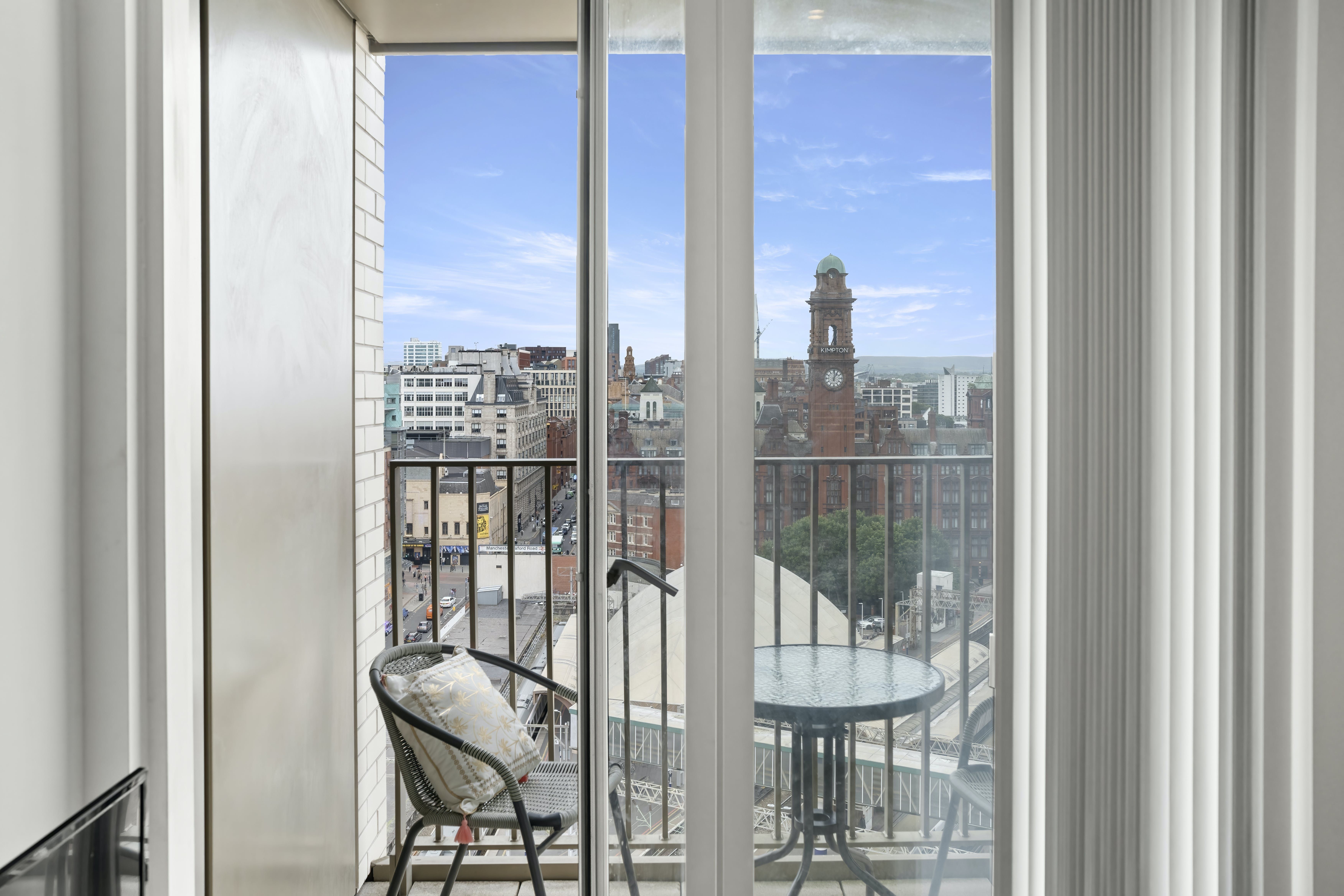 Perched high above Manchester's Oxford Road Station, this stylish apartment blends contemporary comforts with a bang-on location. One step inside and we bet you'll make a beeline for the balcony – and we don't blame you if you do. With vistas across the city and a bird's-eye view of the train station, it's a sweet spot to unwind no matter the time of day. We can easily picture ourselves out here with a cup of coffee in the morning sun or ending the evening with a glass of wine or a local ale as the night rolls in.
