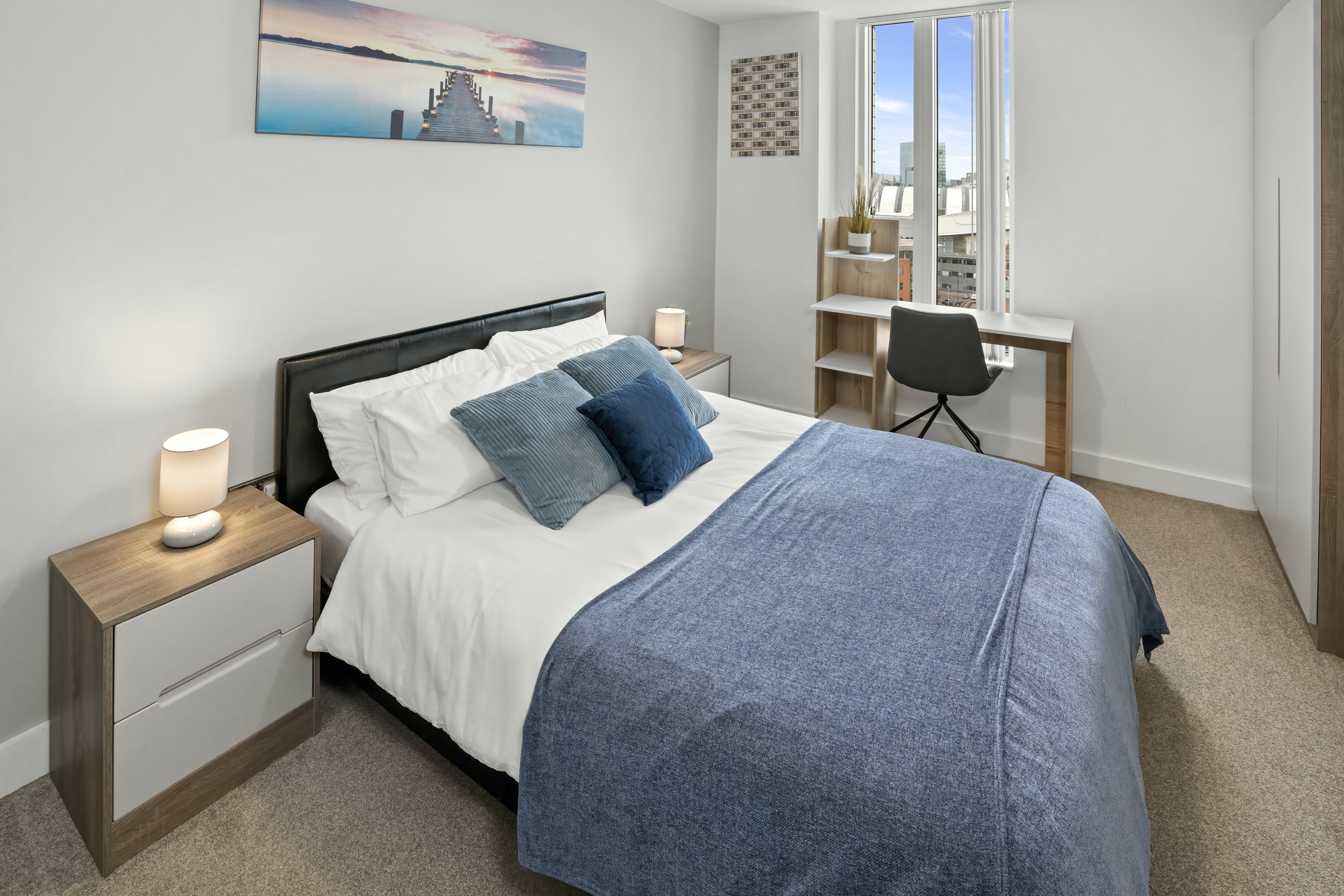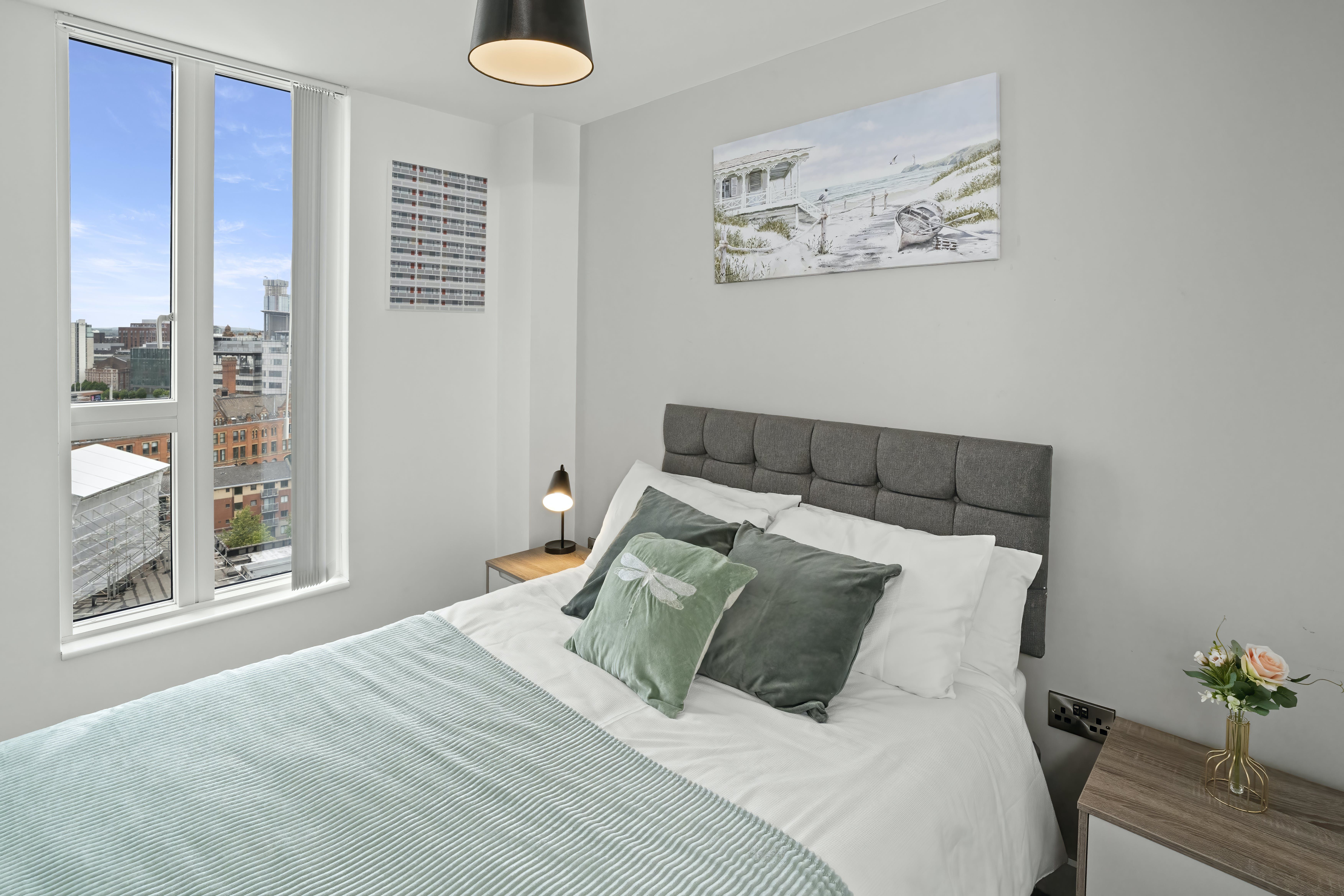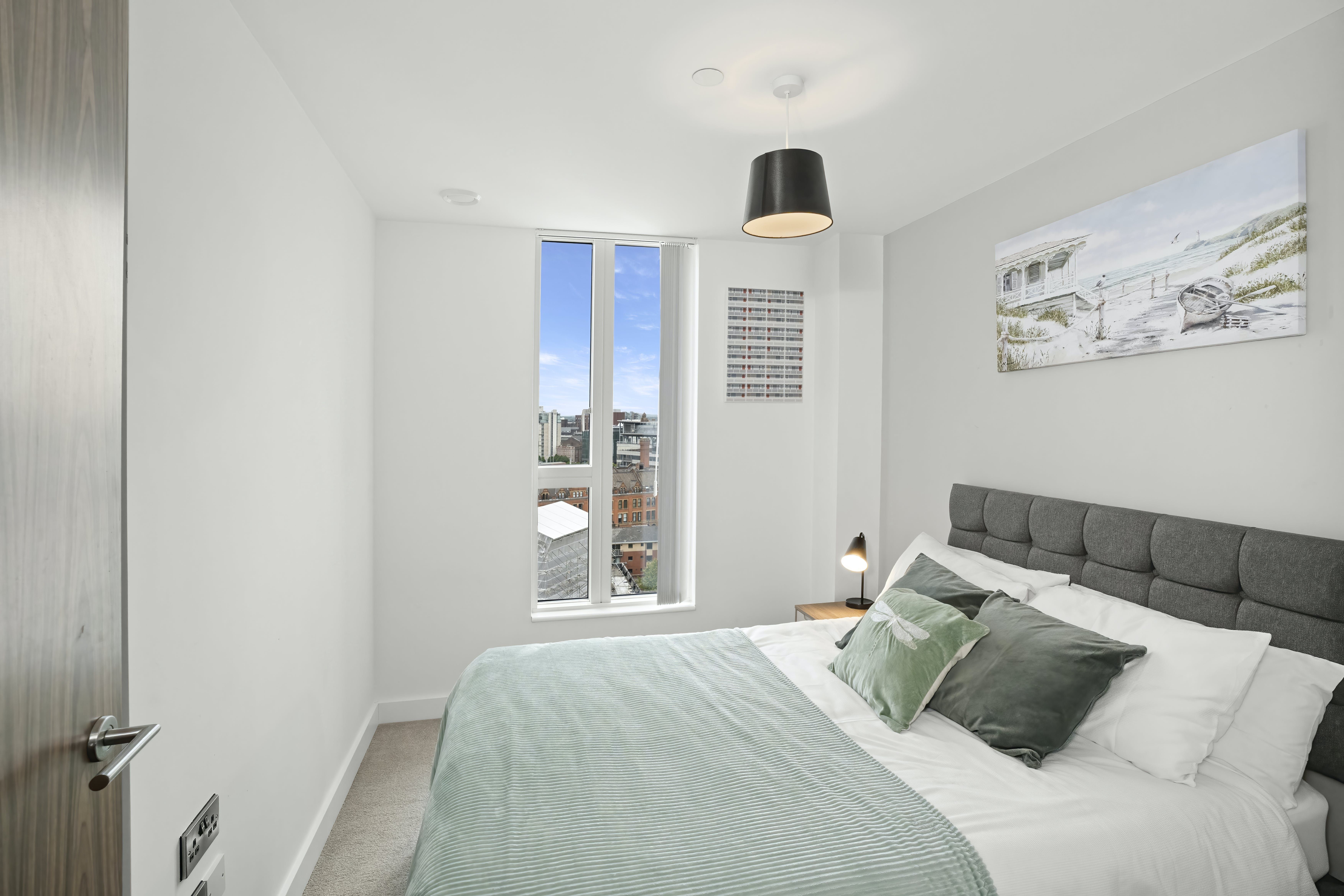 Perched high above Manchester's Oxford Road Station, this stylish apartment blends contemporary comforts with a bang-on location. One step inside and we bet you'll make a beeline for the balcony – and we don't blame you if you do. With vistas across the city and a bird's-eye view of the train station, it's a sweet spot to unwind no matter the time of day. We can easily picture ourselves out here with a cup of coffee in the morning sun or ending the evening with a glass of wine or a local ale as the night rolls in.