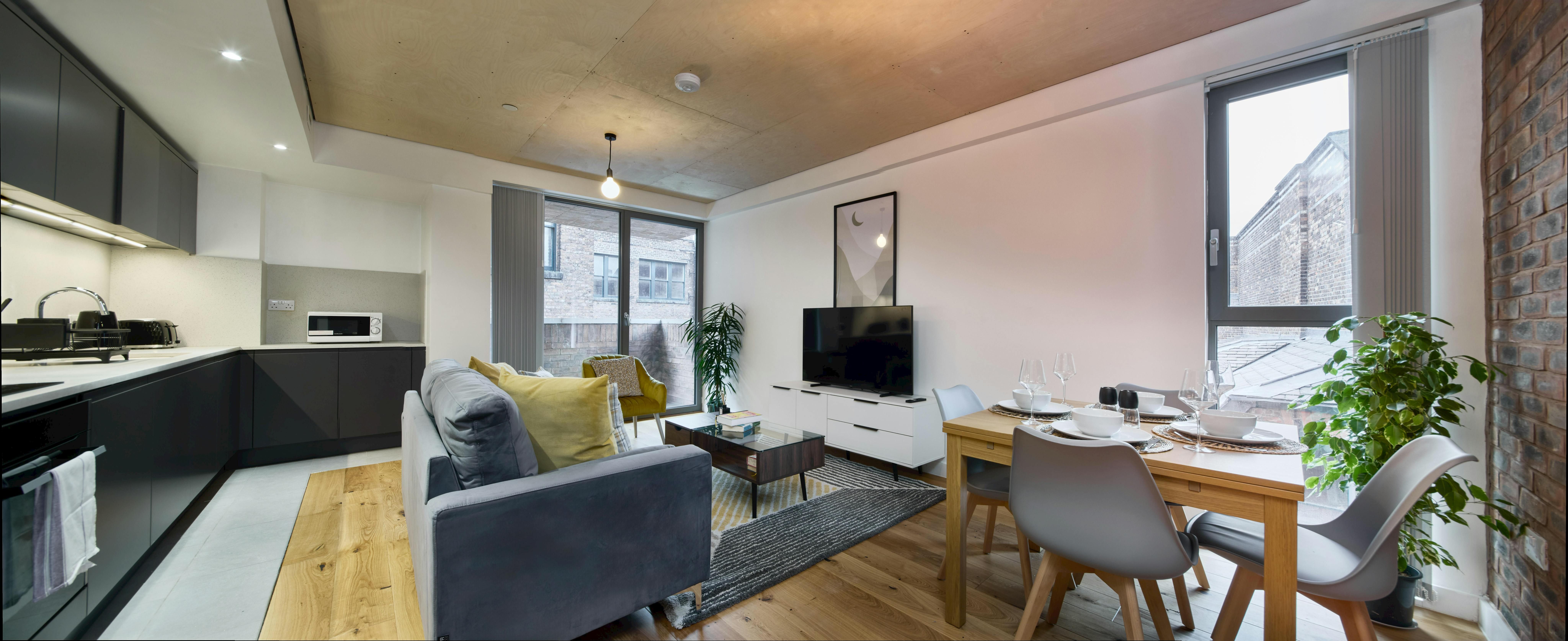 This cosy apartment is set within Finlay’s Yard, one of Manchester’s landmark new developments in the vibrant Northern Quarter. With independent boutiques, street art, and buzzing cafés right on your doorstep, it’s a brilliant base for a memorable stay in Manchester. The open-plan layout includes a comfy lounge and a fully equipped kitchen with premium appliances. It's compact, but convenient, ideal for small groups. You're within walking distance of Piccadilly Station, Manchester’s universities, and top shopping spots, making it easy to enjoy everything the city has to offer.