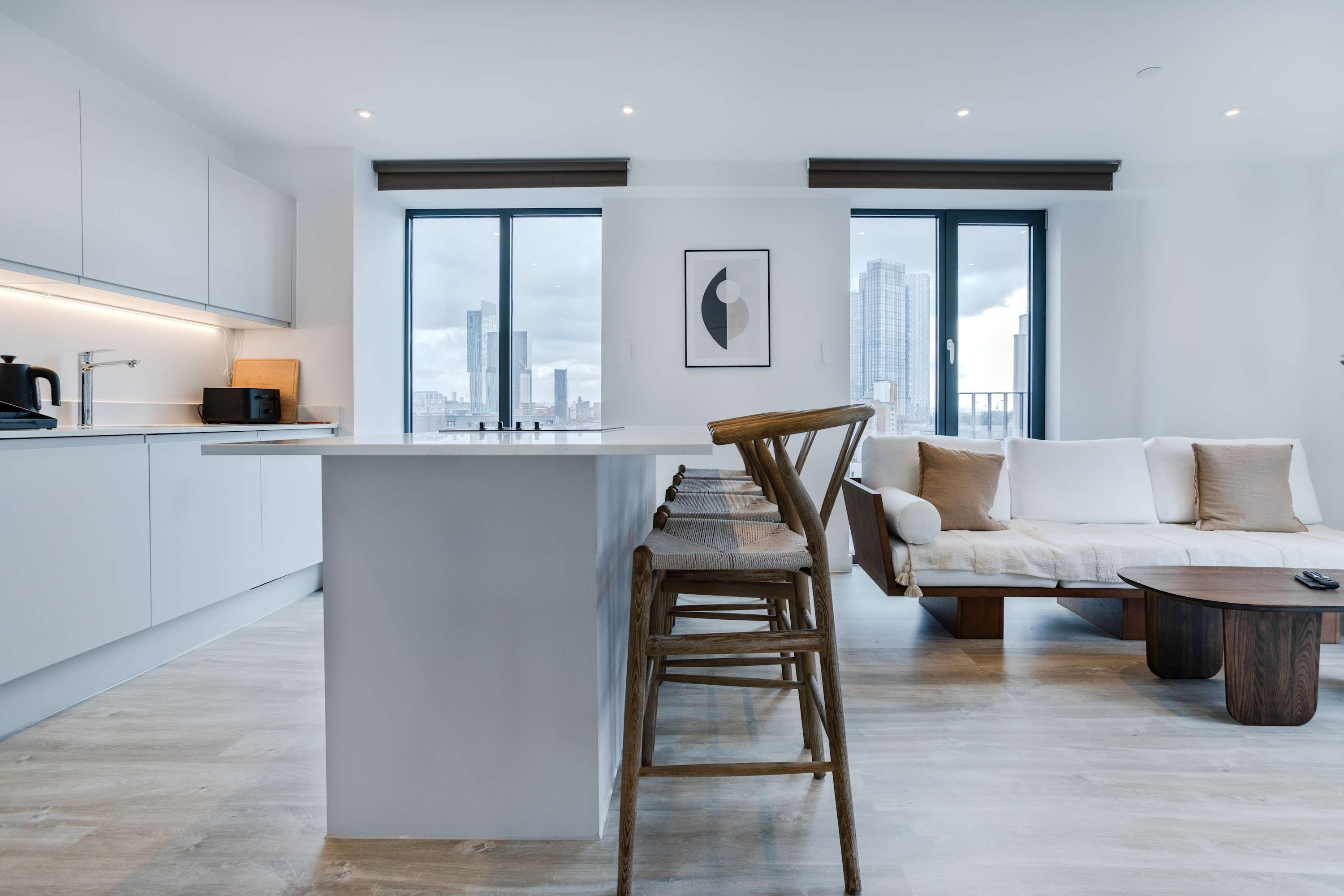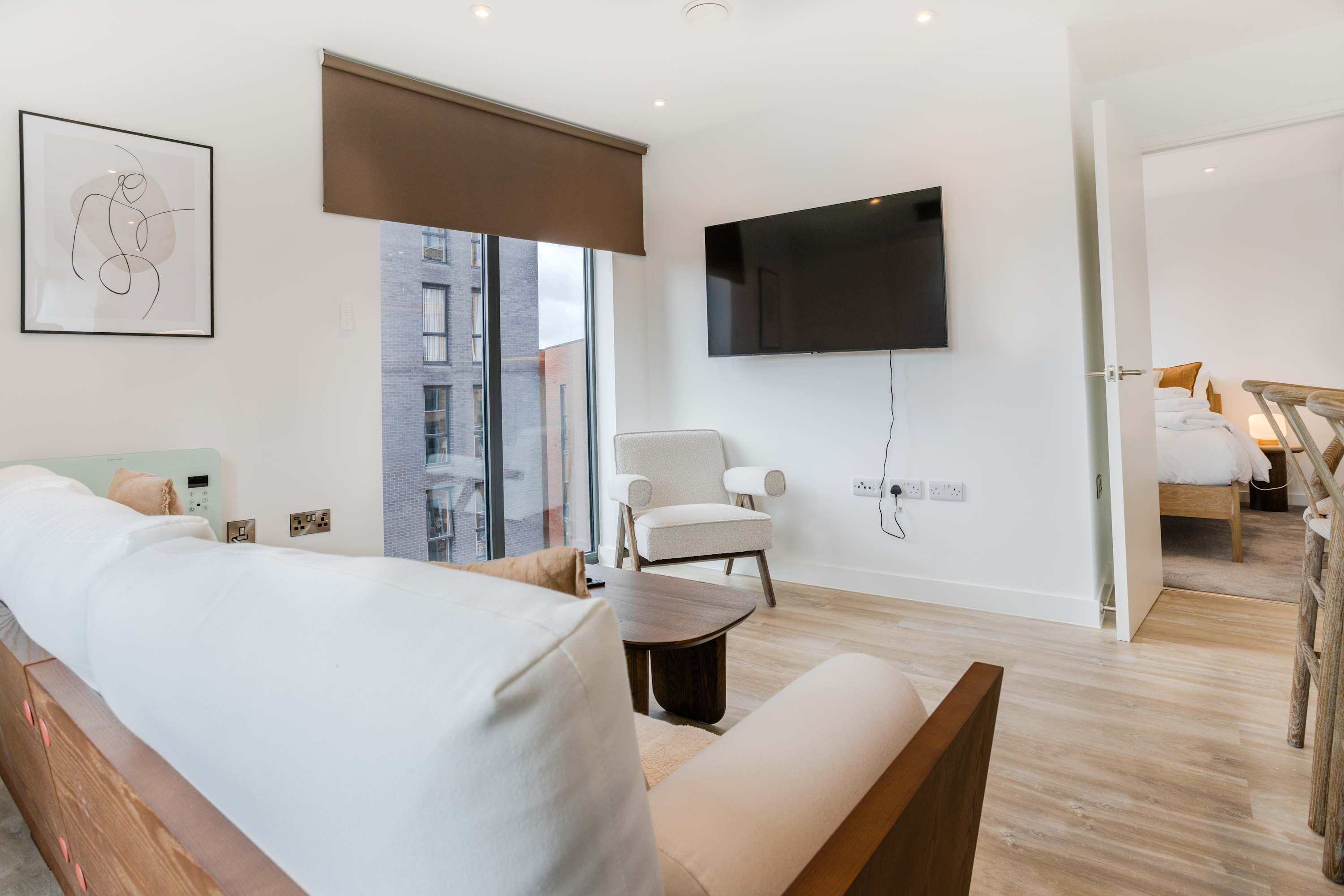 Soak up sweeping skyline views from this sleek 8th-floor apartment in one of Manchester’s newest developments. The building’s shared amenities – including a gym, residents' lounge, and co-working space make daily routines feel elevated. Plus, there’s a generous open-plan layout, hotel-quality linens on the beds, and a fully equipped kitchen for meals as delicious at home. Parking isn’t included here, but with tram links, taxis, and key attractions all a short walk away, you might not miss having the car with you.