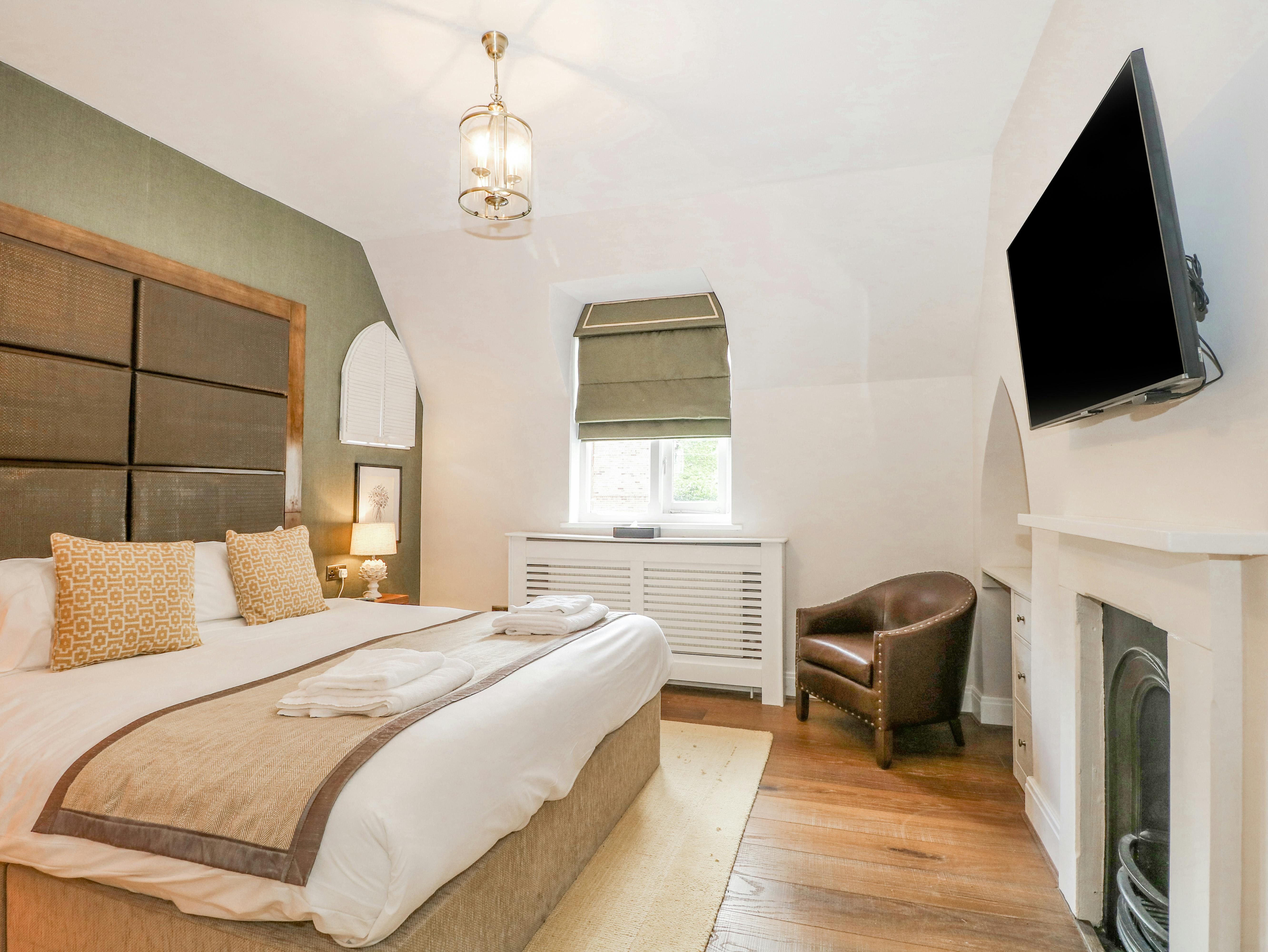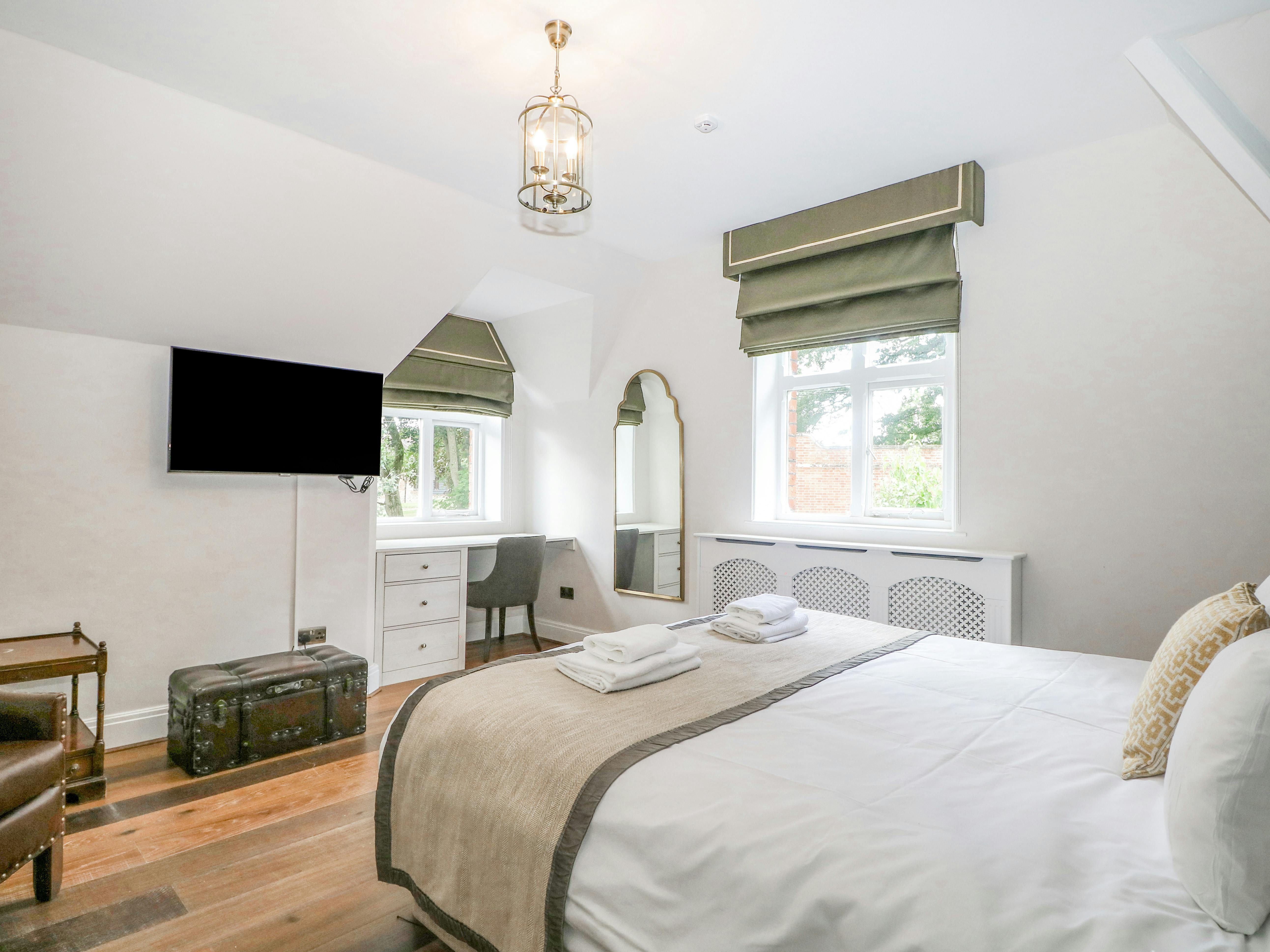 Found on the grounds of Elvetham Hotel, a former country house with a croquet lawn, this period cottage marries pleasant touches with an unusual layout. The social areas all receive plenty of light, the living room moving through the kitchen and dining area to the outdoor utility are. While the two upstairs bedrooms offer king-size beds and feel inviting, the annex bedroom has proven an issue for some guests, starting with the sofa bed that's on the smaller side. You'll not only have access to the pleasant green lawn and its seating area, but the hot tub as well, while the hotel's larger gardens can also be accessed. For day trippers, Swinley Forest is thirty minutes away by car.