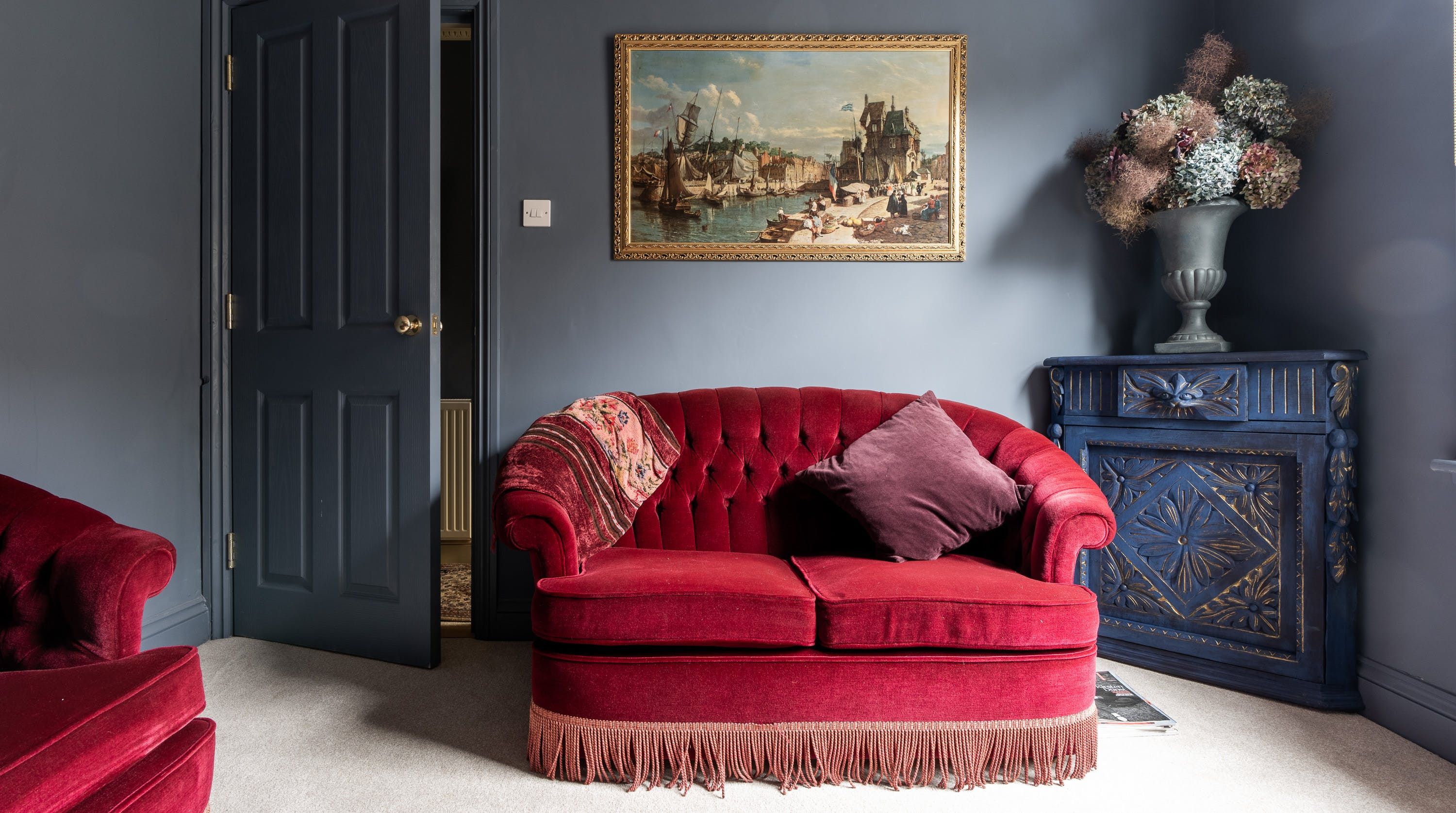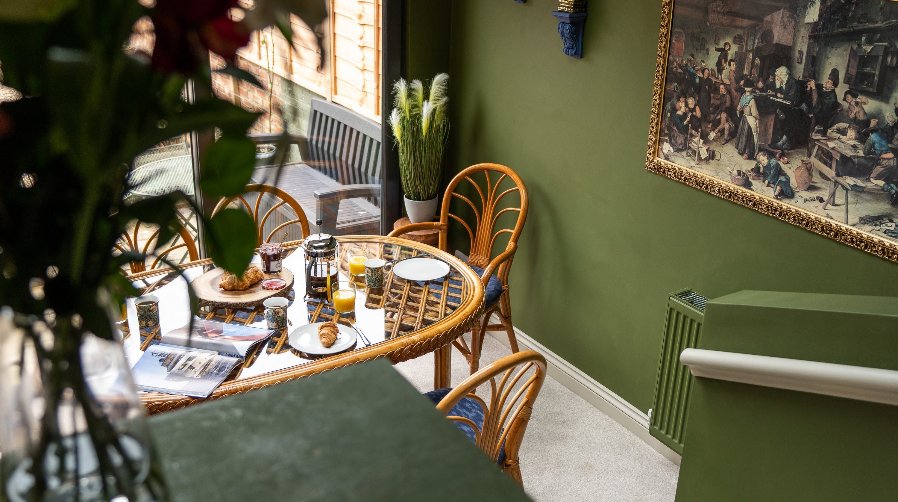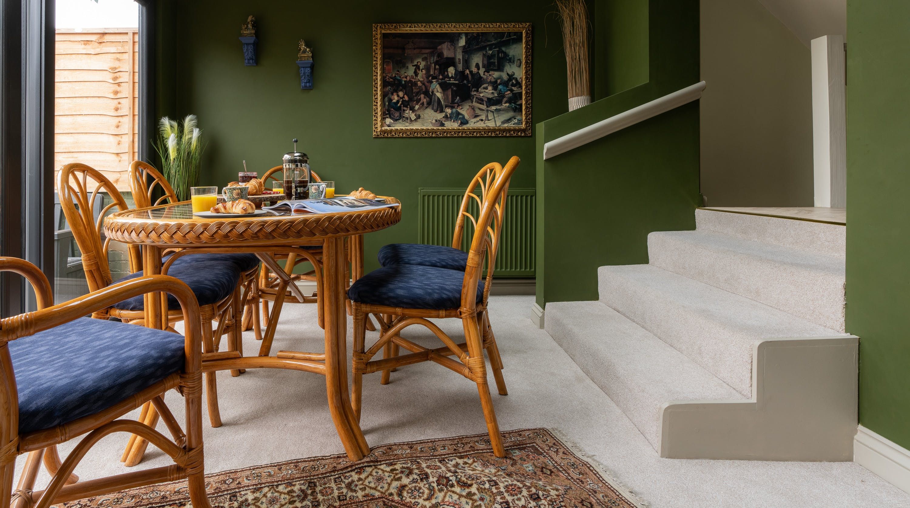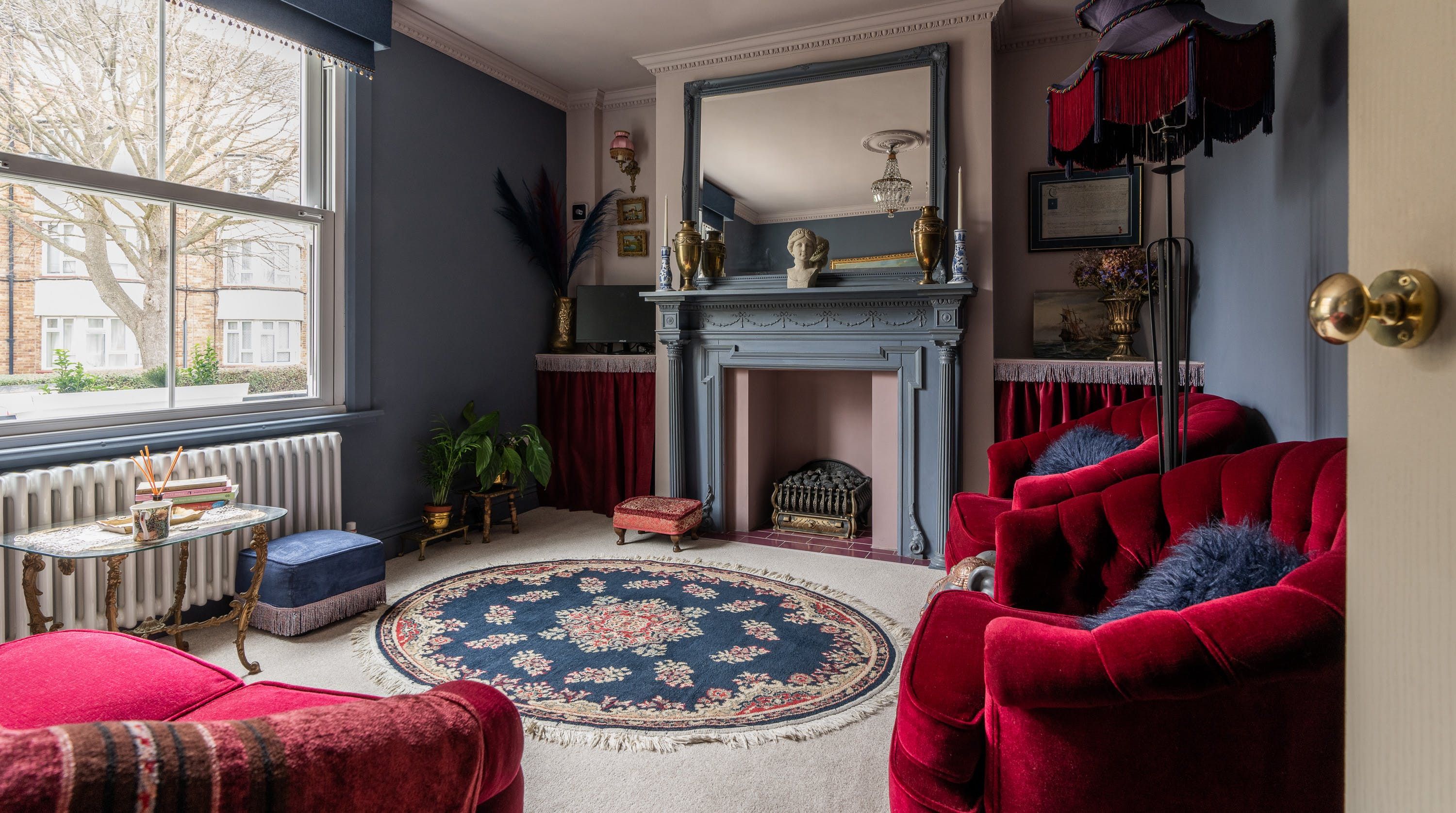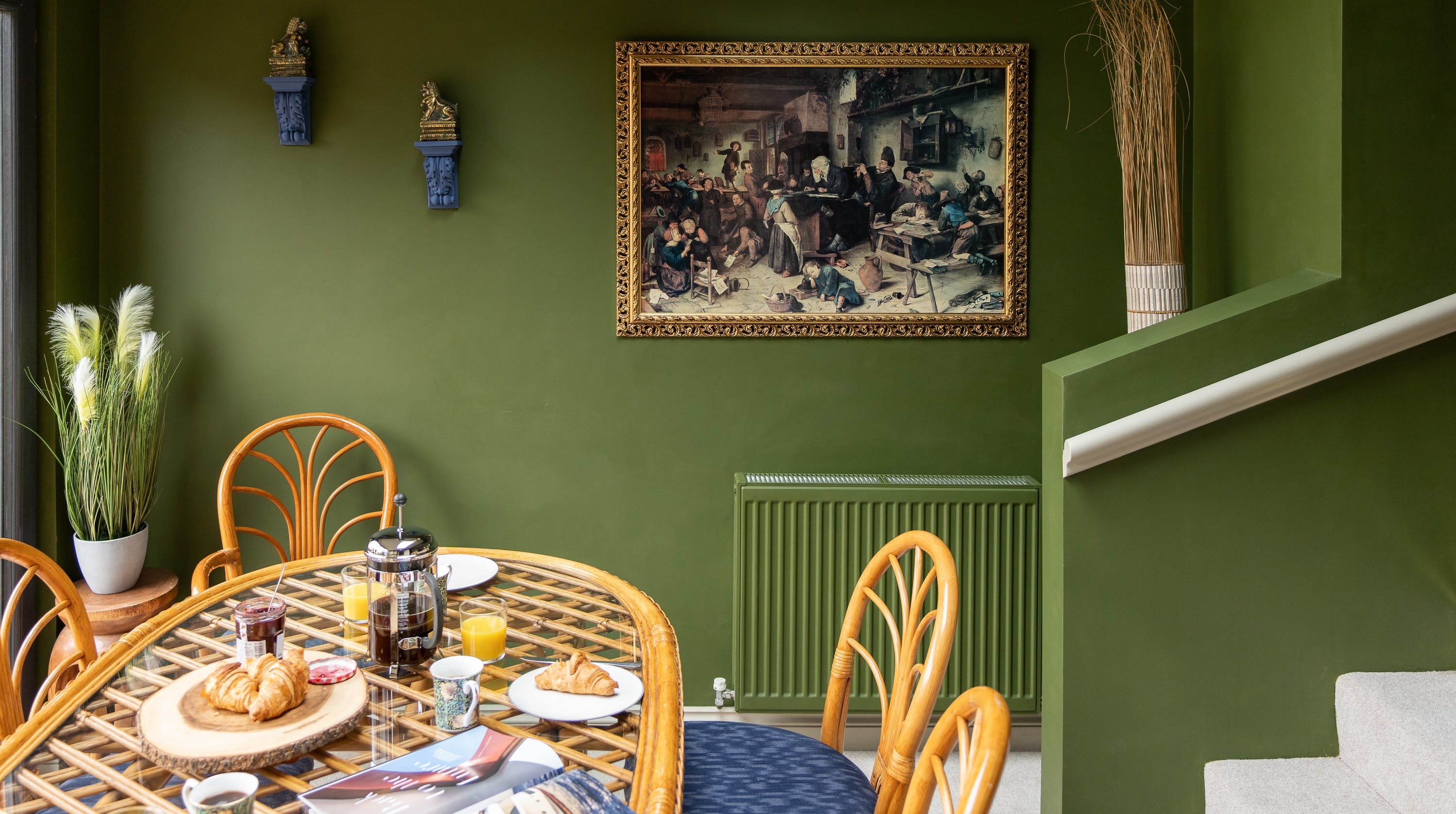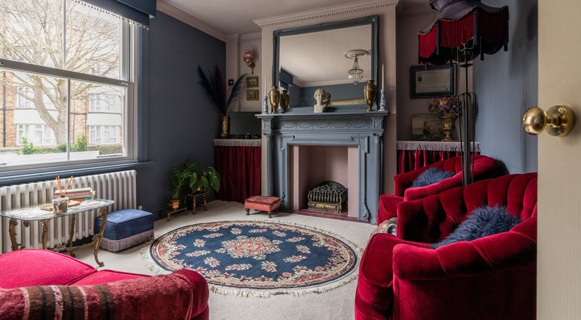 Designed by the owner who works as a professional interior designer, the vibe of this home merges contemporary comforts with quirky vintage kitsch, inviting guests into a unique space that escapes the mundane. The maximalist aesthetic retains many ornate Victorian features, while the home's furnishings carefully combine bold colours with rich textures. From the ruby red velvet couches to the olive green walls of the kitchen and dining space – this home presents bags of character inspired by the laid-back bohemian surroundings of the locale in Southsea.