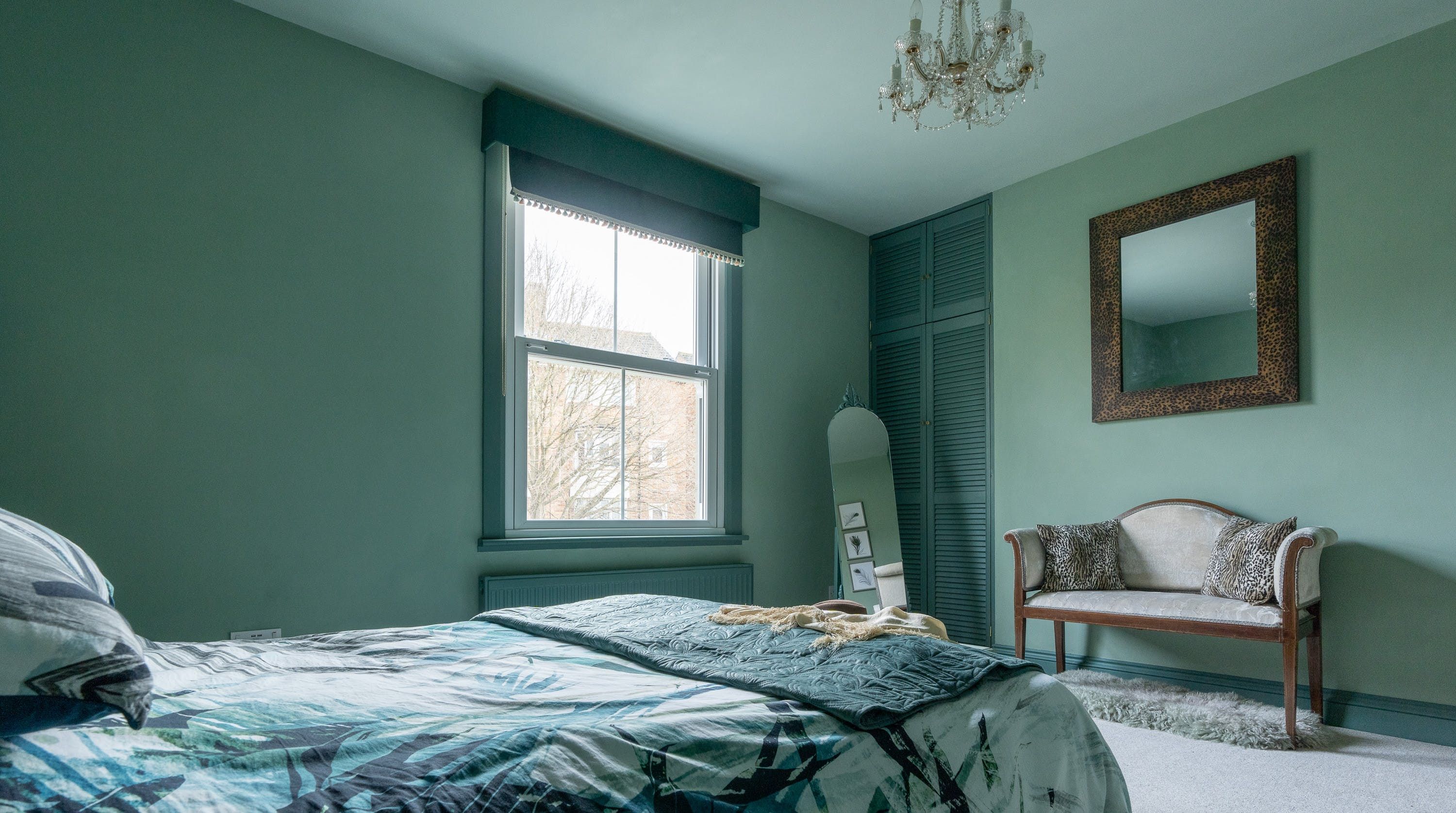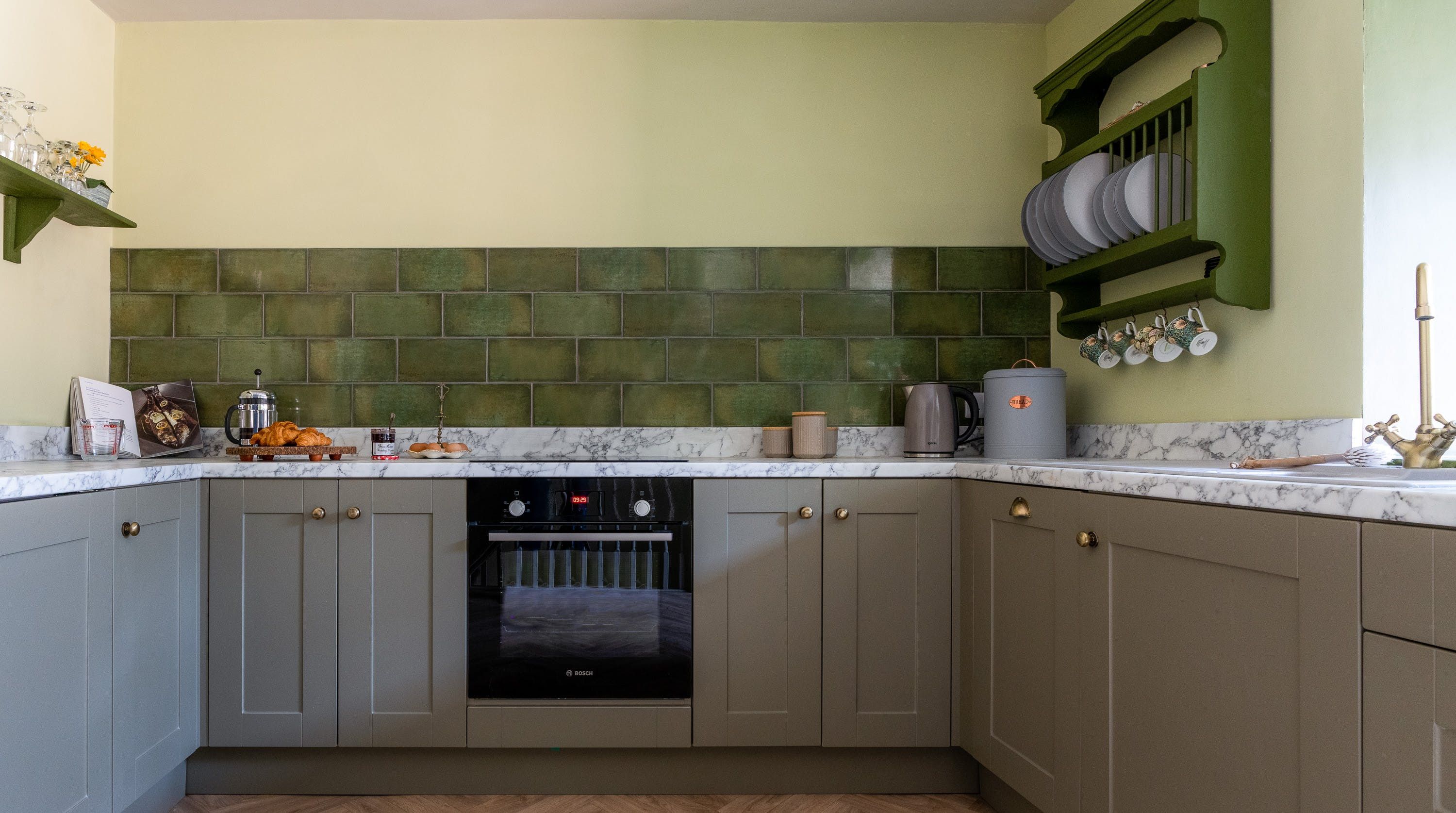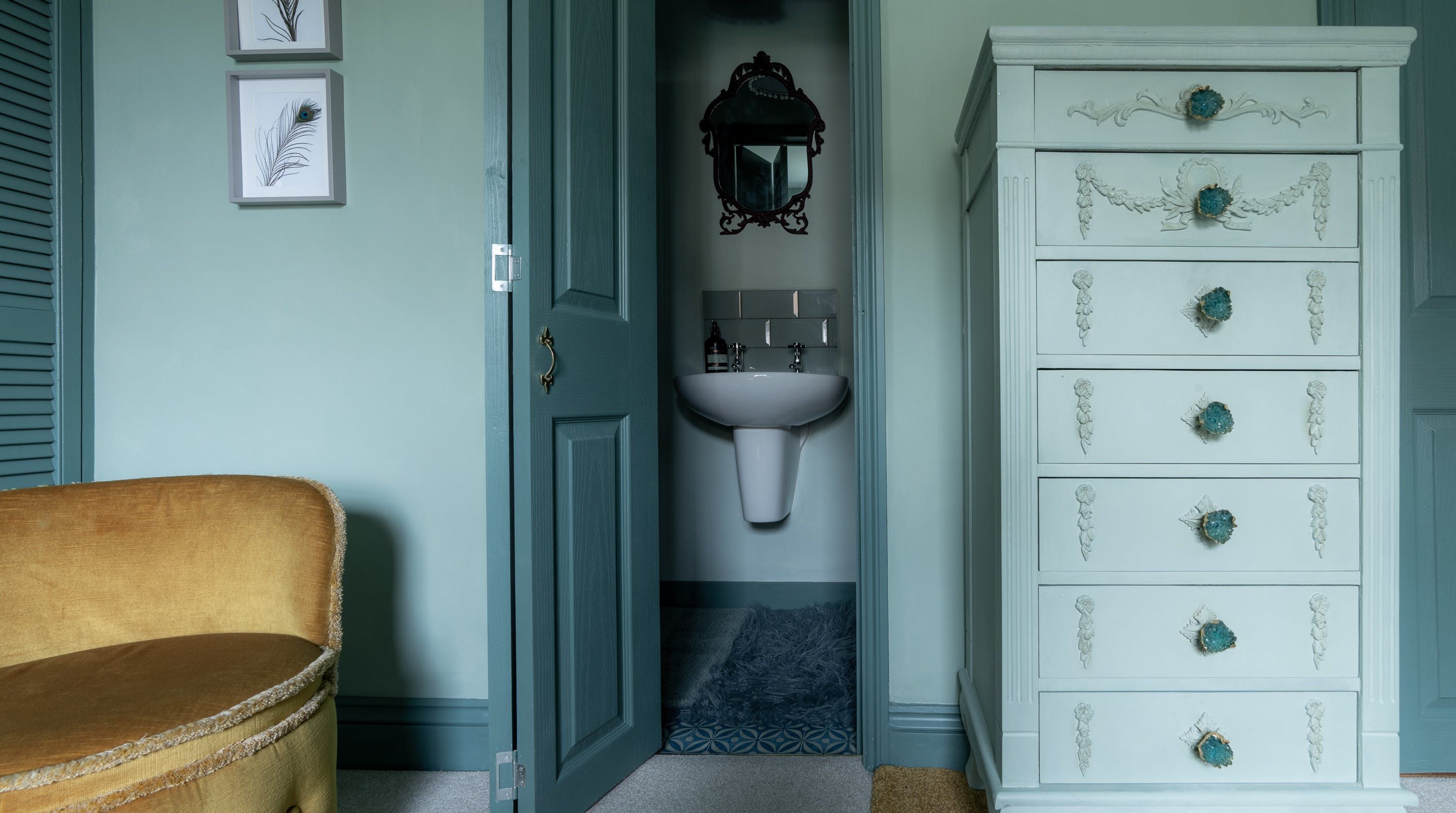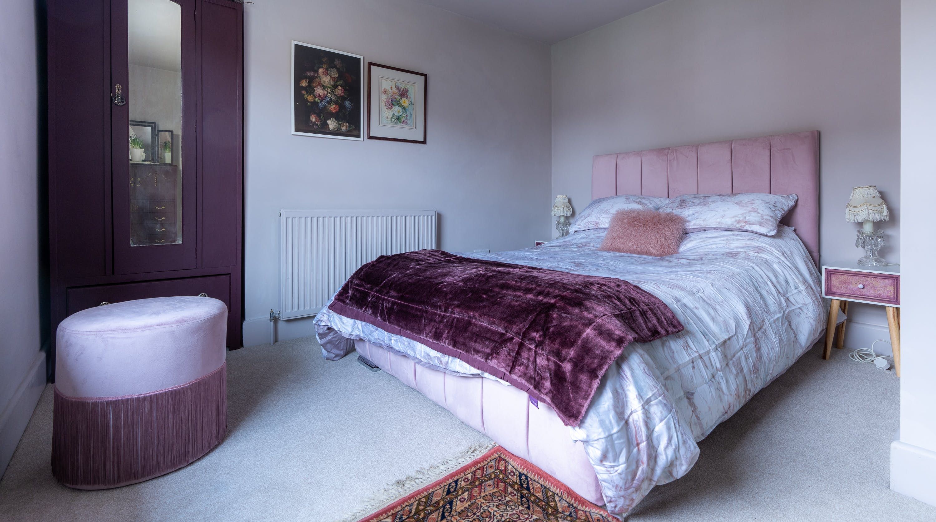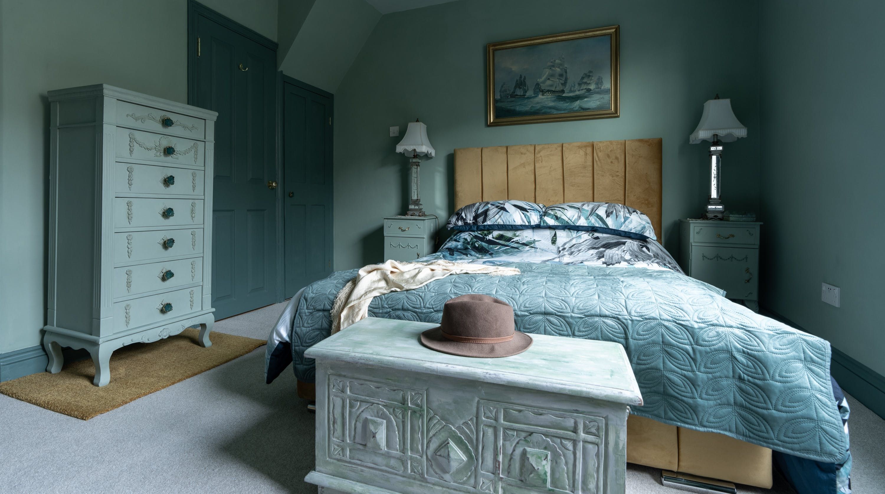 Designed by the owner who works as a professional interior designer, the vibe of this home merges contemporary comforts with quirky vintage kitsch, inviting guests into a unique space that escapes the mundane. The maximalist aesthetic retains many ornate Victorian features, while the home's furnishings carefully combine bold colours with rich textures. From the ruby red velvet couches to the olive green walls of the kitchen and dining space – this home presents bags of character inspired by the laid-back bohemian surroundings of the locale in Southsea.