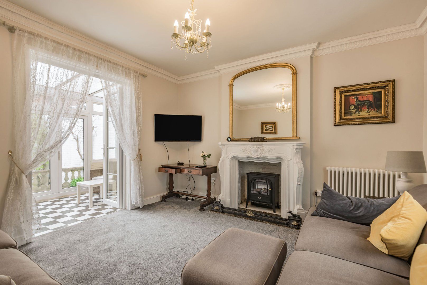 Gas central heating with multi-fuel stove. Induction hob, electric oven, fridge/freezer, dishwasher, tumble dryer, washing machine, TV, WiFi. Fuel, power and starter pack for stove inc. in rent. Bed linen and towels inc. in rent. 2 Designated parking spaces, one on grass area within the garden and one in designated spot with rear access to garden, which is locked overnight and accessed via key code. Enclosed patio area with unfenced pond, second rear garden with multi-level and lawned area leading directly to the river. Cycle rack available. Three well-behaved dogs welcome. Sorry, no smoking. Shop and pub less than 100 metres: Tesco Metro very near. Please note: Fence by the river for children's safety. Please note: property sits on a main road through town; some associated traffic noise may be heard at busy times.