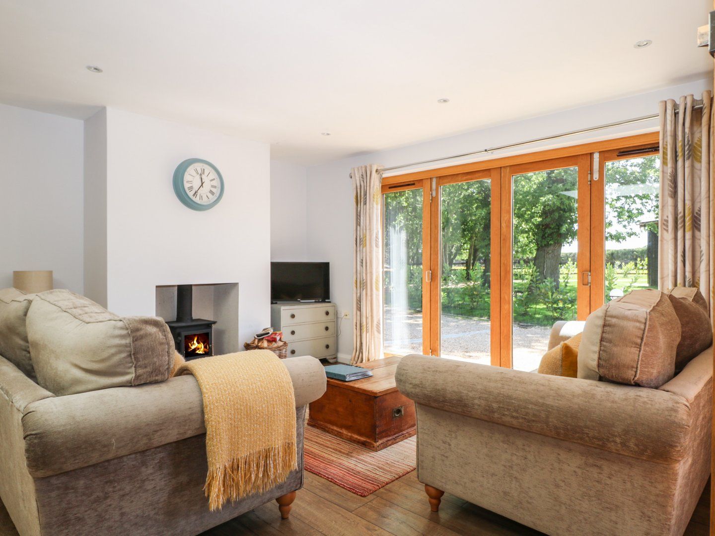 Single-storey. Two bedrooms: 1 x double with en-suite bath, shower over, basin and WC, 1 x twin with en-suite shower, basin and WC. Open-plan living space with kitchen, dining area and sitting area with woodburning stove