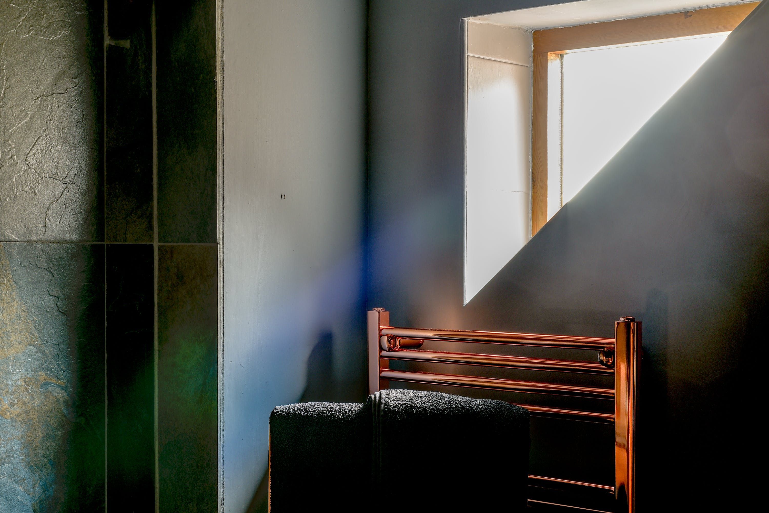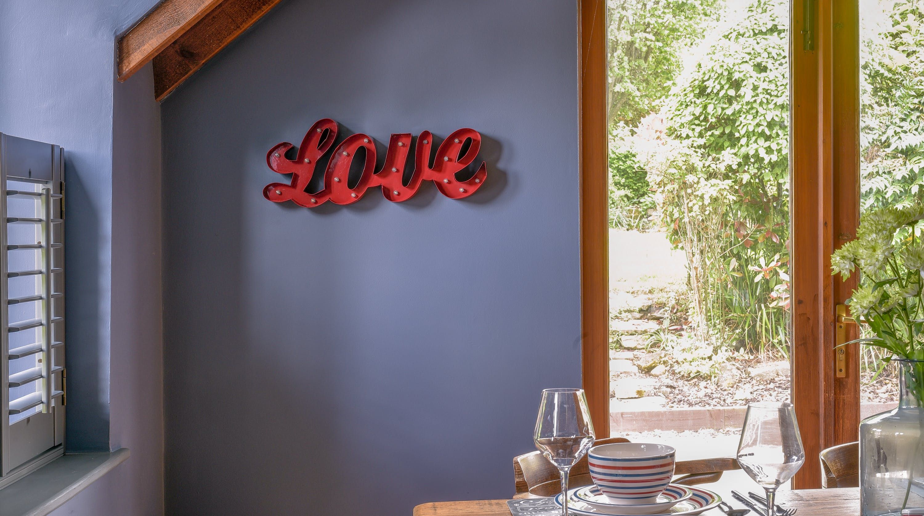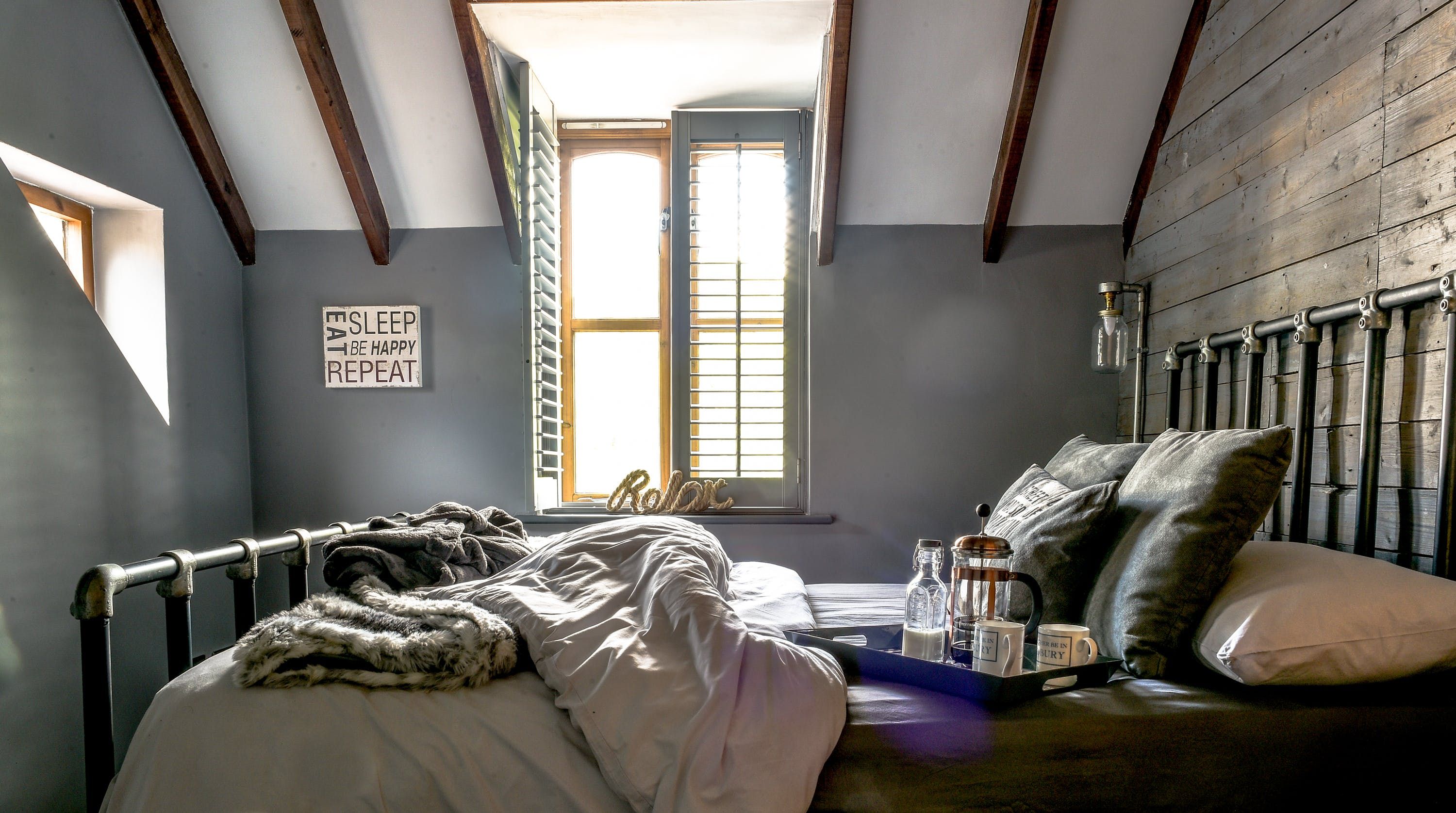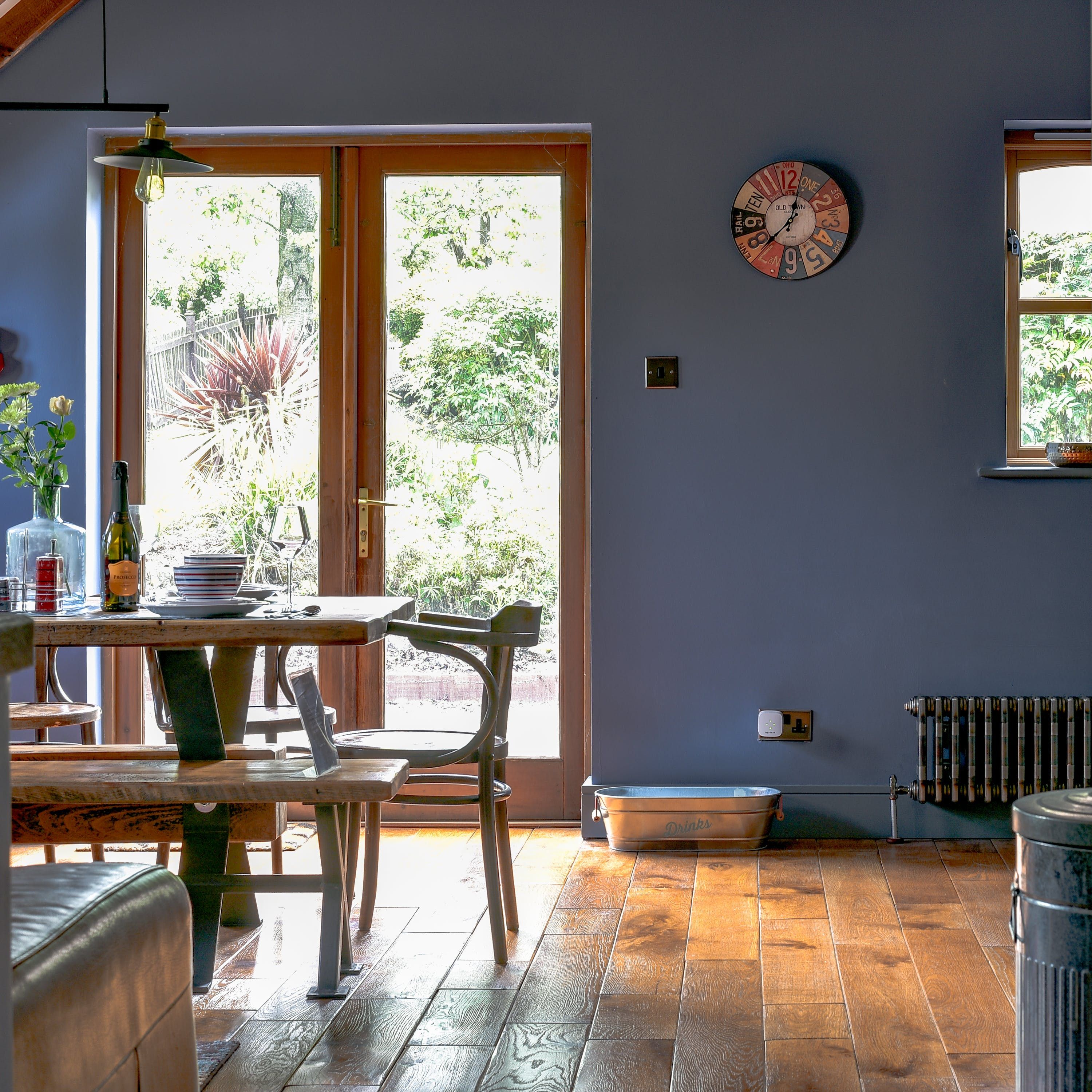 Tucked away, off a country road close to Ledbury, this charming little home comes as quite a surprise. With its rural surroundings and nearby grazing sheep, its bold industrial styling is a real statement, with deep hues on the walls and lots of reclaimed wood. Vaulted ceilings, exposed brickwork and wooden beams add plenty of character but it's touches like the vintage radiators, scaffold pole headboard in the bedroom and the exposed copper pipework in the bathroom that make this place really sing.