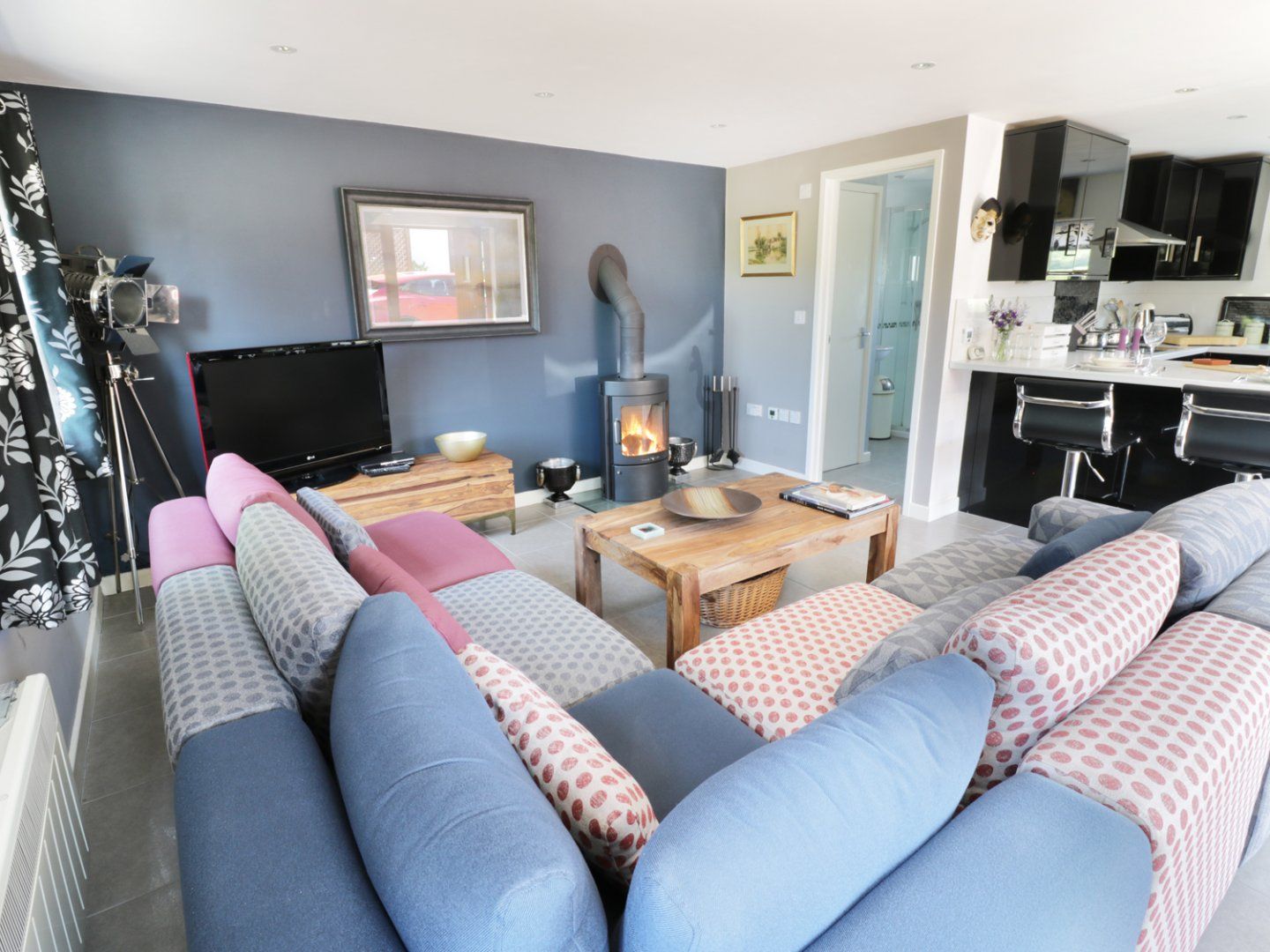 One bedroom: 1 x double bed. Ground floor shower room with basin and WC. Open-plan living area with kitchen, dining area and sitting area with woodburning stove.