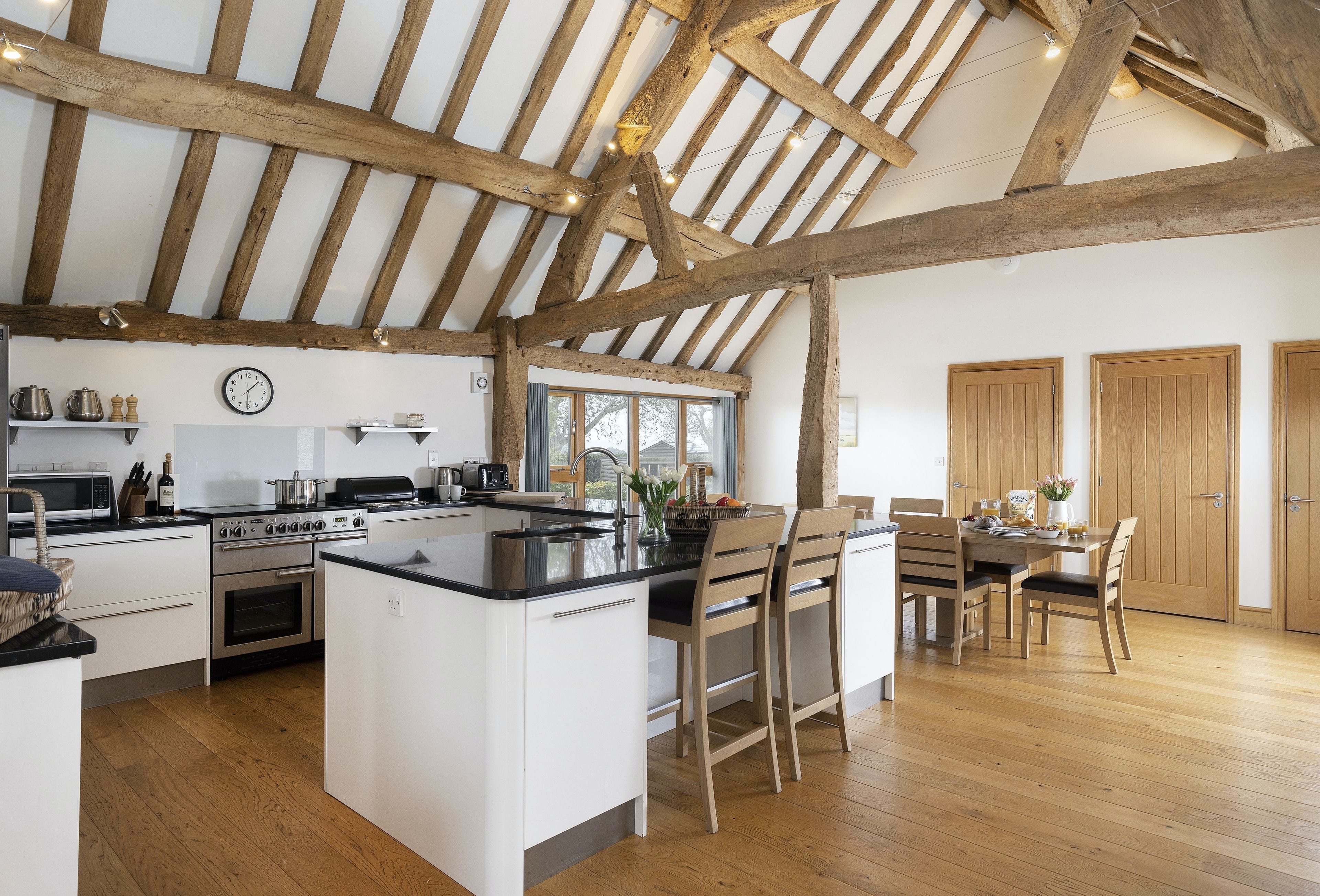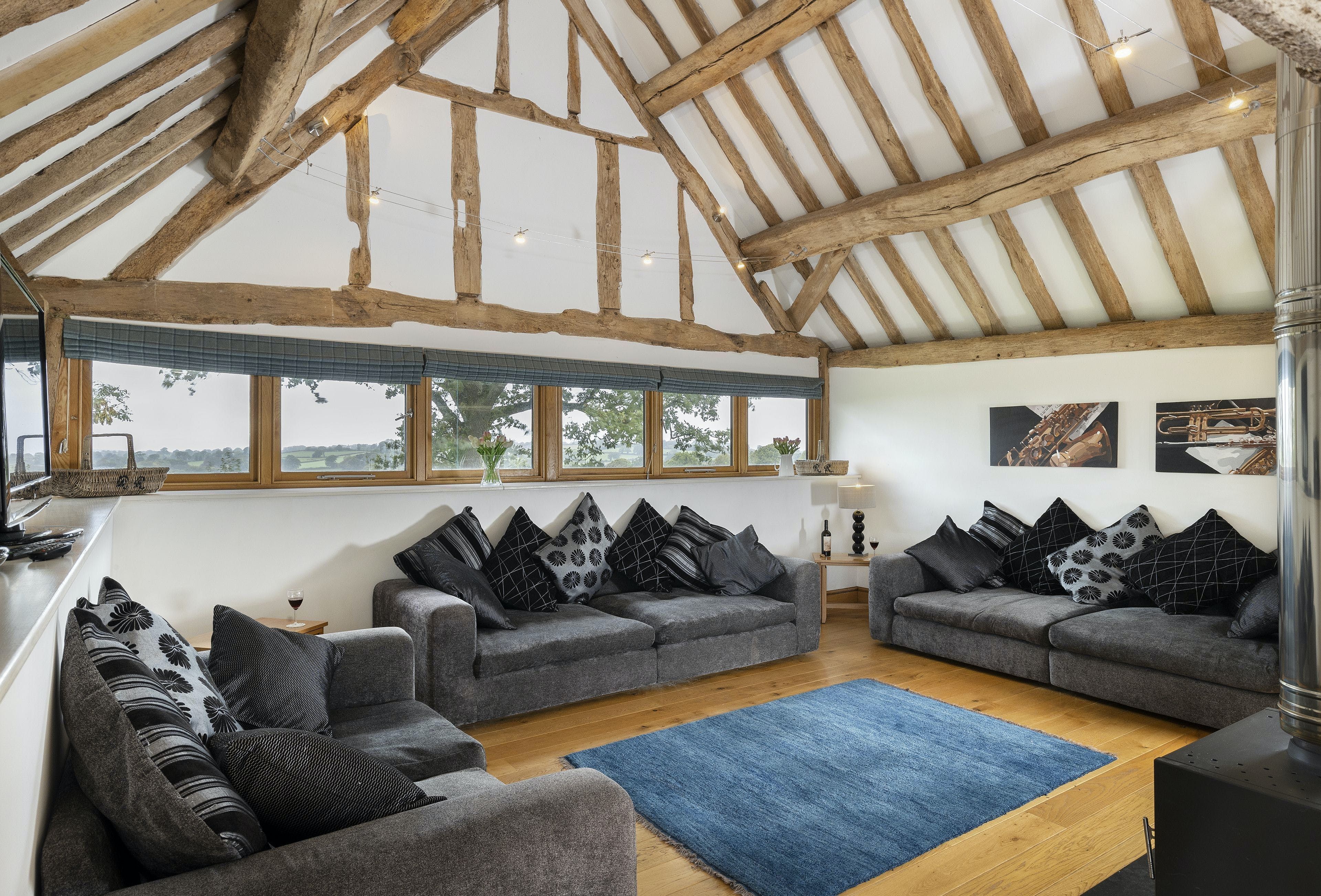 Escape to this idyllic Herefordshire retreat, perched on top of a hill beside an iron-age fort and offering breathtaking countryside vistas. Perfect for a multi-generational family stay (with two dogs in tow), alongside the main barn, there's a smaller stone barn (connected on the first floor) offering a snug, two further bedrooms and a well-equipped playroom. If you can lure yourselves from the enclosed private garden, you're just a five-minute drive from the historic market town of Bromyard with delicatessens, butchers and pubs for a taste of county life.