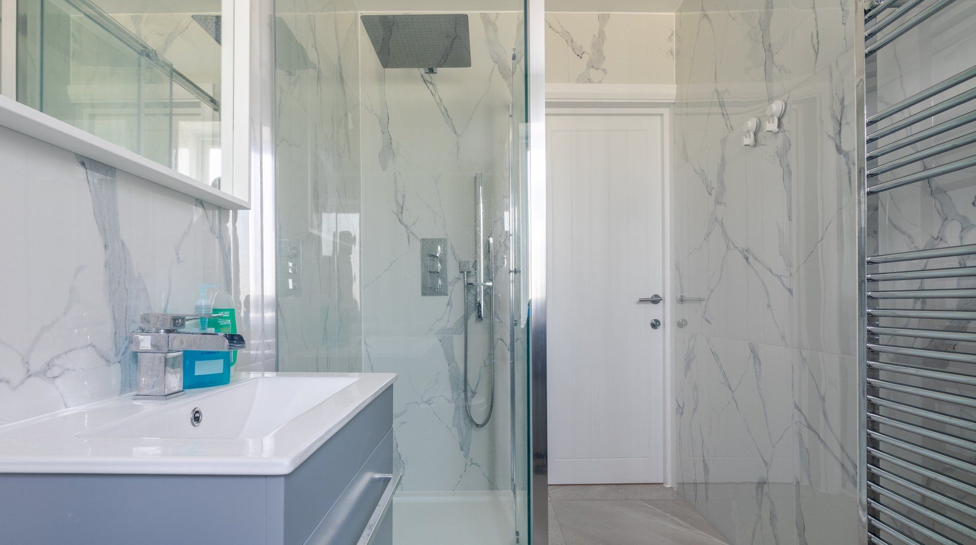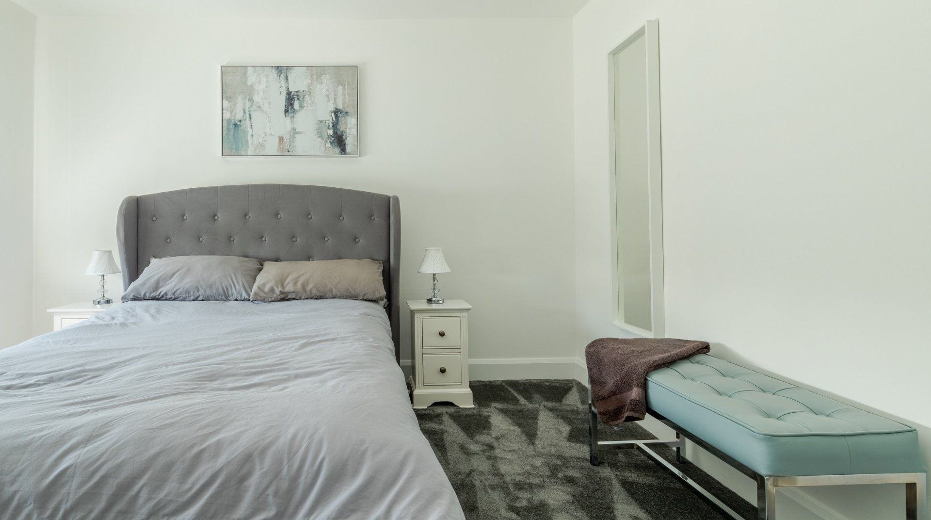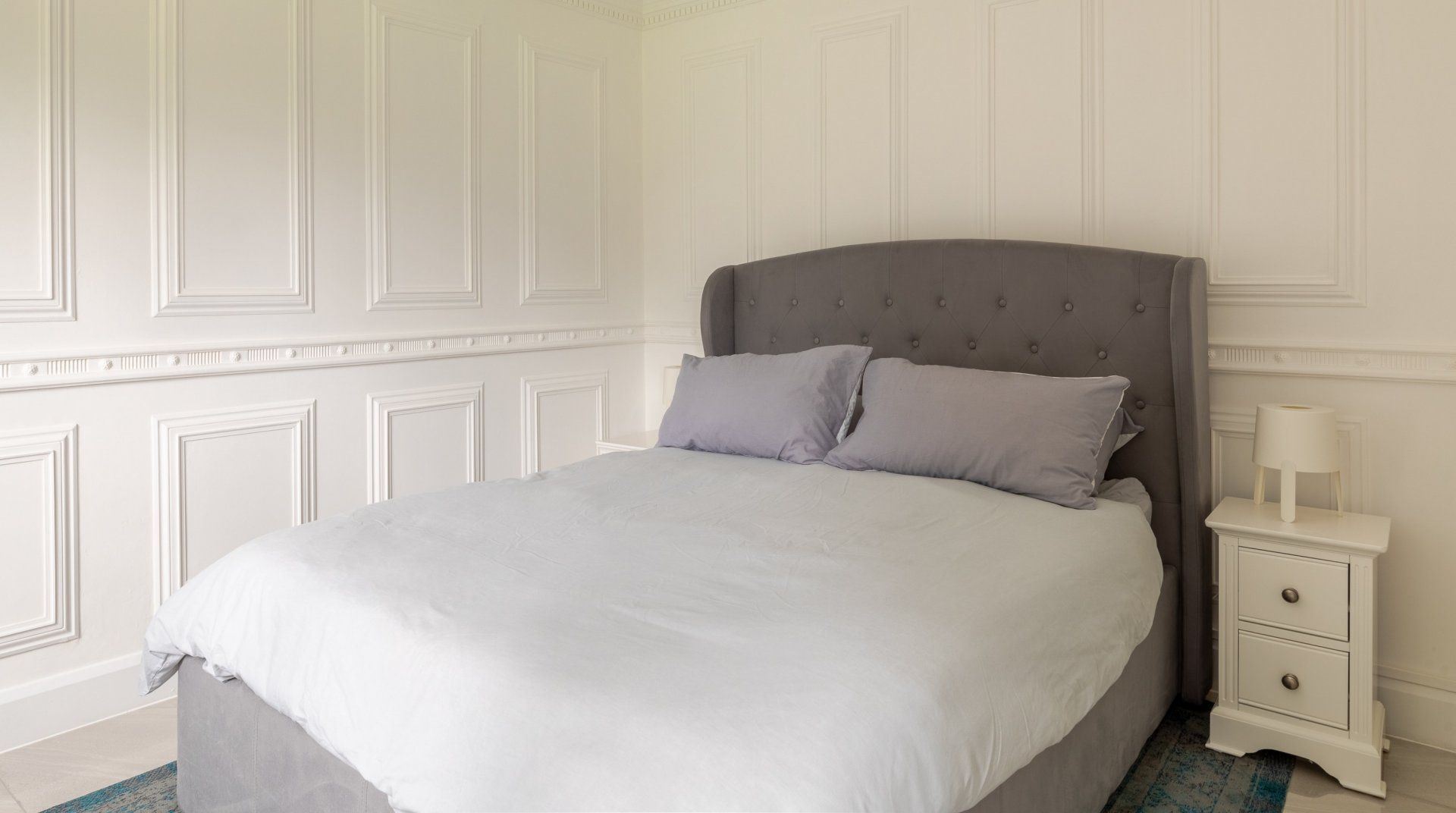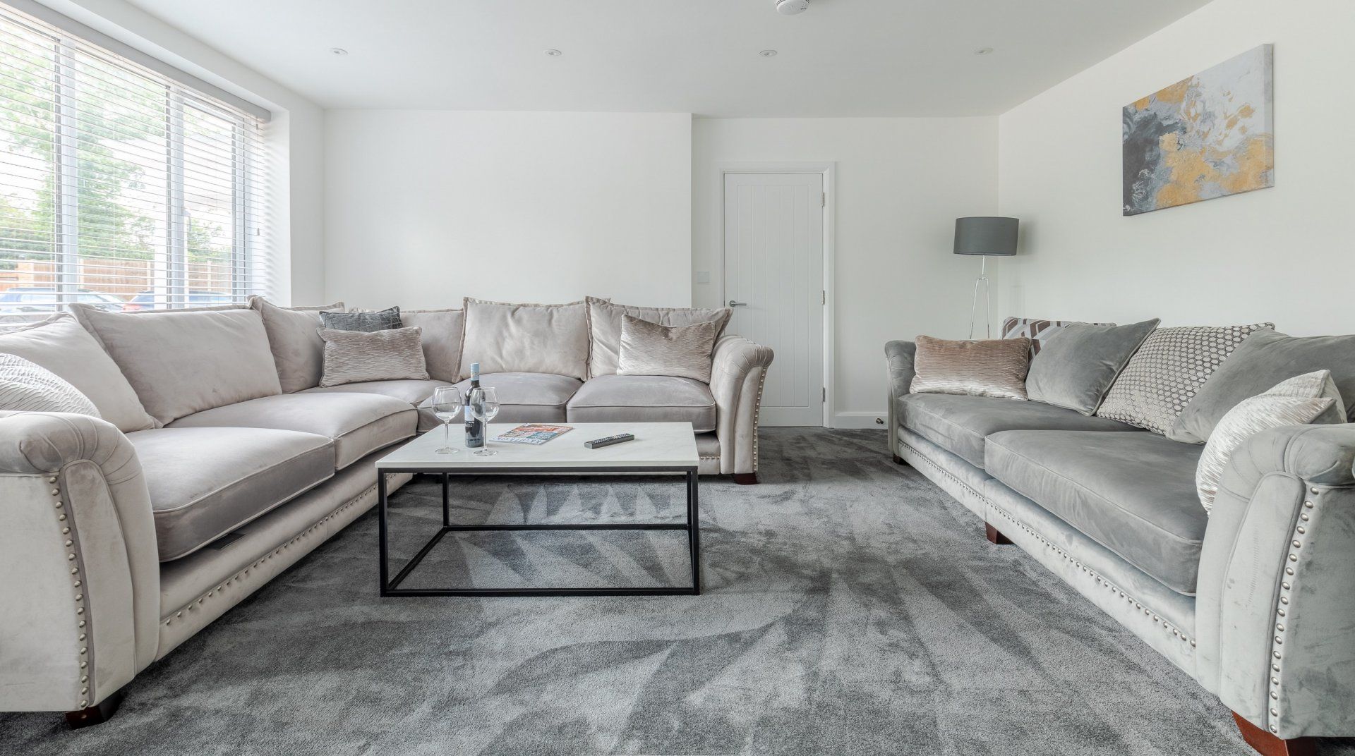 It’s not often you stumble upon a family home near London with a swimming pool in its back garden. The modern house sits in the idyllic, riverside village of Amwell, within walking distance of a cosy local pub and a handful of shops, cafés and restaurants. It’s a fifteen-minute walk from St Margeret’s (Herts) train station if you’re arriving by rail or want to get into London. The swimming pool in the back garden, flanked by palms, wouldn’t look out of place in Palm Springs, and a bubbling hot tub awaits at the side of the pool house. Inside, it’s a classy, monotone affair, as though a black and white filter has been applied. The main lounge is a vision of dove-grey velvet, from floor to sofas (there’s plenty of room for the whole group in here) and the kitchen is sleek slate and black with all the mod cons of the 21st century. Gather the group at the long dining table for a big meal before heading off to bed in one of the stone-grey and white havens.