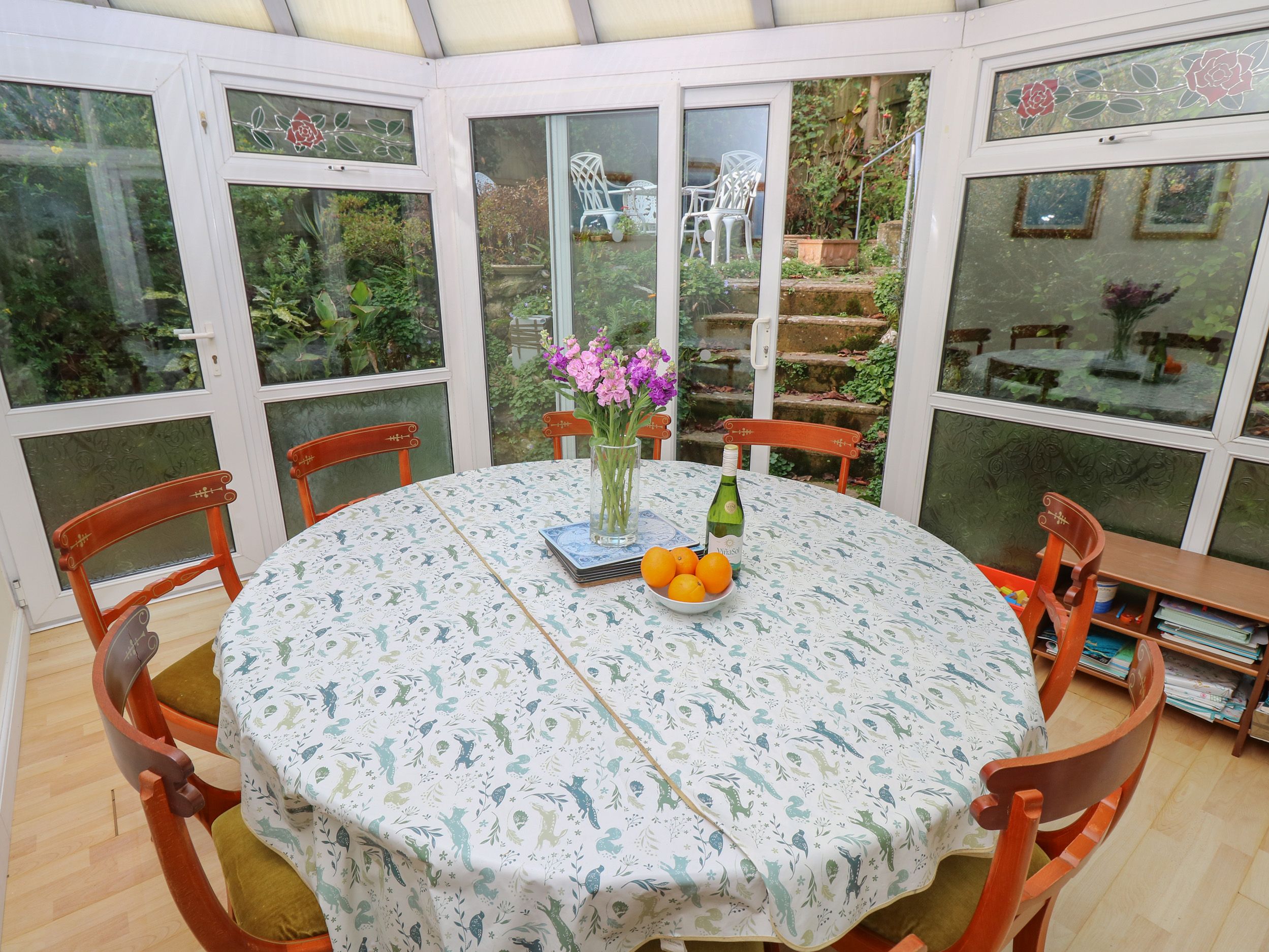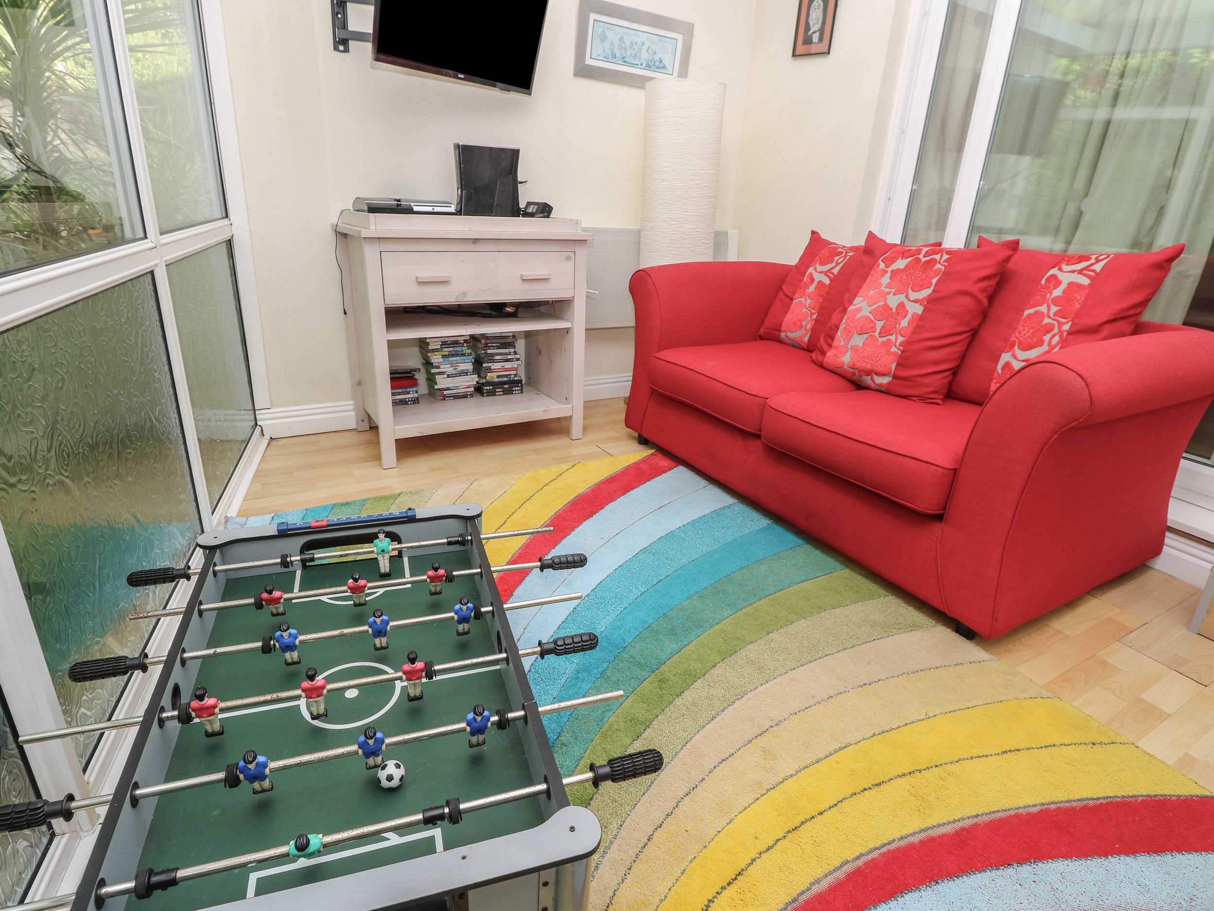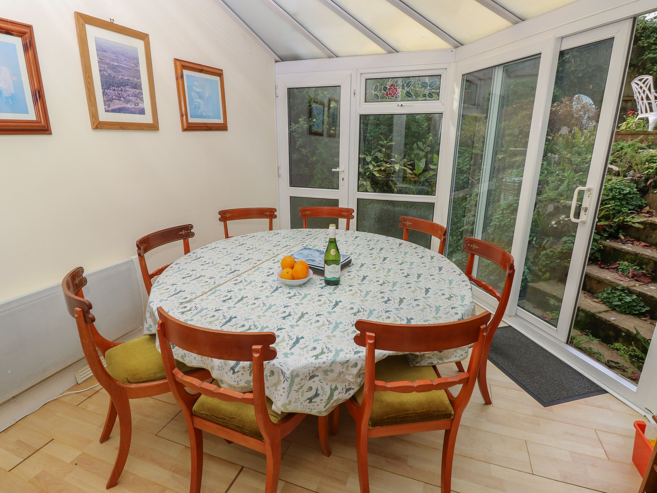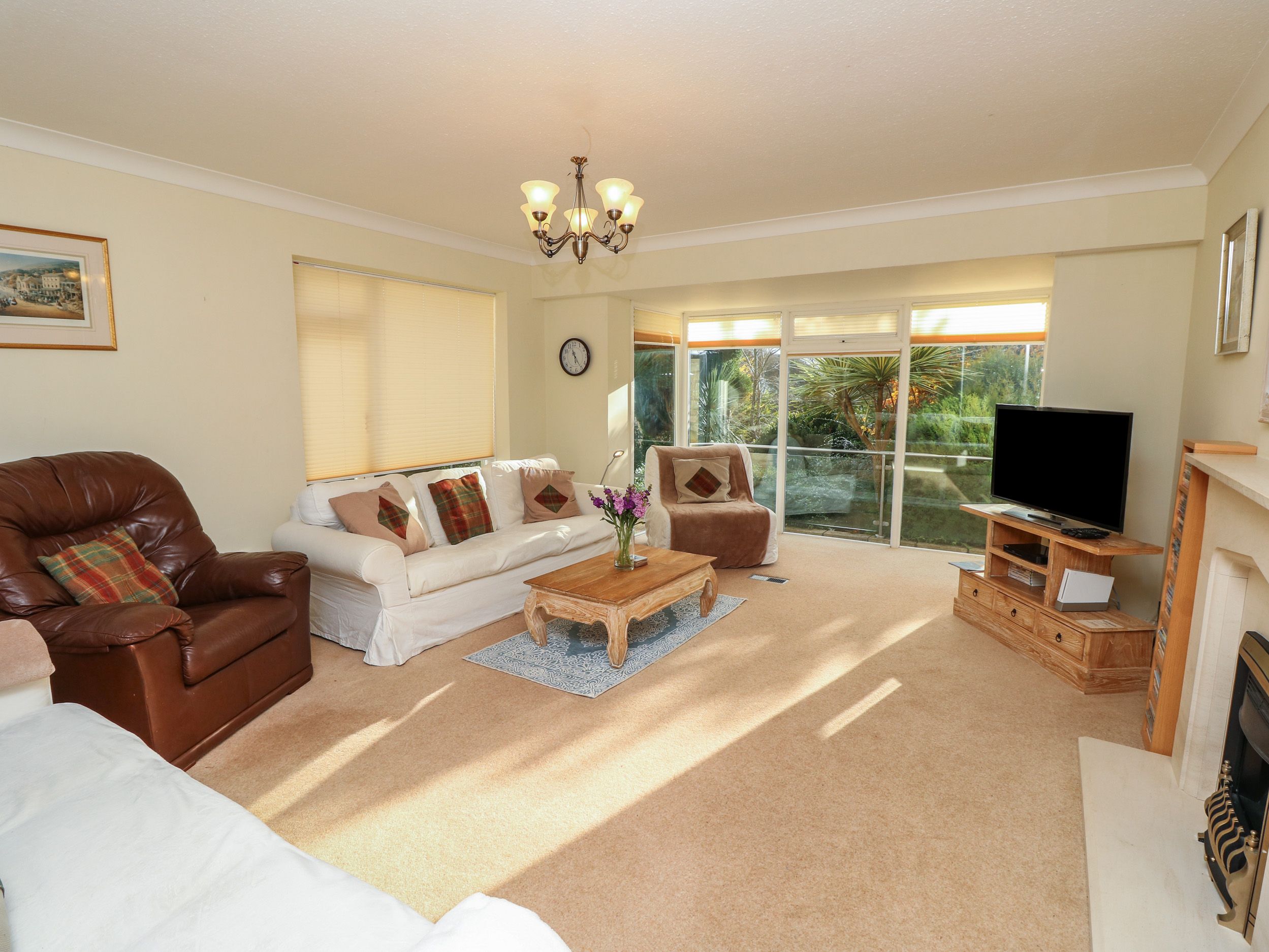 Amenities Central heating. Electric oven, gas hob, microwave, fridge/freezer, washing machine, dishwasher, tumble dryer. 2 x TVs, books, games, WiFi. Fuel and power inc. in rent. The table tennis table is in the carport. The barbecue is in the lower patio area. Bed linen and towels inc. in rent. Highchair available. Off-road parking for 3 cars. Multi-level rear garden with patio, gravel, lawn, furniture, and summer house. Multi-level front garden with patio and pond. Two well-behaved pets welcome. Sorry, no smoking. Shop 0.8 miles, pub 0.7 miles, beach 0.3 miles. Note: Steps up to raised terrace garden. Note: Pond in garden, please take care. Note: Steps down to ground-floor double bedroom and step down to conservatory/snug. Note: Sofa bed sleeps an additional two guests