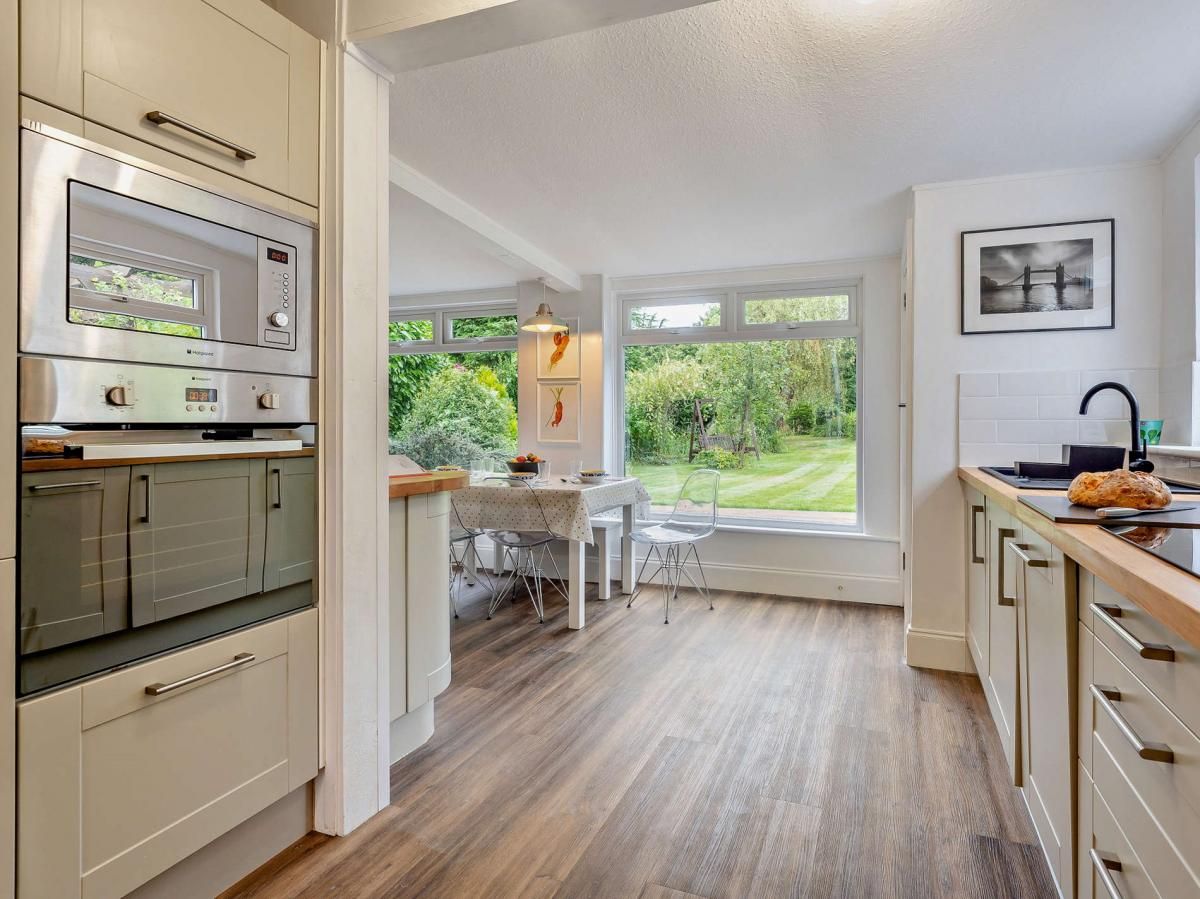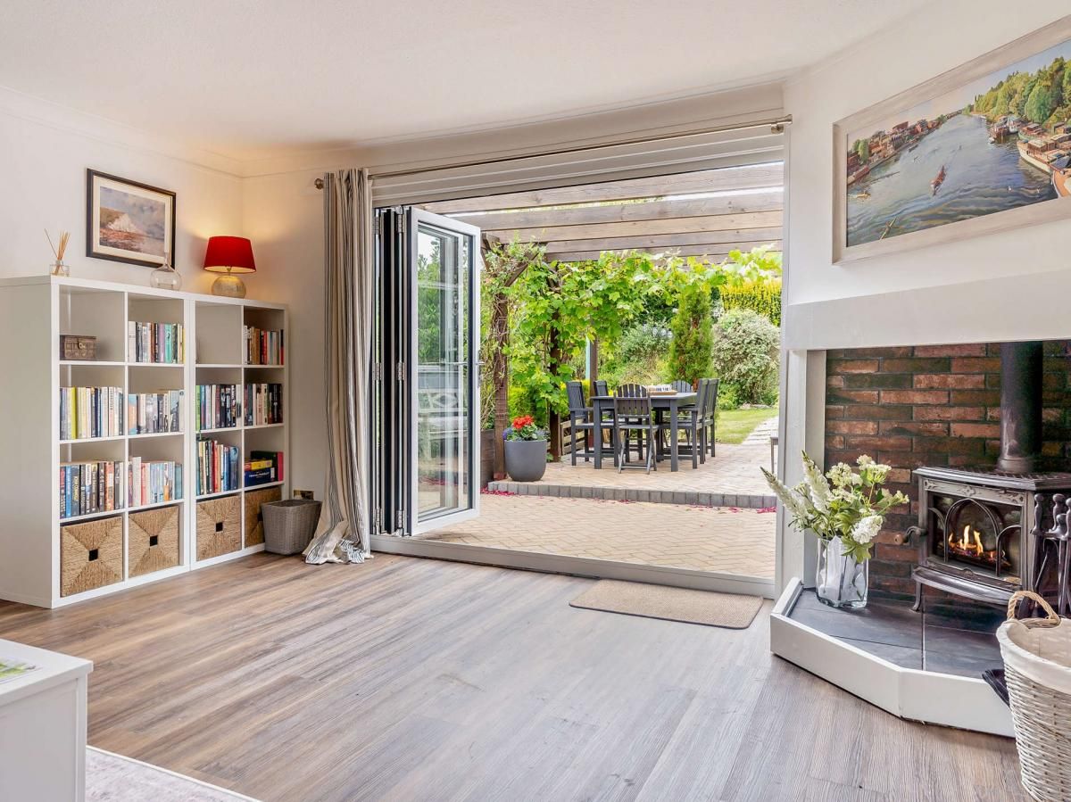 Located on a leafy, private road close to the historic harbour town of Yarmouth, it has expansive, pet- and child-friendly gardens. Inside, the updated interiors are airy and chic, with a wood burner and folding doors adding all-year appeal.
