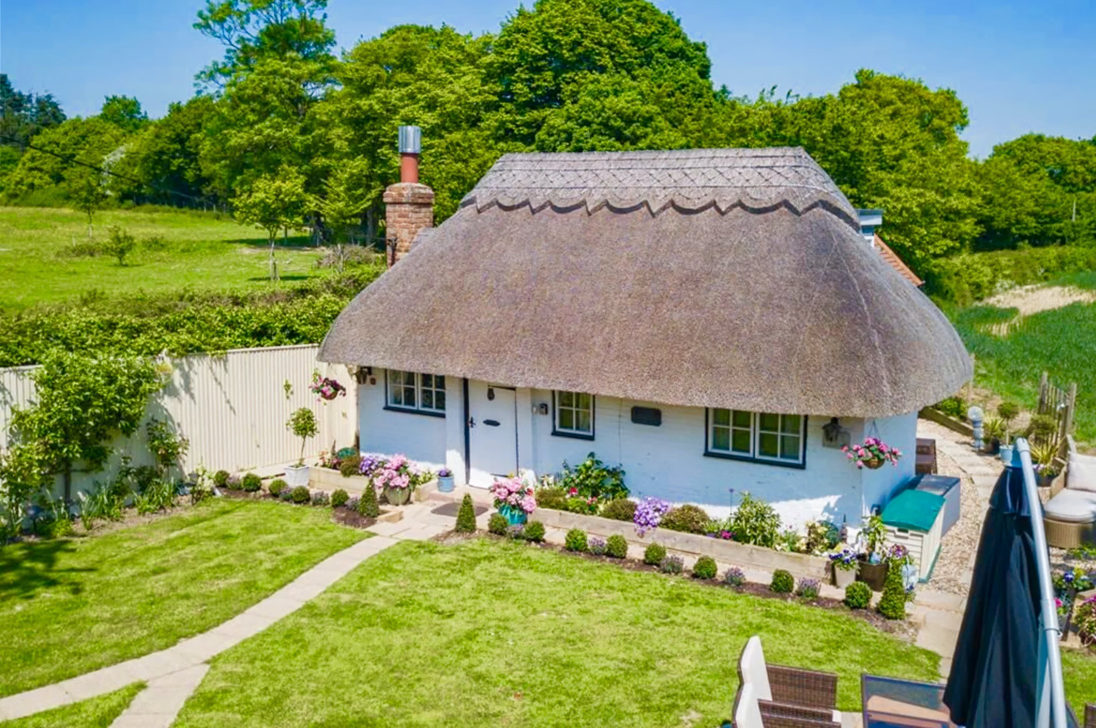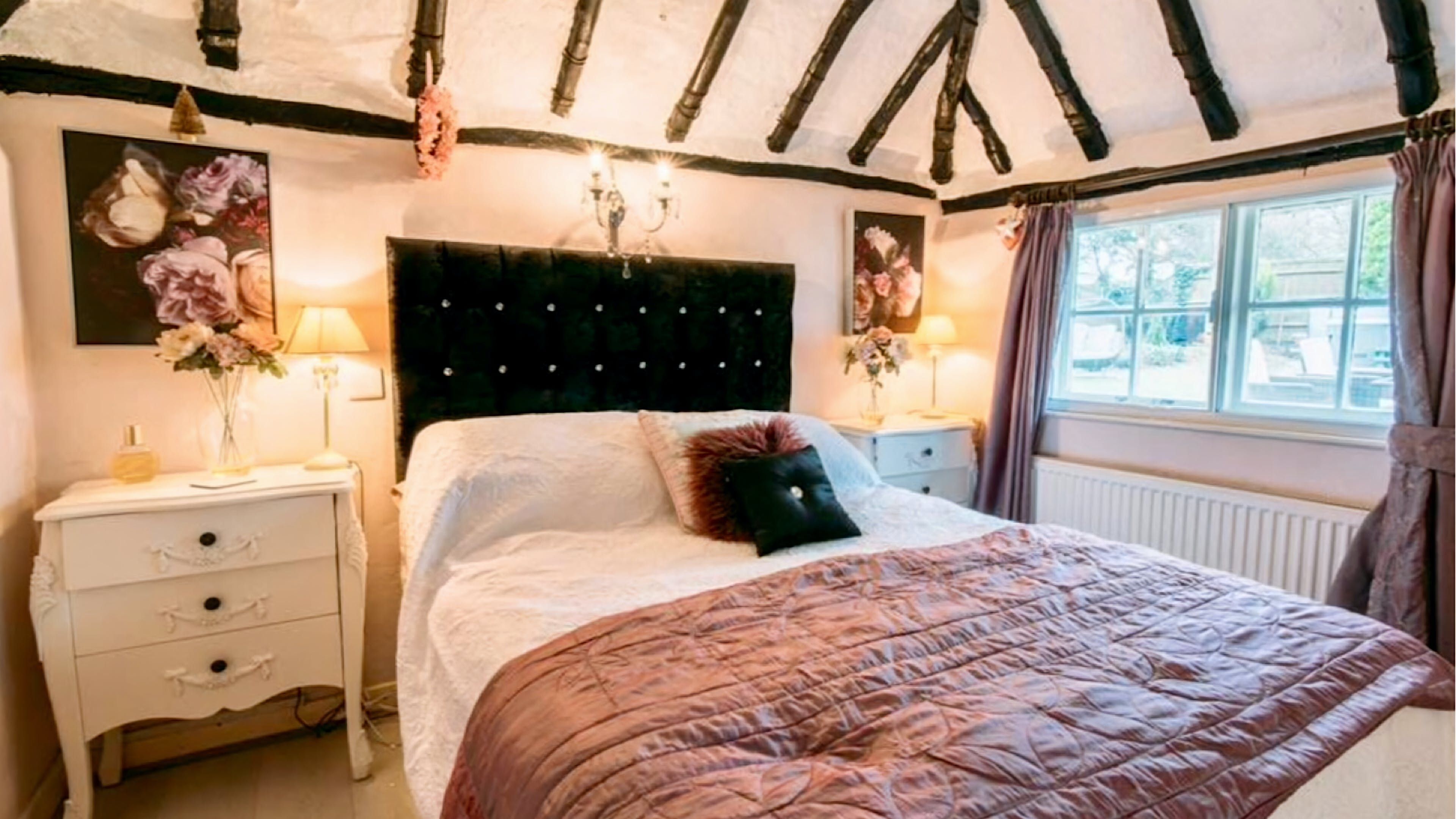 A gorgeous “chocolate box” thatch cottage nestled in rolling Kent countryside, this home looks like it's been pulled straight out of a fairy tale – complete with charming 15th-century beams, opulent furnishings, and brightly coloured flower beds.