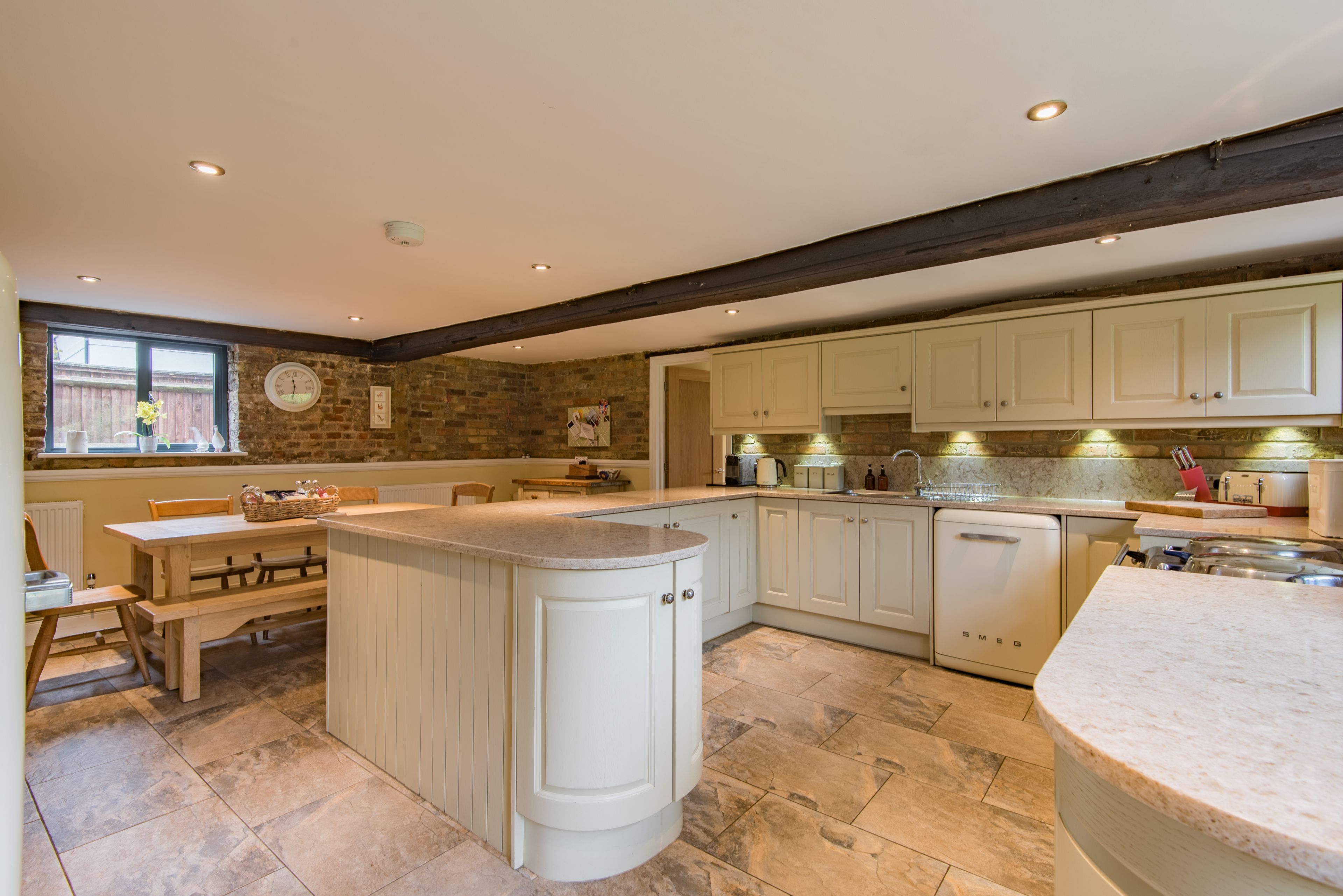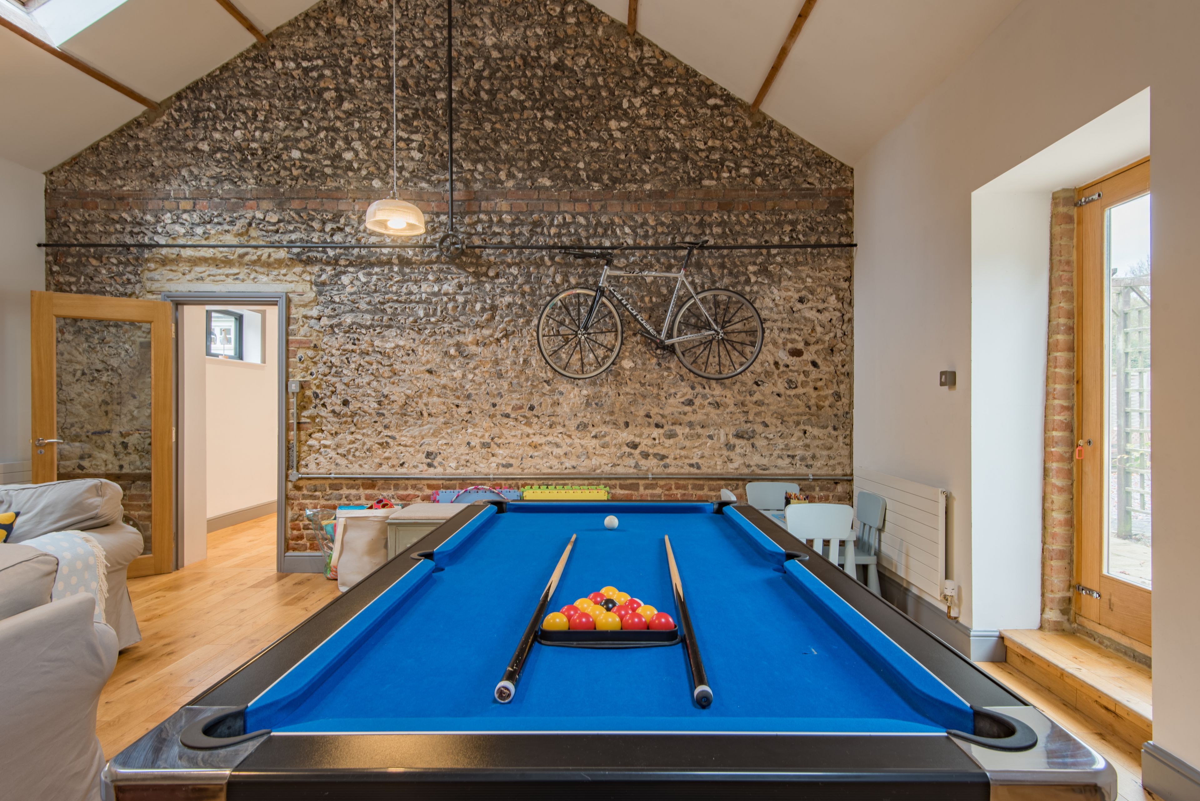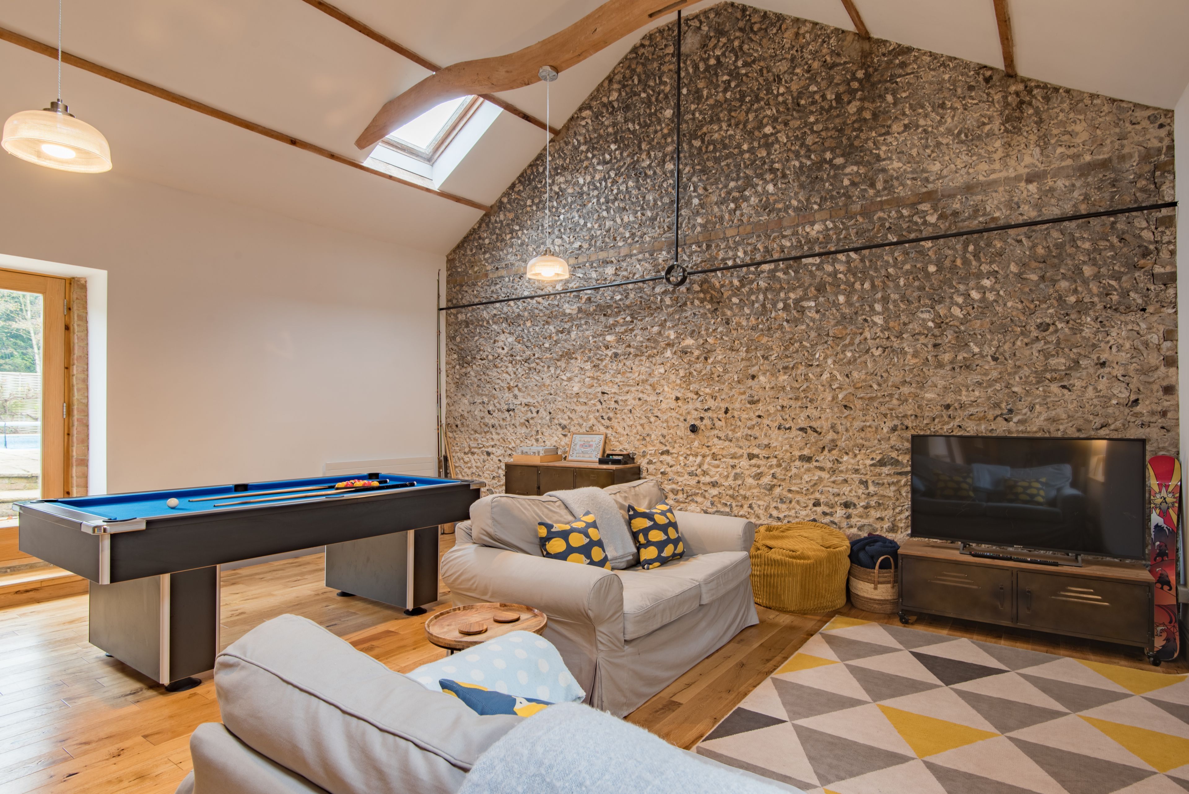 Your coastal country break starts at this converted flint stone barn, a ten-minute walk from the beach. With its own heated pool in the summer and a games room as well-equipped as the kitchen, there's more than enough space here for extended families and large groups of friends. The home's rustic charm has been retained in the exposed brick and wooden beams, while the log burner is just oh-so inviting for cosy evenings indoors. Furry friends are welcome to join you for a fee, and you'll find plenty of scenic walks nearby. Not to mention the golf club, local pubs and shops, and sandy coast of Kingsdown village are easily reached on foot.