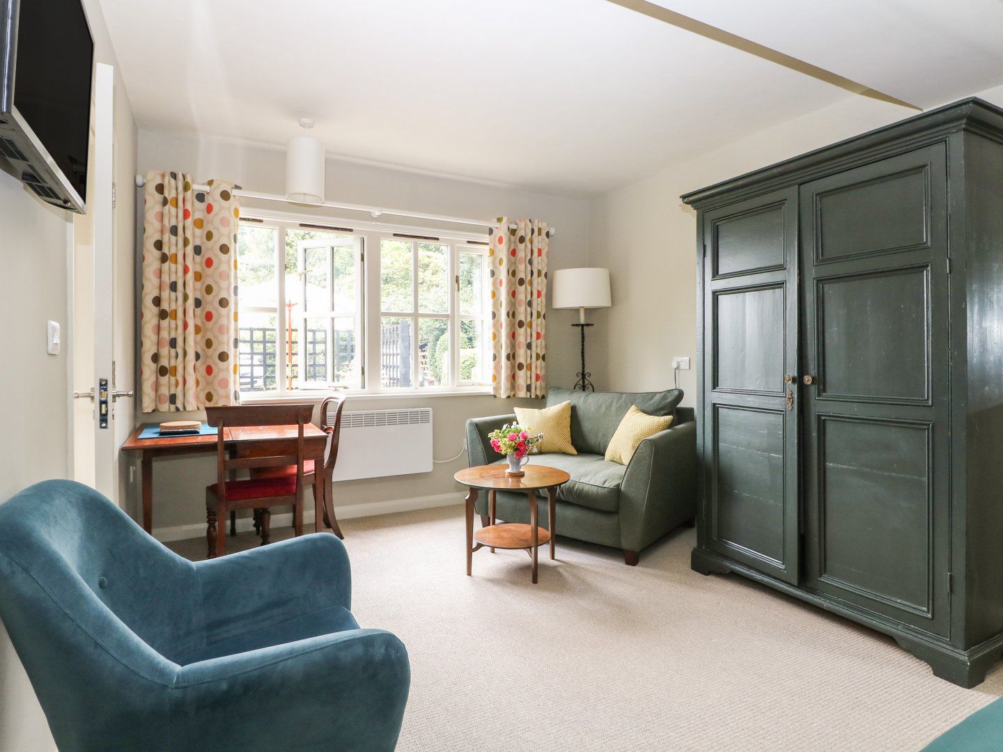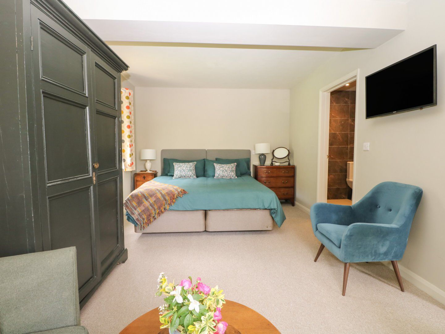 Accomodation Details All-ground-floor. Open-plan living space with king-size bed (zip/link, can be twin on request) dining area, sitting area with Smart TV and en-suite wet room with shower, basin and WC, 1 x double with en-suite walk-in shower, basin and WC. Kitchenette