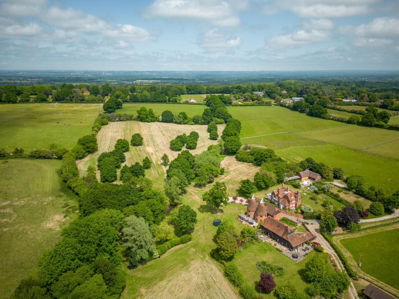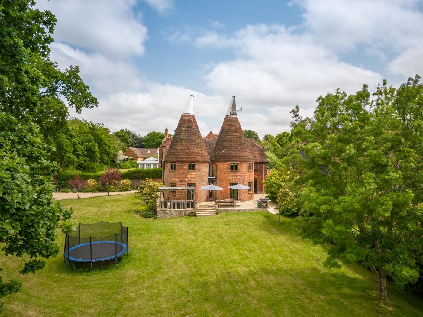 It was once a double oast barn, dating from 1880, when the roundels were originally used to dry hops. There is a spacious figure-of-8 sitting room with double French doors, opening on to a terrace with stunning views over the extensive gardens.