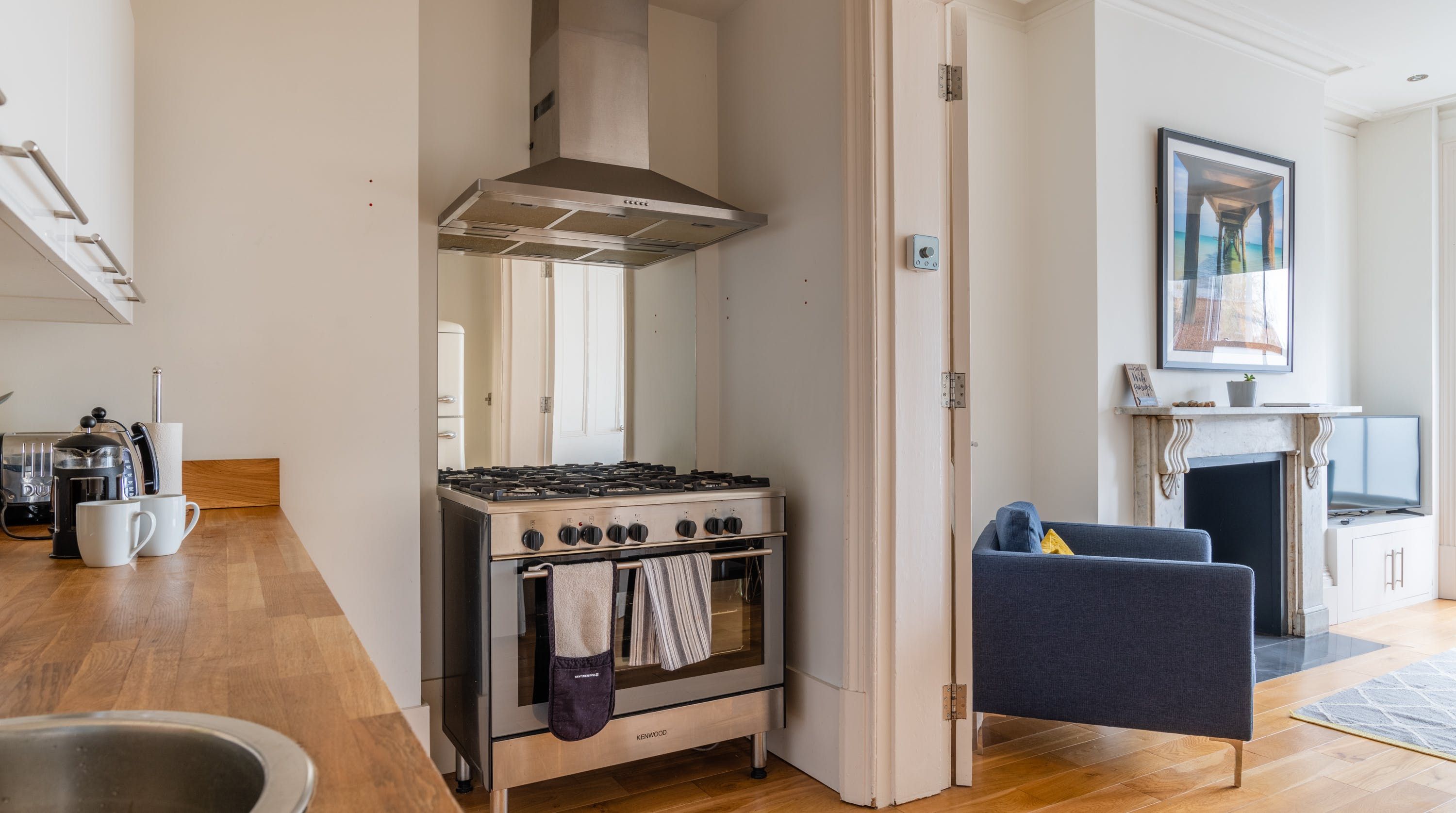 Two of the things that the Kent town of Deal is most famous for is its castle and stretch of pebbly coastline. As it happens, both of these things are visible through the big bay window in the lounge of this apartment. Back inside, the decor is simple, but every aspect has been executed so well. Wooden floorboards and white walls provide a classy backdrop against which colourful furnishings and photographic artwork pop off. The kitchen is pretty large considering the address is only for two, so you'll be able to flex your culinary muscles with no trouble. The presence of a bathtub is also sure to be appreciated after a long day frolicking about on the beach, which sits at the end of the street. There are plenty of pubs and restaurants within walking distance, too.