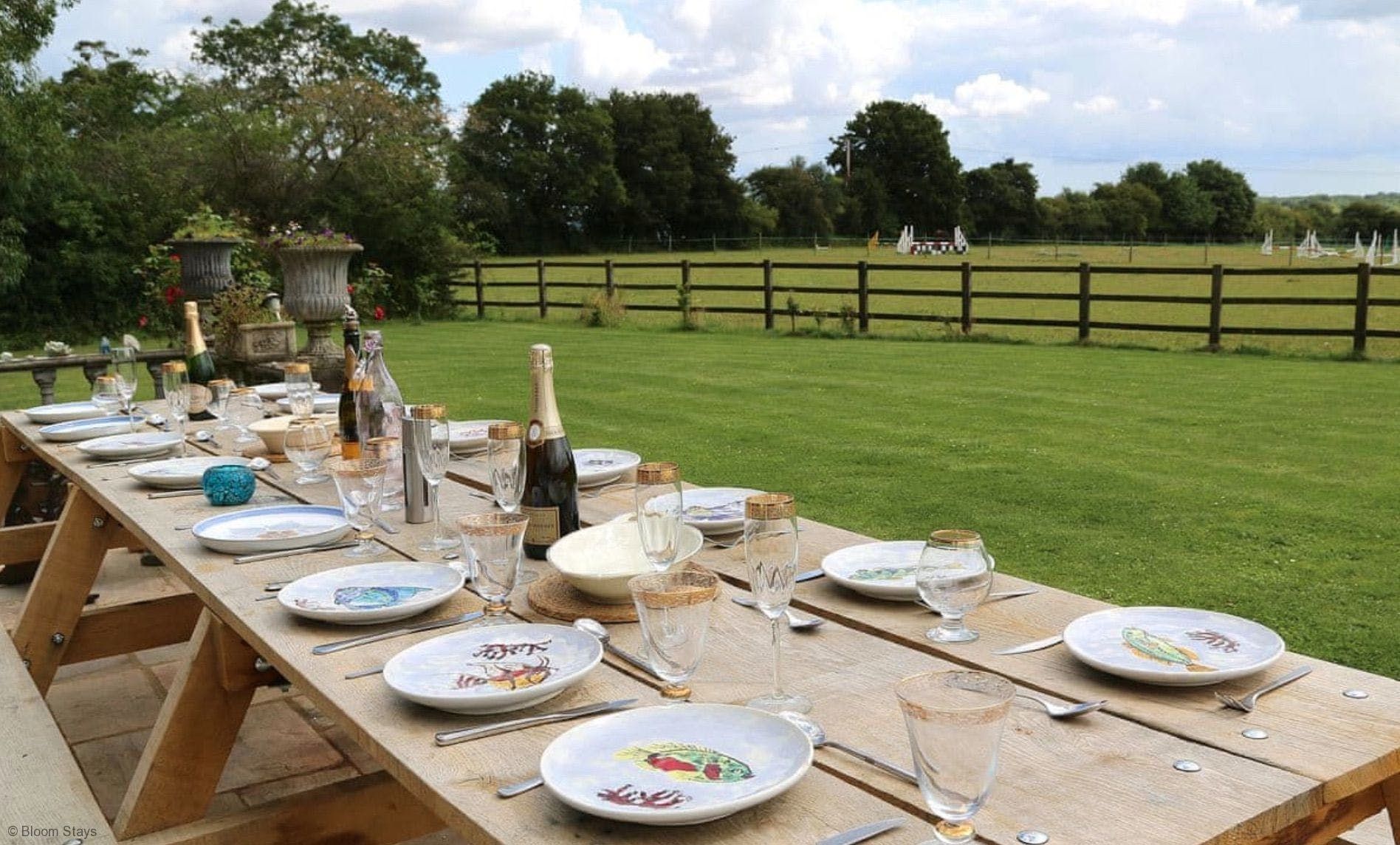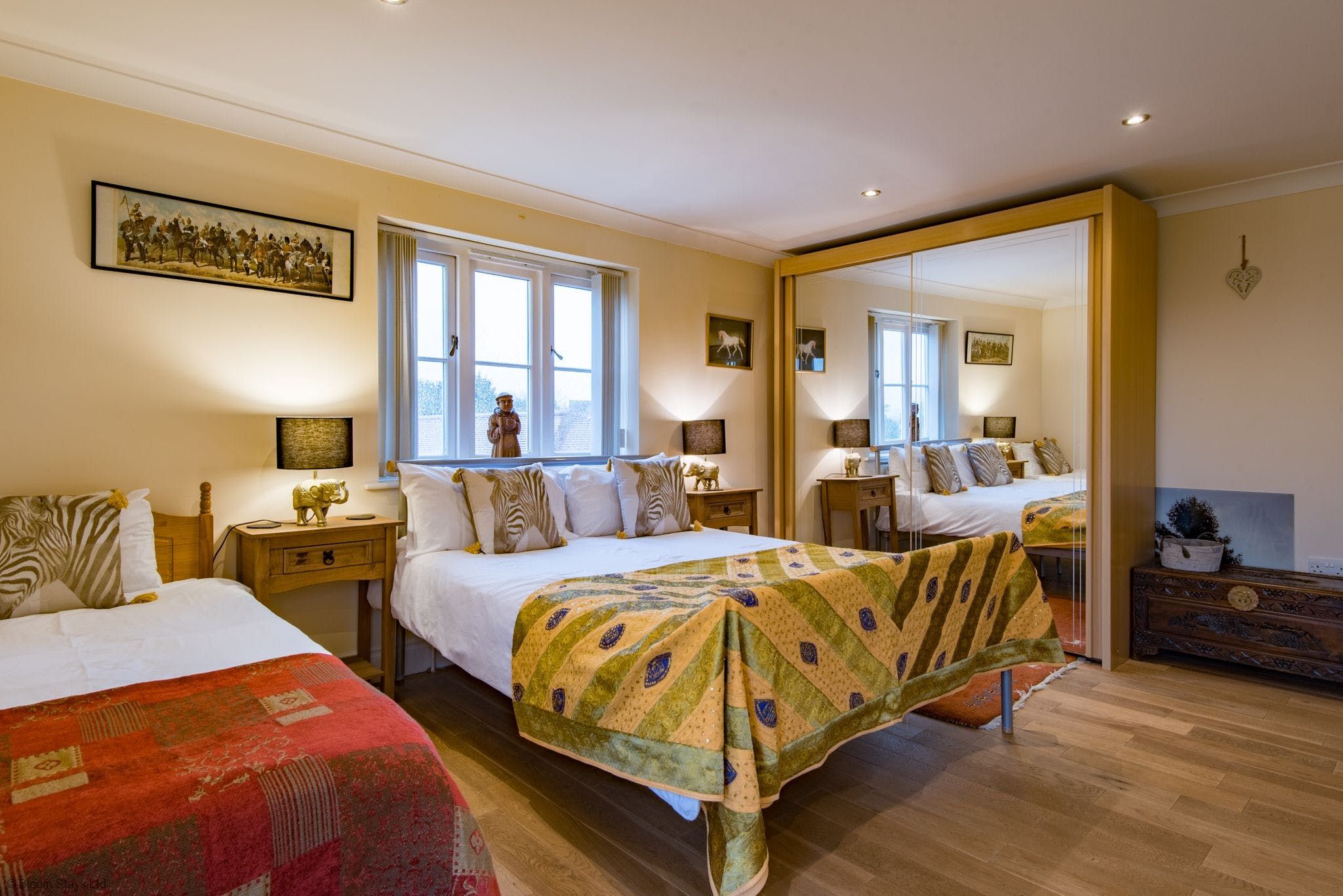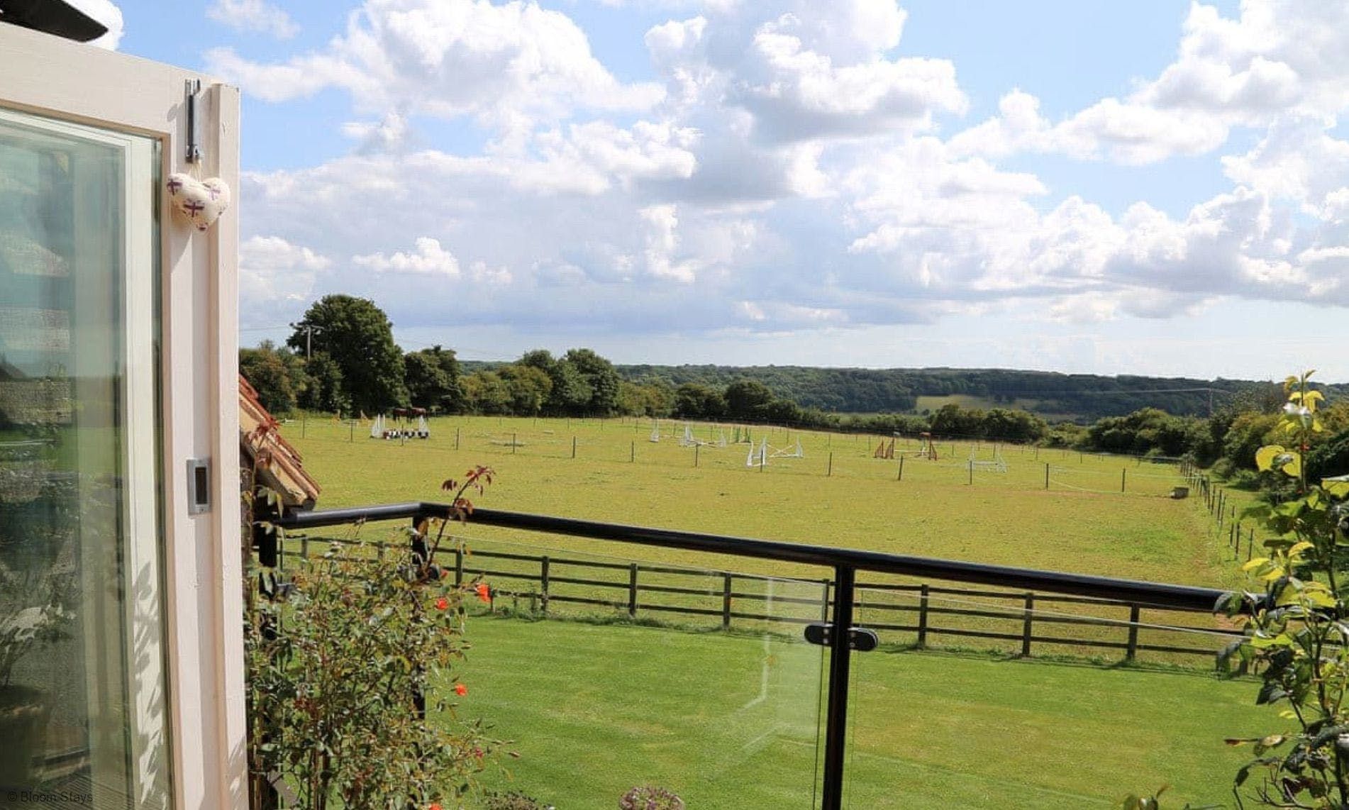 This home is situated in the rural English countryside, and you'll love the view of the accompanying fields with a paddock and stables on-site. Although horse riding isn't allowed, you can still pet the horses and there's a riding school just a short 2km away. The home consists of a main house and a converted barn, so it’s perfect for a large group or family wanting to sprawl out and enjoy the country air. There are plenty of outdoor areas here, and you'll also find some quaint local pubs in the nearby village less than 2km away, while the nearest shops are 7km from the home.