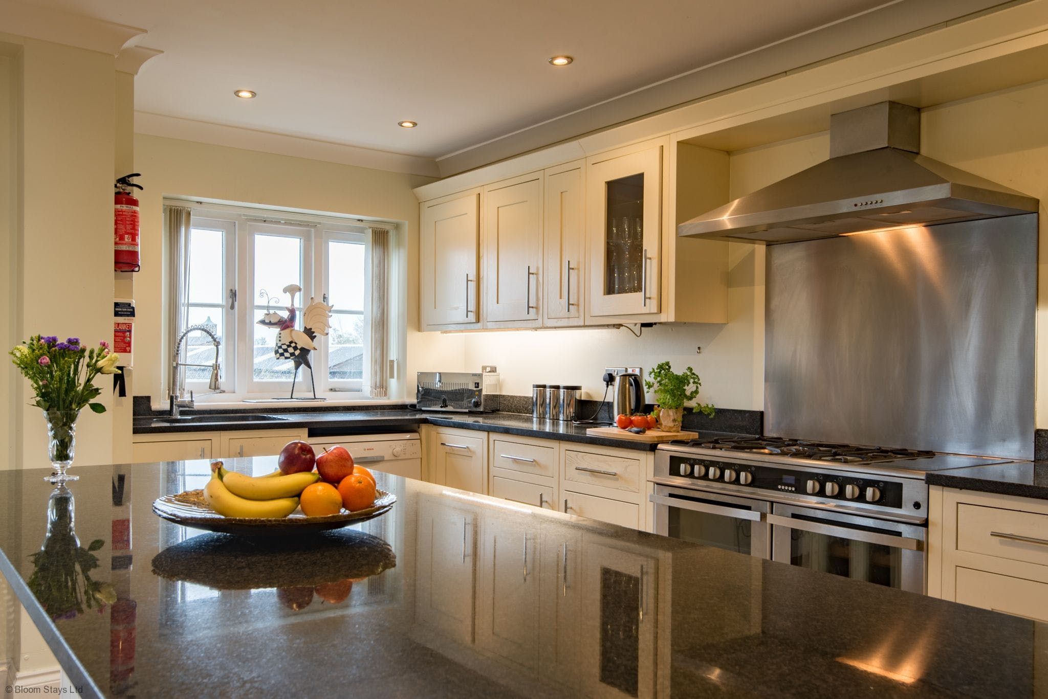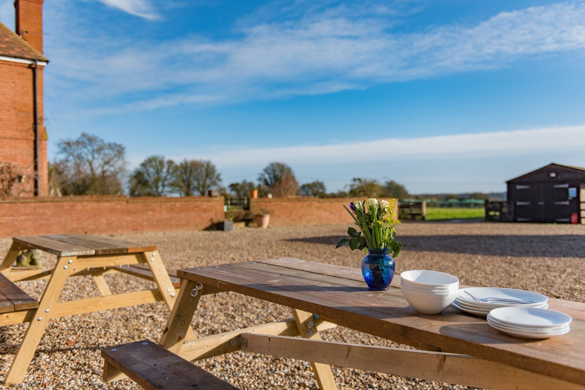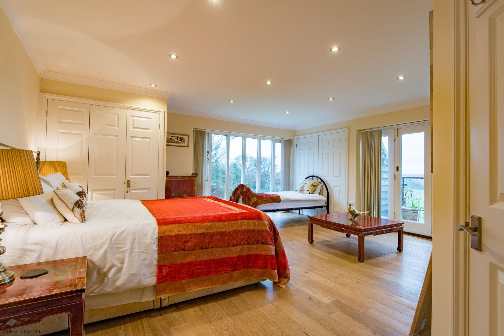 This home is situated in the rural English countryside, and you'll love the view of the accompanying fields with a paddock and stables on-site. Although horse riding isn't allowed, you can still pet the horses and there's a riding school just a short 2km away. The home consists of a main house and a converted barn, so it’s perfect for a large group or family wanting to sprawl out and enjoy the country air. There are plenty of outdoor areas here, and you'll also find some quaint local pubs in the nearby village less than 2km away, while the nearest shops are 7km from the home.