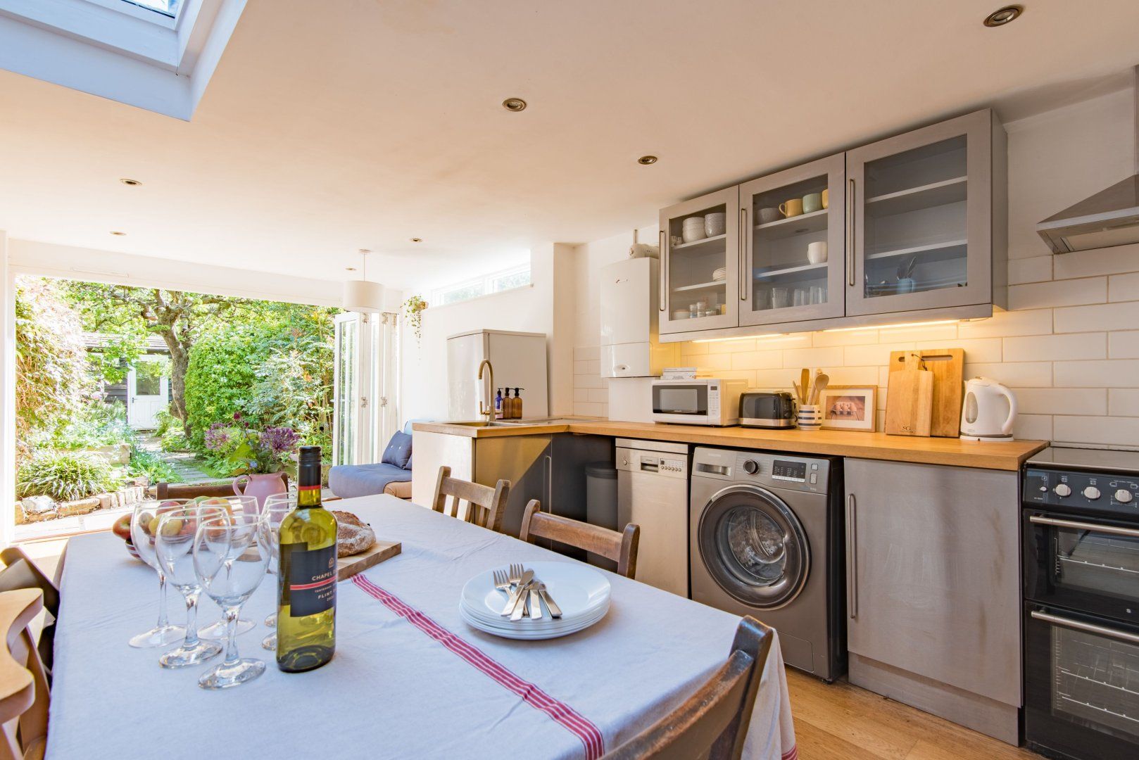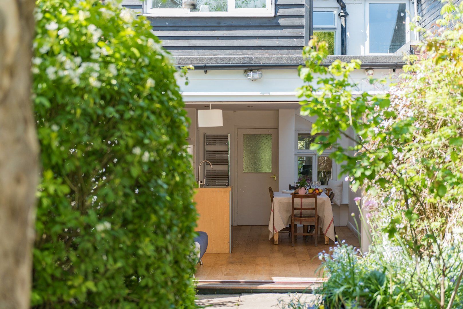 On the ground floor, there's a cosy sitting room, plus a large open-plan kitchen and dining room that opens out onto a pretty cottage garden via retractable bifold doors, creating a large sociable space that spans inside and out. Head upstairs and you'll catch tantalising glimpses of the sea from the bedrooms on the first and second floors.