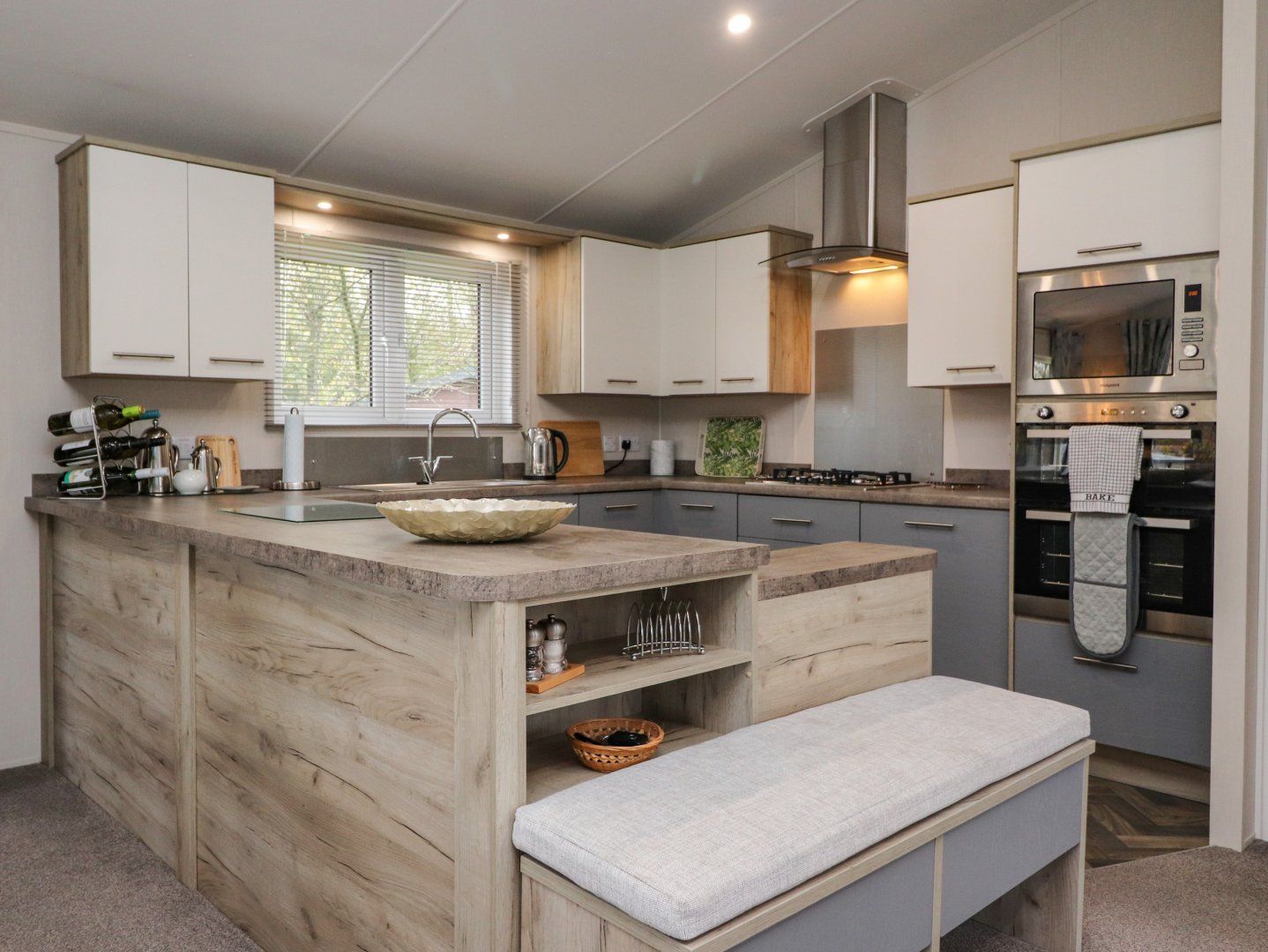 Central heating. Double gas oven and hob, microwave, fridge, freezer and dishwasher. 4 x Smart TVs, WiFi. Fuel and power inc. in rent. Bed linen and towels inc. in rent. Off-road parking for 1 car. Private wraparound decking with furniture. Sorry, no smoking. Supermarket 1.8 miles, pub 0.4 miles, lake 0.1 miles. Note: There are steps up to the exterior of the property