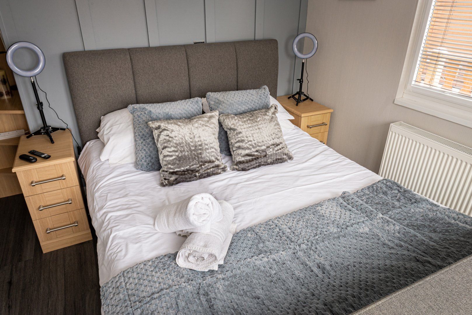 Central heating with electric fire. Electric oven and gas hob, microwave, fridge/freezer, washing machine, and dishwasher. 60" TV, 2 x pop-up TV, WiFi. Fuel and power inc. in rent. Bed linen and towels inc. in rent. Off-road parking for 2 cars. Decking with furniture. There is a bar and restaurant on site. There is an indoor heated swimming pool on site (charges to the site may apply). There is a gym and spa treatment centre. Watersports are allowed on the lake, including kayaking, windsurfing, and fishing. There is a zip wire at the site next door to Lakeland Lodge for water skiing. Sorry, no smoking. Shop 2.2 miles, pub 0.1 miles. Note: The dining table can be converted to a pool table or ping pong table. Note Watersports and fishing are allowed on the lake. Note: Two well-behaved dogs welcome