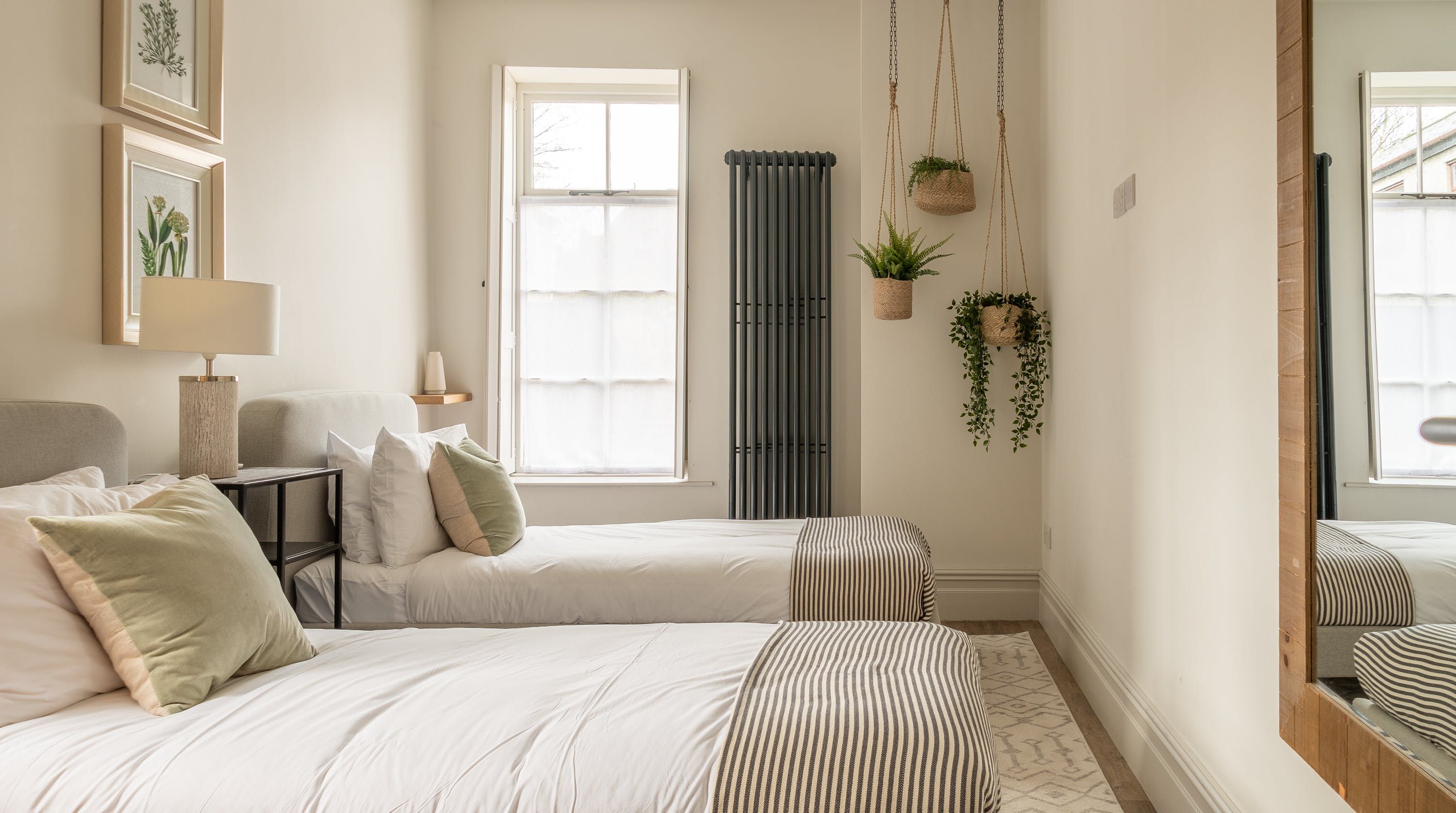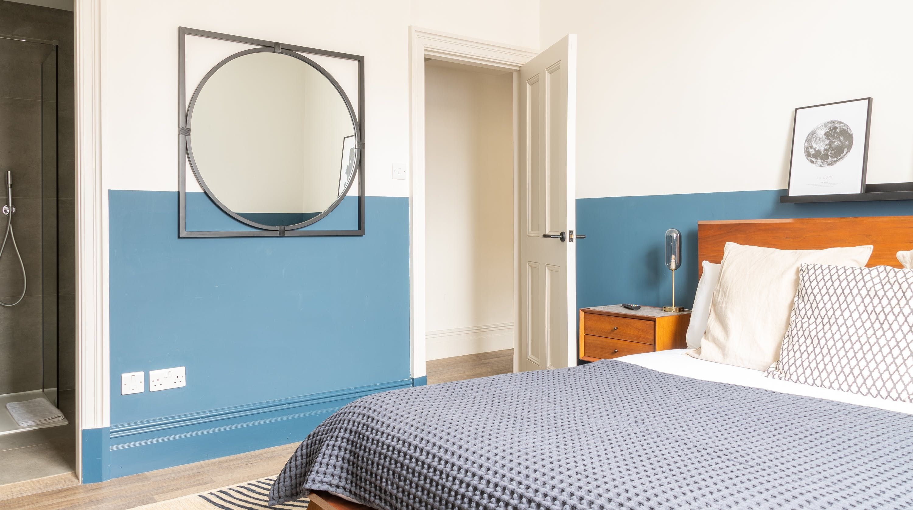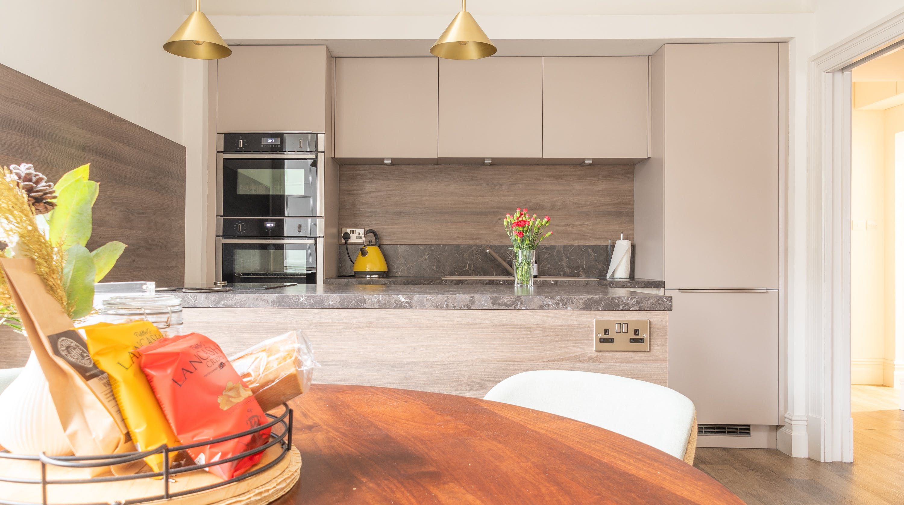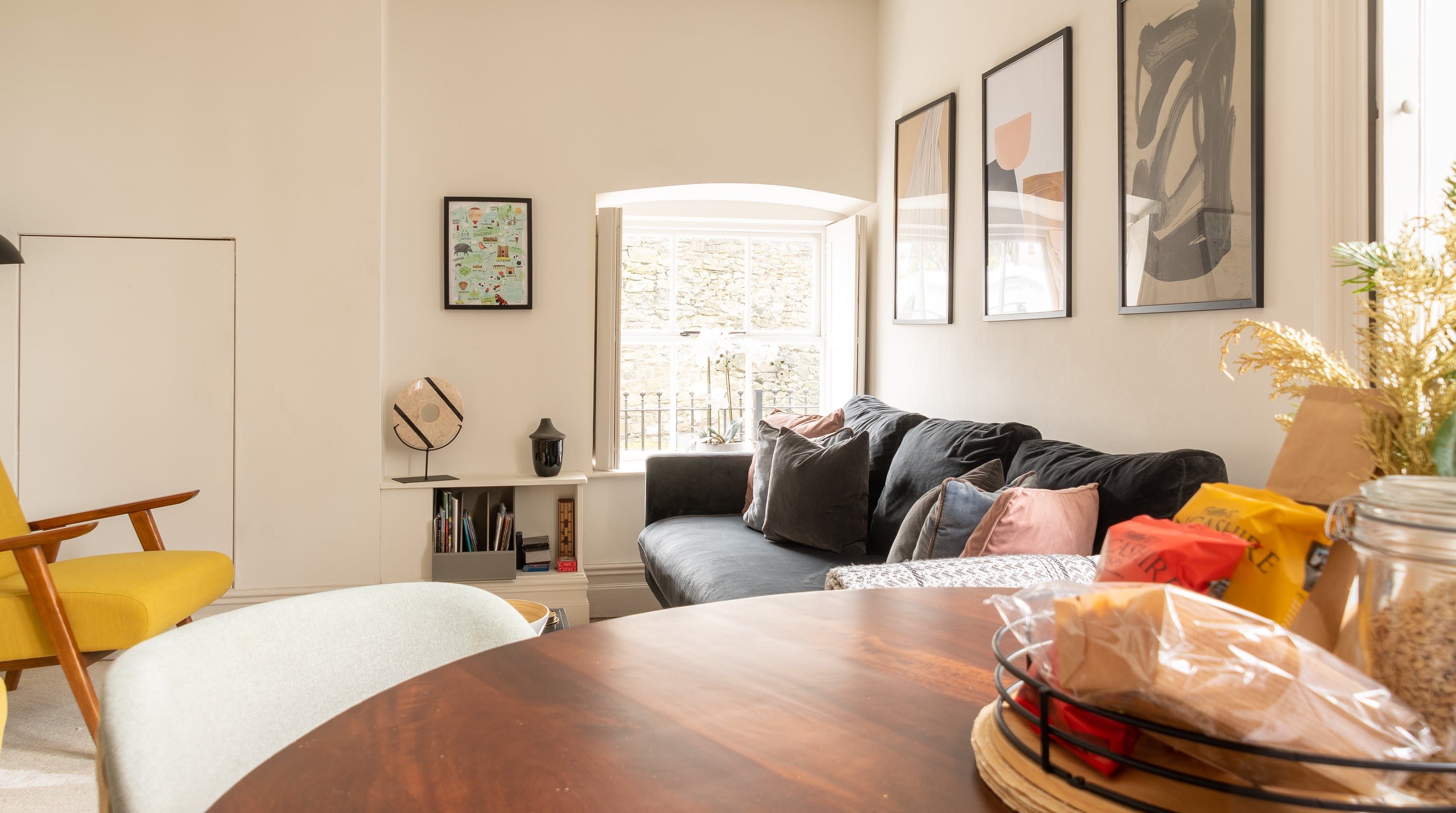 Housed within a restored Grade II listed Georgian building in Clitheroe, this elegant ground floor apartment puts you in an ideal spot to explore the Lancashire countryside, including the Ribble Valley and the enchanting Forest of Bowland. With its sophisticated contemporary decor and open-plan living space, this chic home is all set to cater to your relaxation. We love the plump blue sofa beside the pretty shuttered picture window, as well as the modern abstract art that gives the room plenty of stylish character. The sleek kitchen invites warming homecooked meals to be enjoyed at the beautiful round table, while both bedrooms have been carefully curated to ensure you get a tranquil night’s sleep. With a shared courtyard garden to enjoy – whether in the morning over coffee or the evenings with a sunset glass of bubbly – you’ve got everything you need for a comfortable stay. Outside of your home, the ancient ruins of Clitheroe Castle are a three-minute walk away, while the Forest of Bowland is a five-minute drive (or just under forty minutes away on foot). Factor in the walks along the River Ribble and the charming shops and pubs right on your front door, and there’s no end to the enjoyment this perfectly positioned home provides.