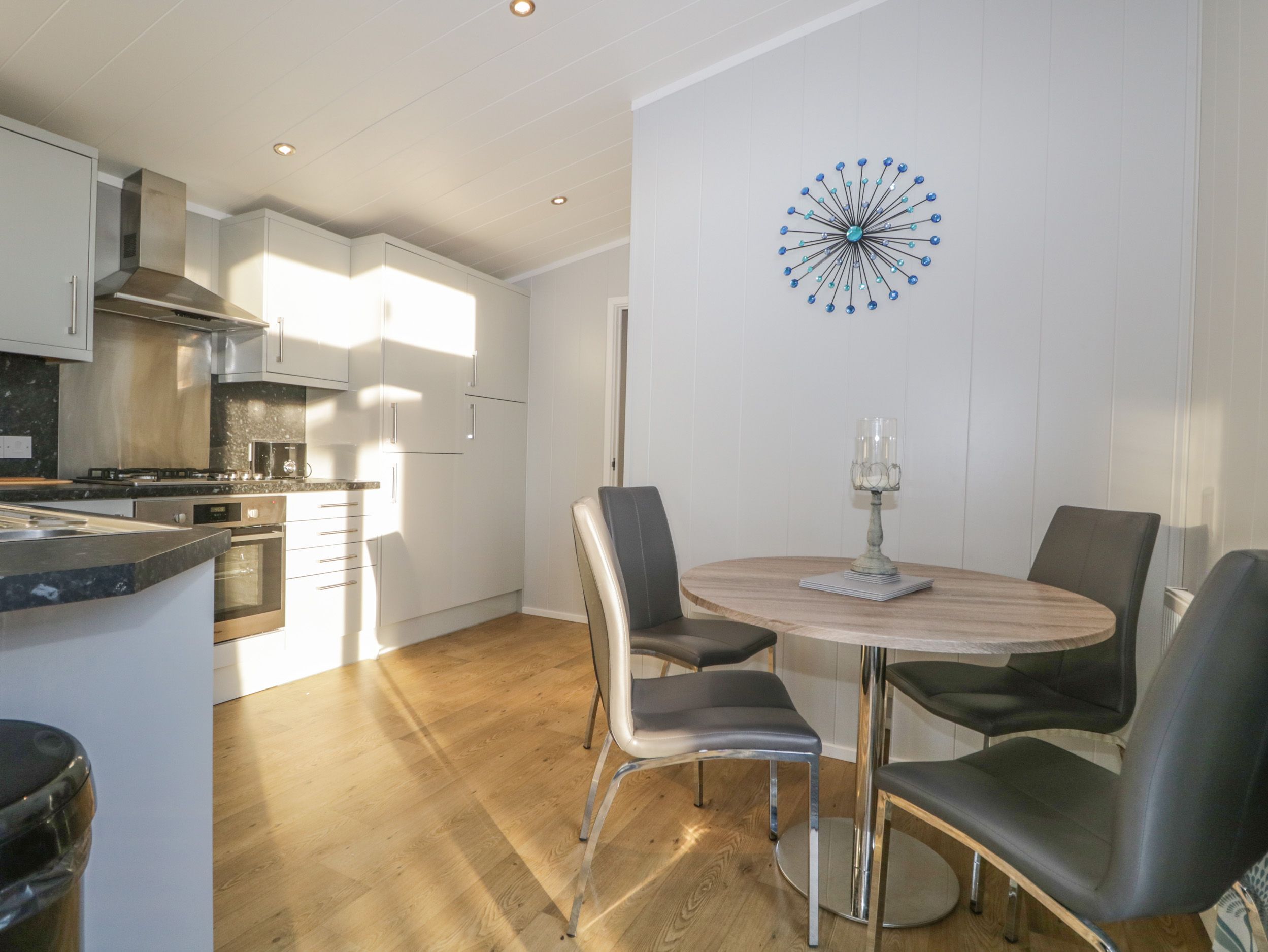 Holiday home The living areas in the property consist of an open-plan living space with a kitchen hosting an electric oven, gas hob, fridge/freezer, washing machine, a dining area with seating for four people and a sitting area with a TV. The bedrooms consist of a king-size with an en-suite cloakroom, and a twin, along with a shower room. Outside, there is rear decking with furniture and off-road parking for two cars. Within 1.1 miles, you will find a shop and within 0.2 miles, you will find an on-site pub, and please note that this is a non-smoking property. Sorry, no stag, hen or similar parties. One well-behaved dog is welcome here. WiFi, fuel, power, bed linen and towels are all included in the cost. A highchair and travel cot are also available. Choose Lily's Lodge for a well-earned, relaxing stay with your loved ones. Note: The rear decking is not enclosed, please consider this when booking. Note: Guests have access to several leisure facilities within South Lakeland Leisure Village, such as: Bar/restaurant, cafe, picnic area, fishing, swimming pool and a gym.