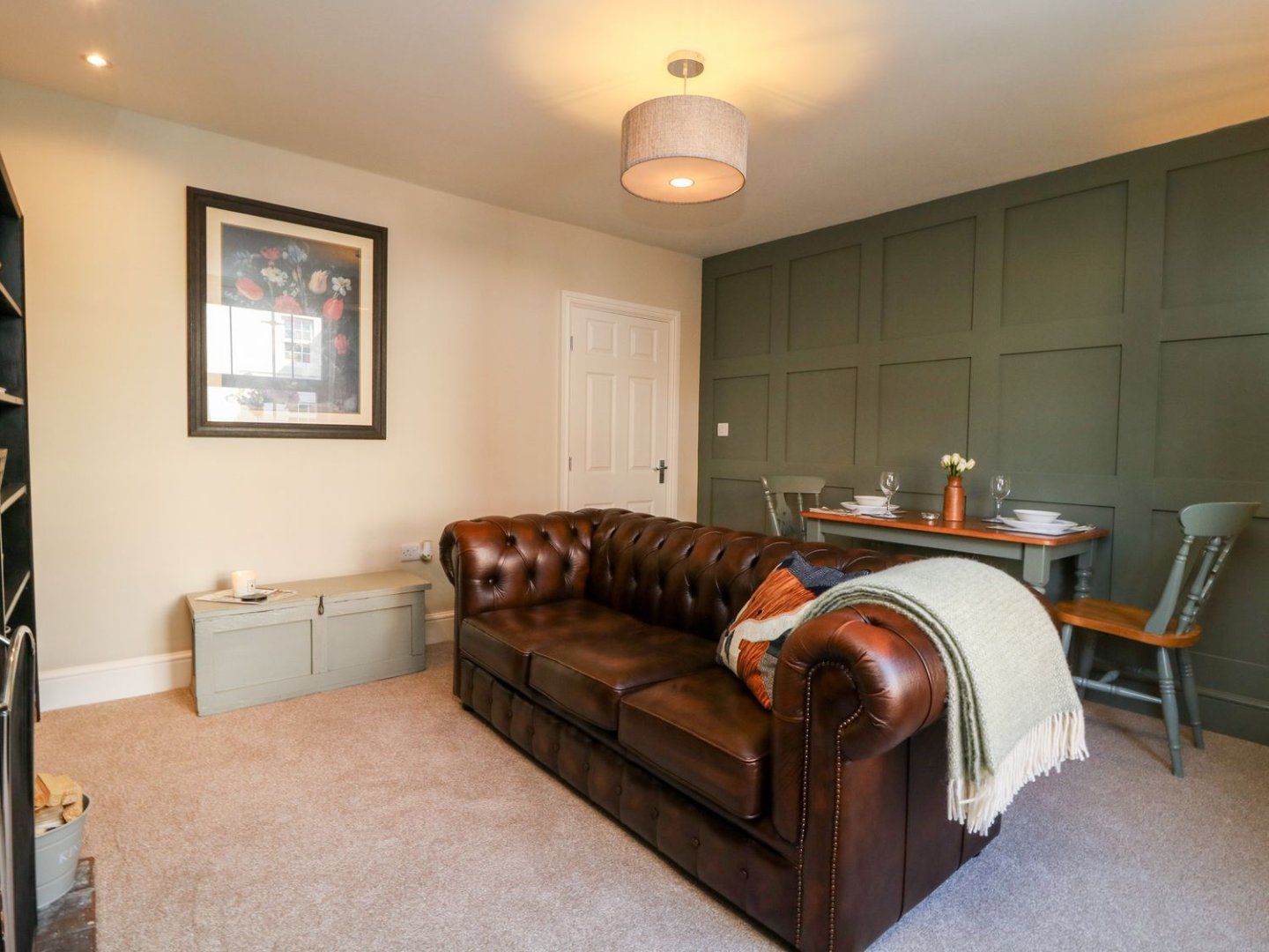 Ground-floor apartment. One double bedroom with Smart TV. Shower room with walk-in shower, basin, heated towel rail and WC. Kitchen. Living/dining room with woodburning stove