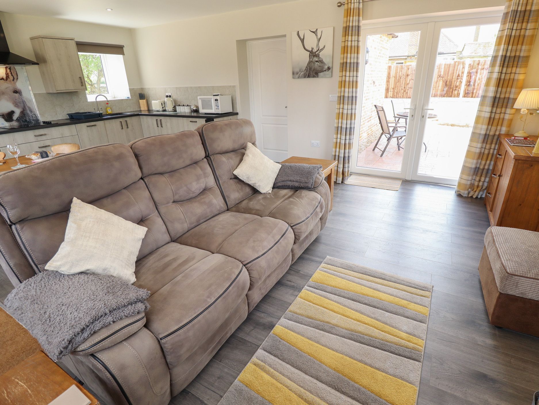 Accomodation Details Single-storey. One King-size bedroom with Freeview TV and en-suite walk-in shower, basin and WC. Open-plan living space with kitchen, dining area and sitting area. Enclosed outdoor area for dog.