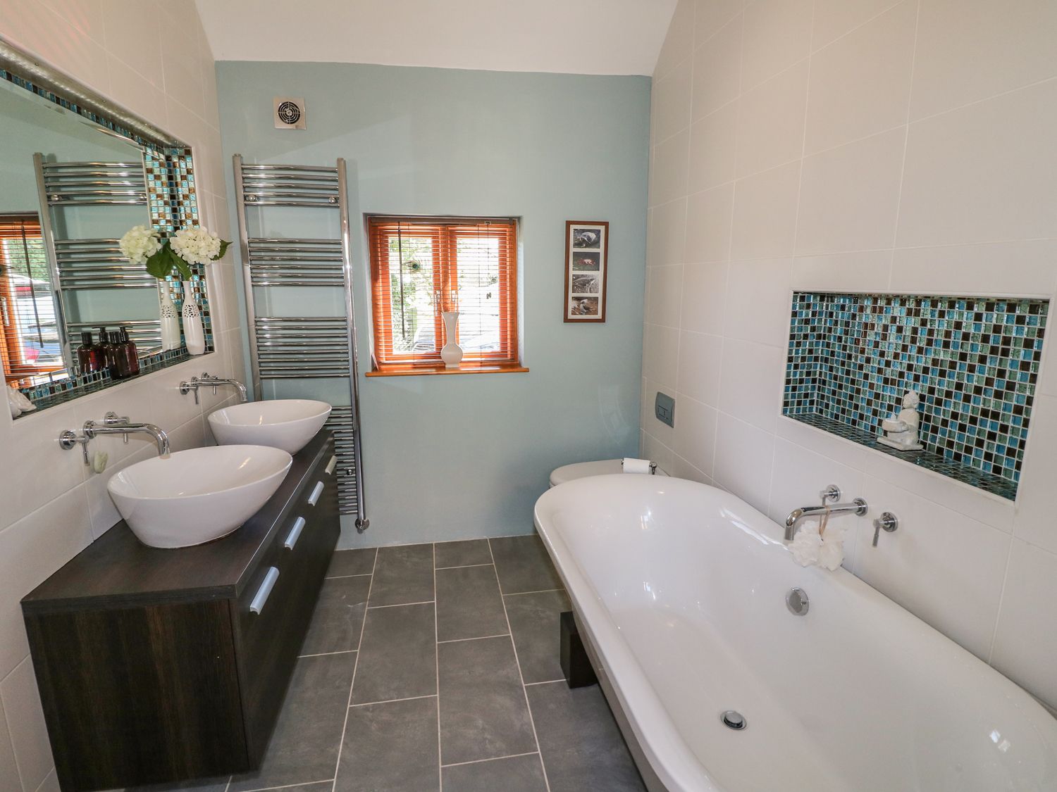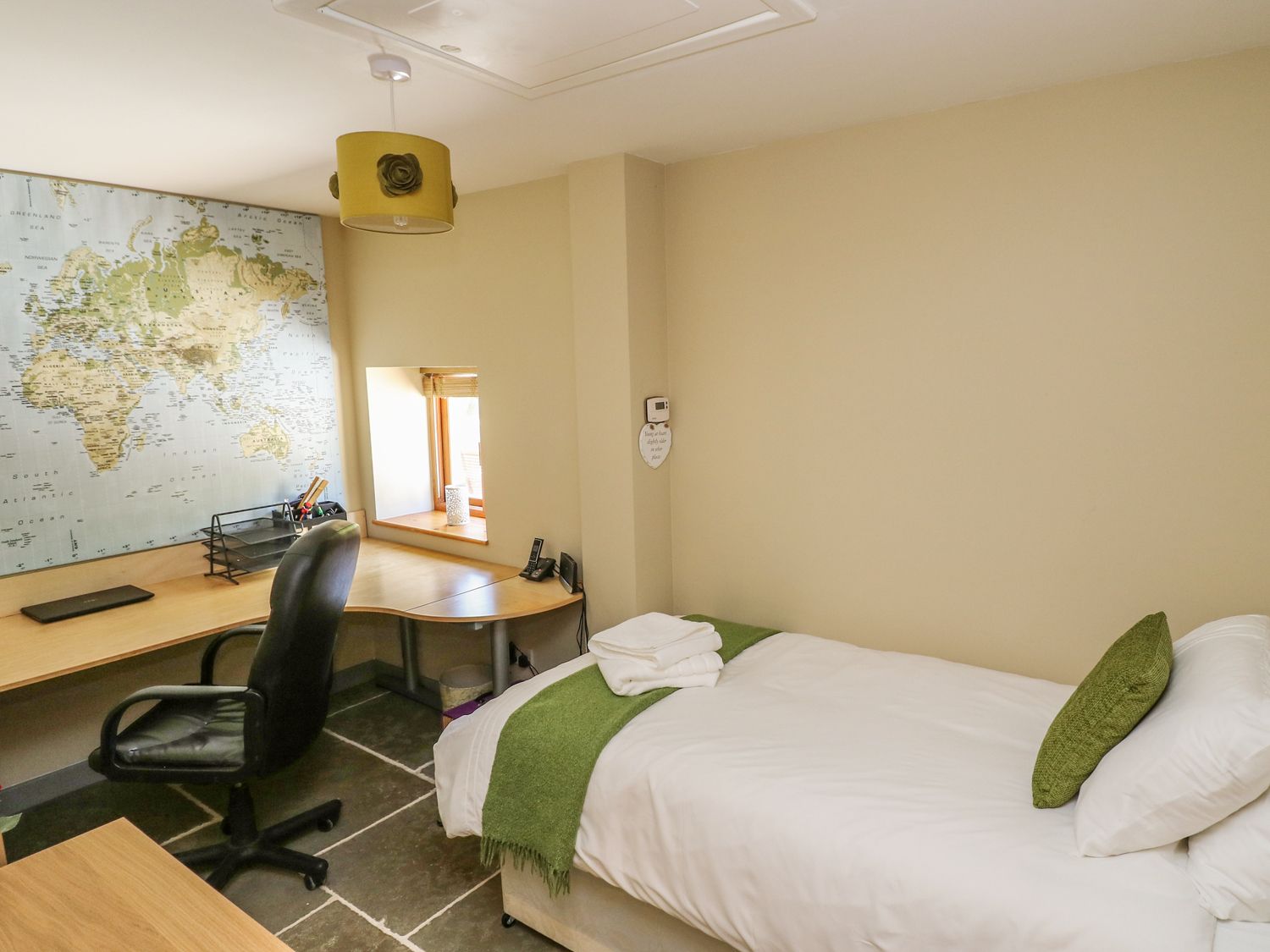 Accomodation Details Four bedrooms: 1 x super-king-size with en-suite shower, basin and WC, 1 x ground-floor double, 1 x ground-floor twin, 1 x ground-floor single. Ground-floor bathroom with bath, shower, basin and WC. Kitchen with breakfast bar. Dining room with woodburning stove. Sitting room